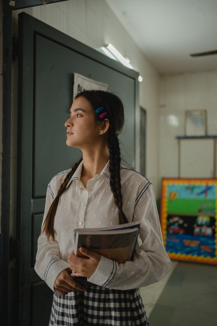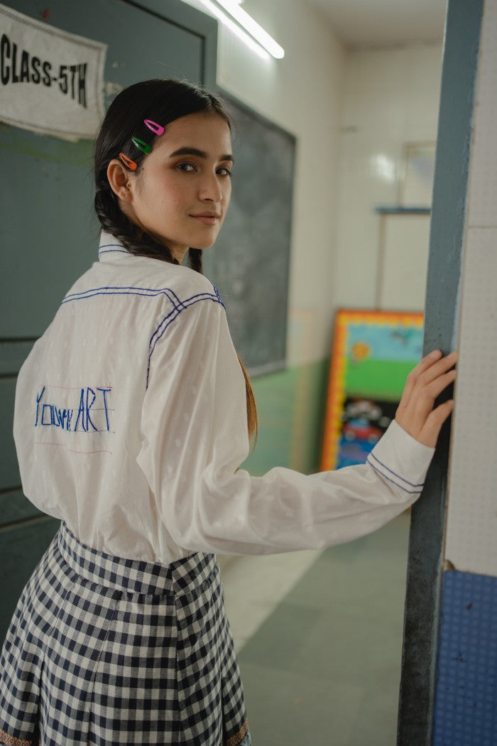 Featuring Art shirt in extremely light weight dobby weave with chain stitch detail. Enhanced with hand-embroidery typography "You are Art" at the back, adding an extra element of inspiration and motivation.