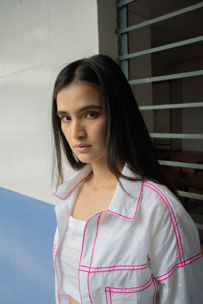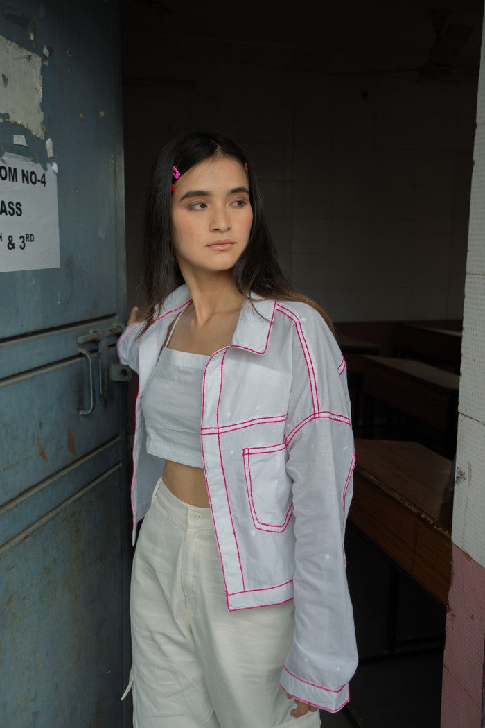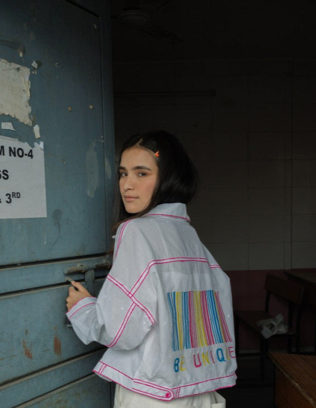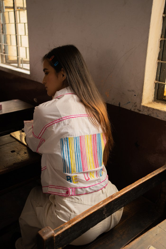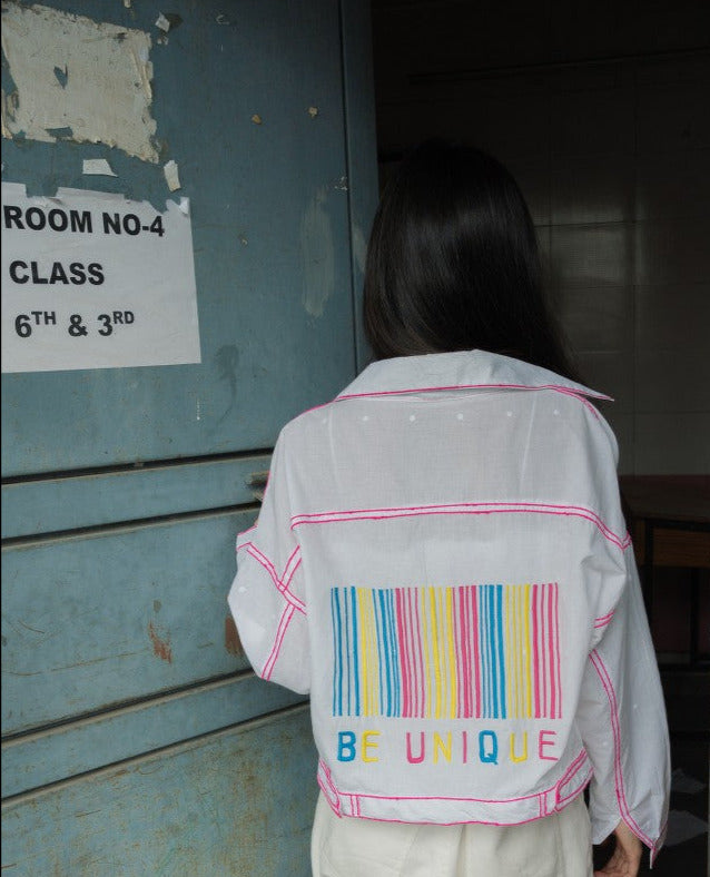 Swaroop Exclusive Collection. Featuring a front open jacket enhanced with embroidery at the back with contrasting chain stitches all over.Crafted in a comfortable fit. Wear it and flaunt it a little bit everywhere you go.