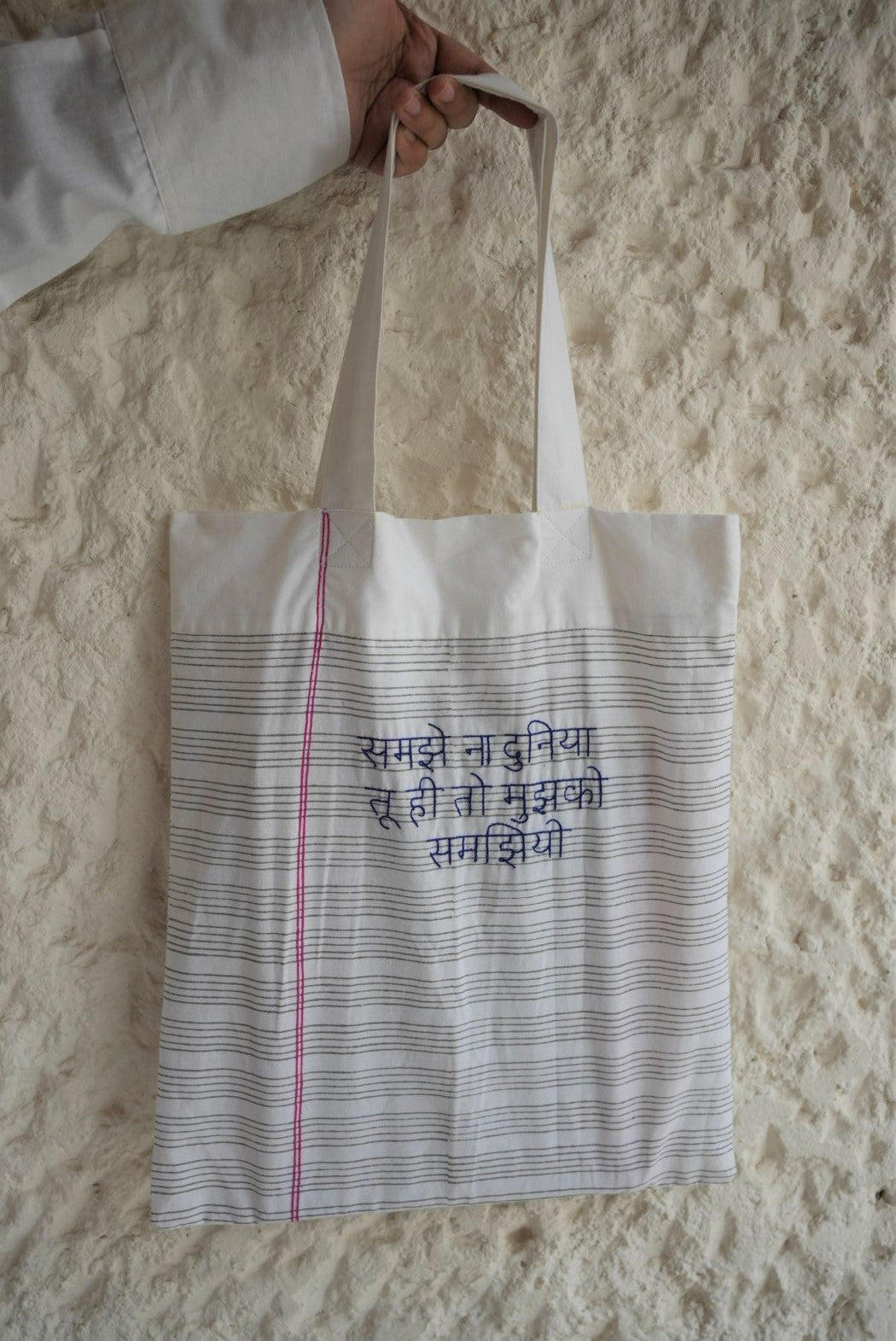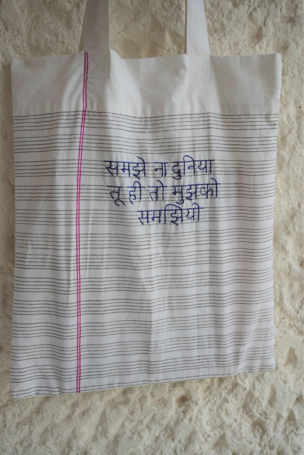 Swaroop Exclusive Collection. Featuring "Duster Tote Bag" enhanced with hand-embroidered text and block-printed Hindi print. Made with cotton fabric.