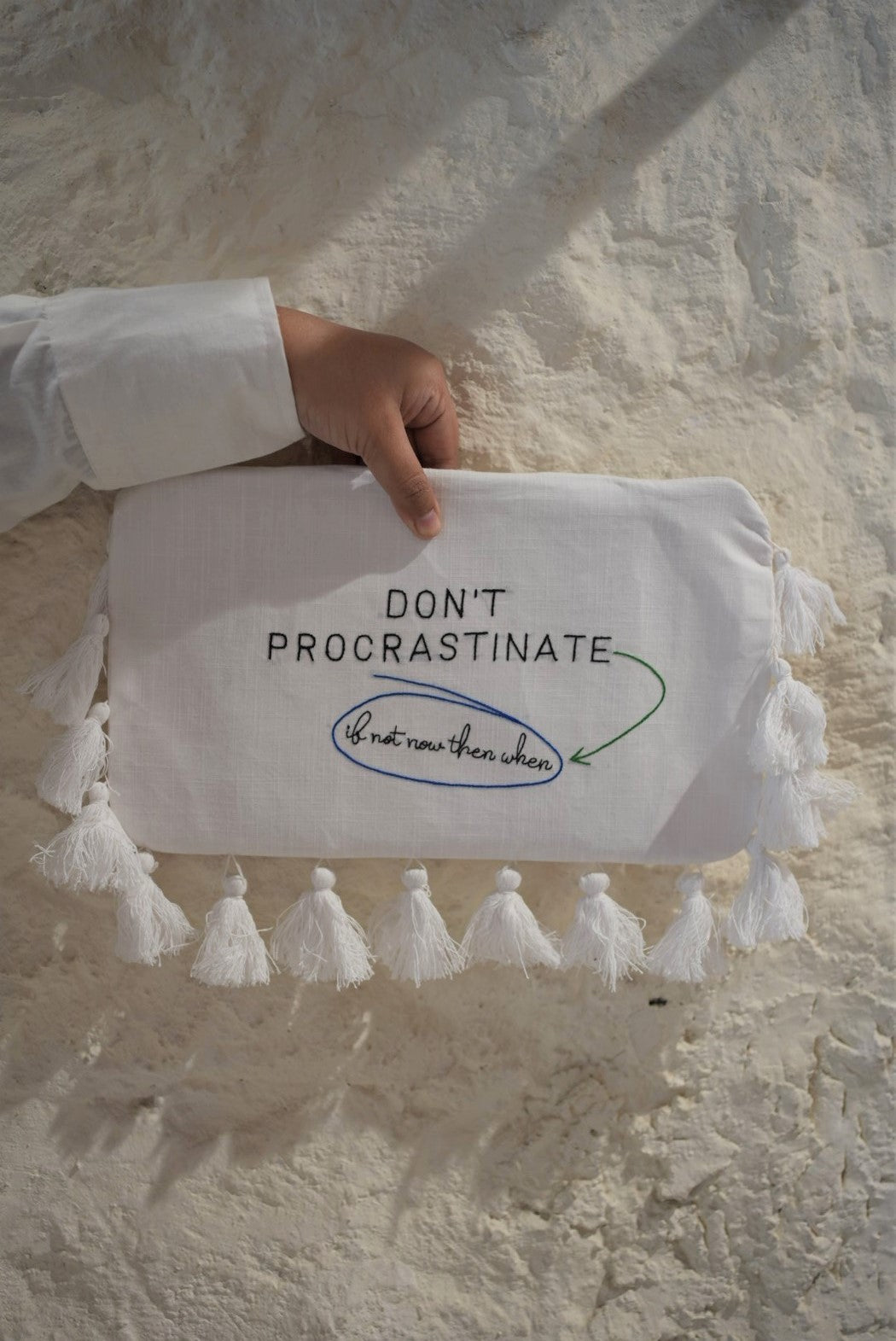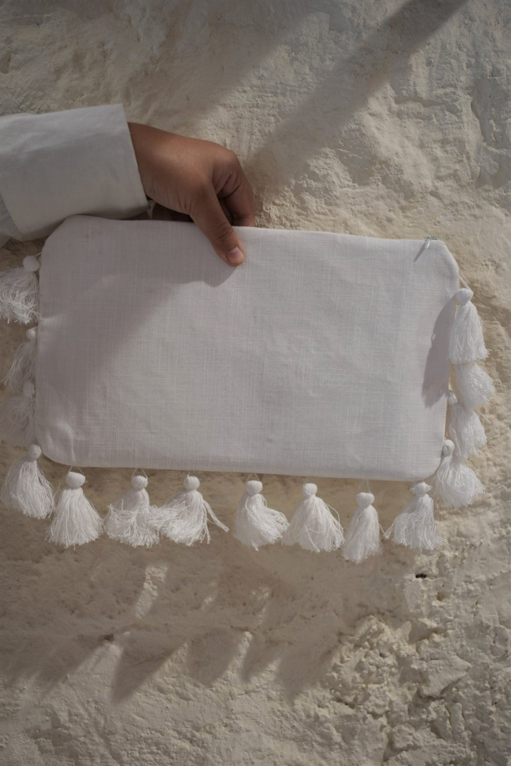 Swaroop Exclusive Collection. Handwriting Pouch will remind you not to procrastinate. Enhanced with all-over side tassels and metal brass zipper. The pouch is lightweight and compact, making it easy to carry with you wherever you go.