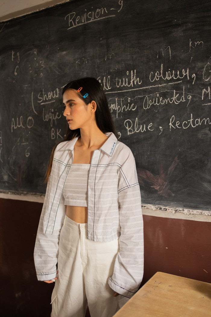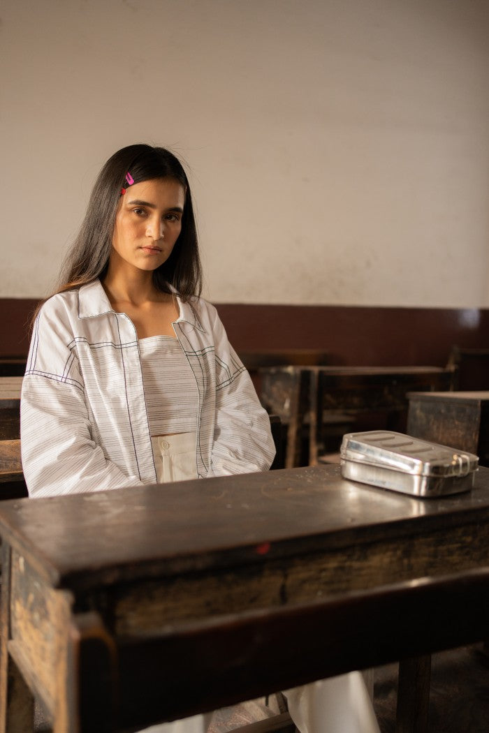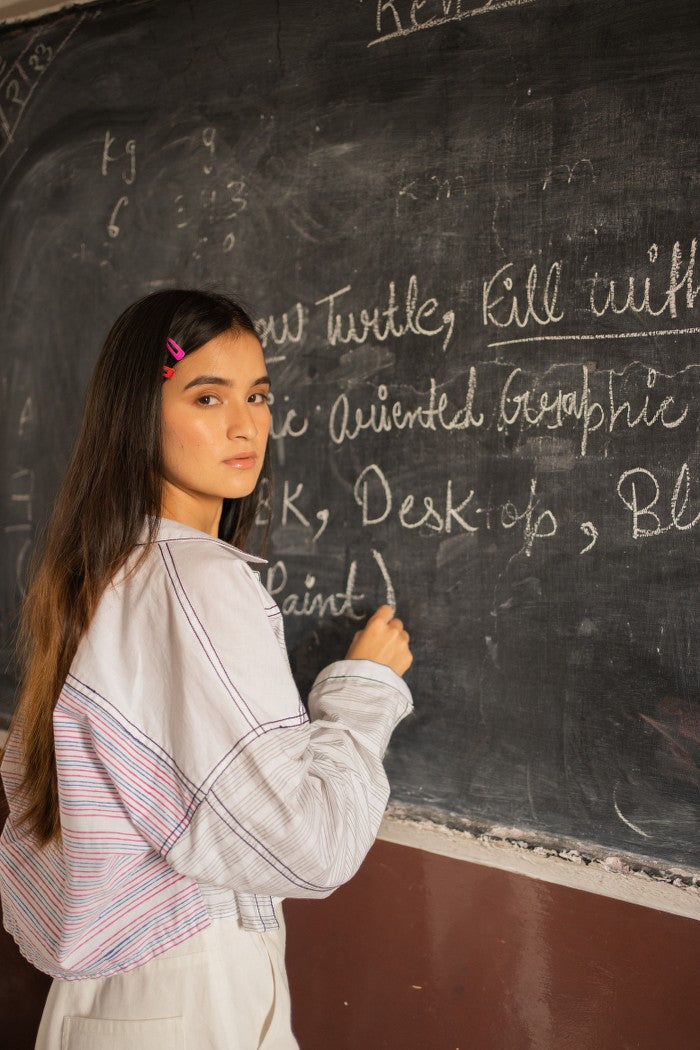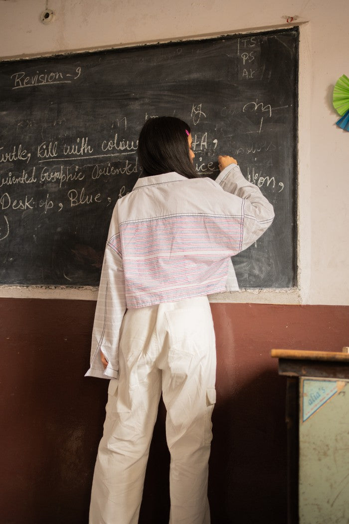 Swaroop Exclusive Collection. Featuring Sharpener Jacket inspired from Hindi and English notebooks. It is an open cotton jacket with chain stitch detail. Signature "You are art" embroidery will definitely catch your eye on it.