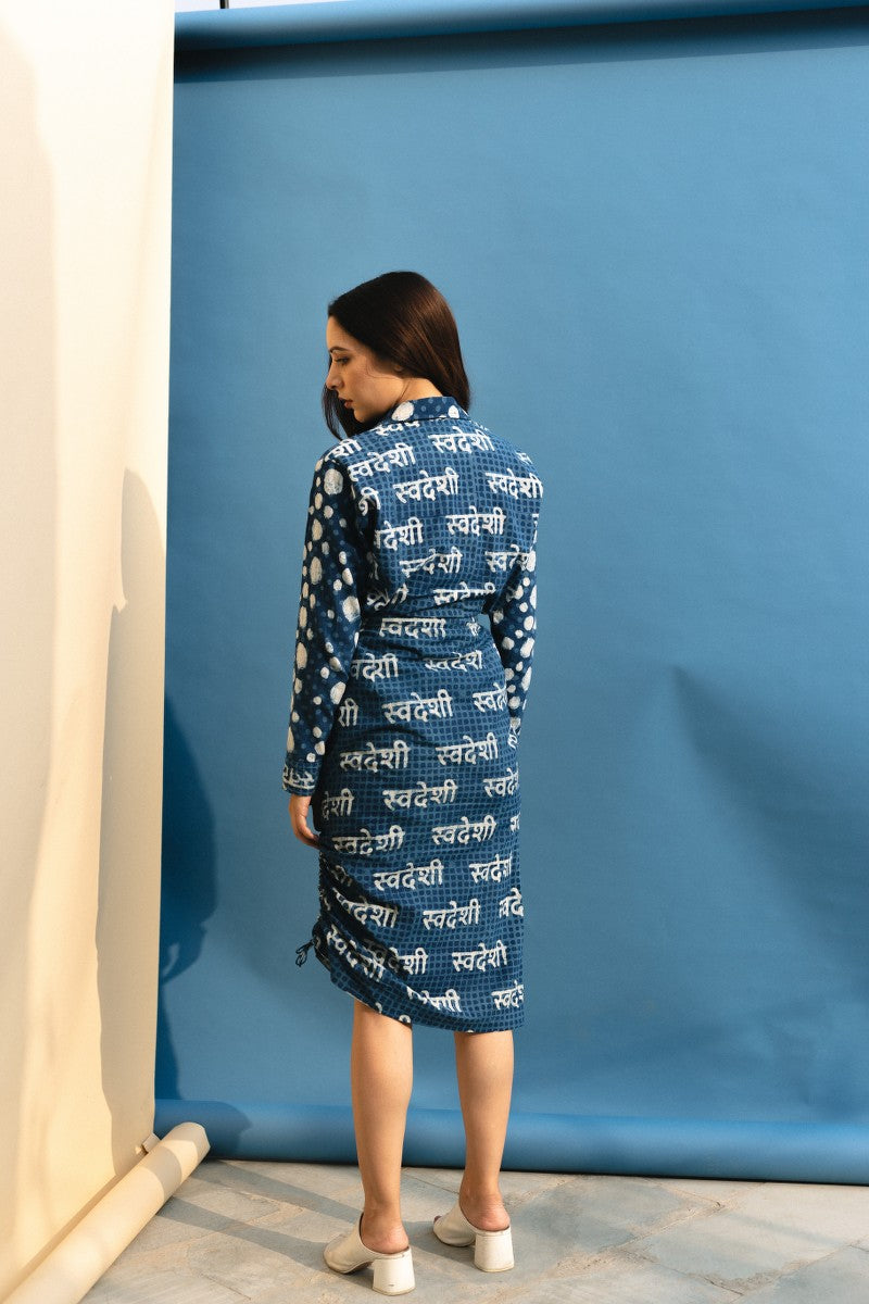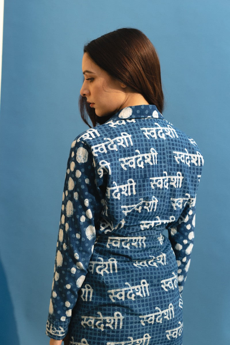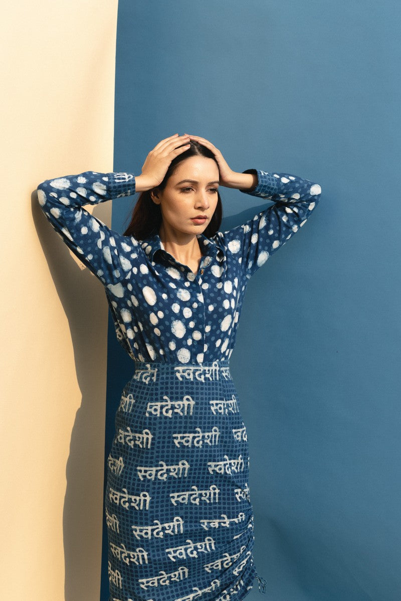 Swaroop Exclusive Design. Featuring an indigo dabu printed shirt with polka dot front panel and स्वदेशी back panel in cotton base.