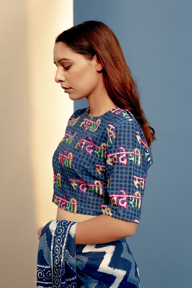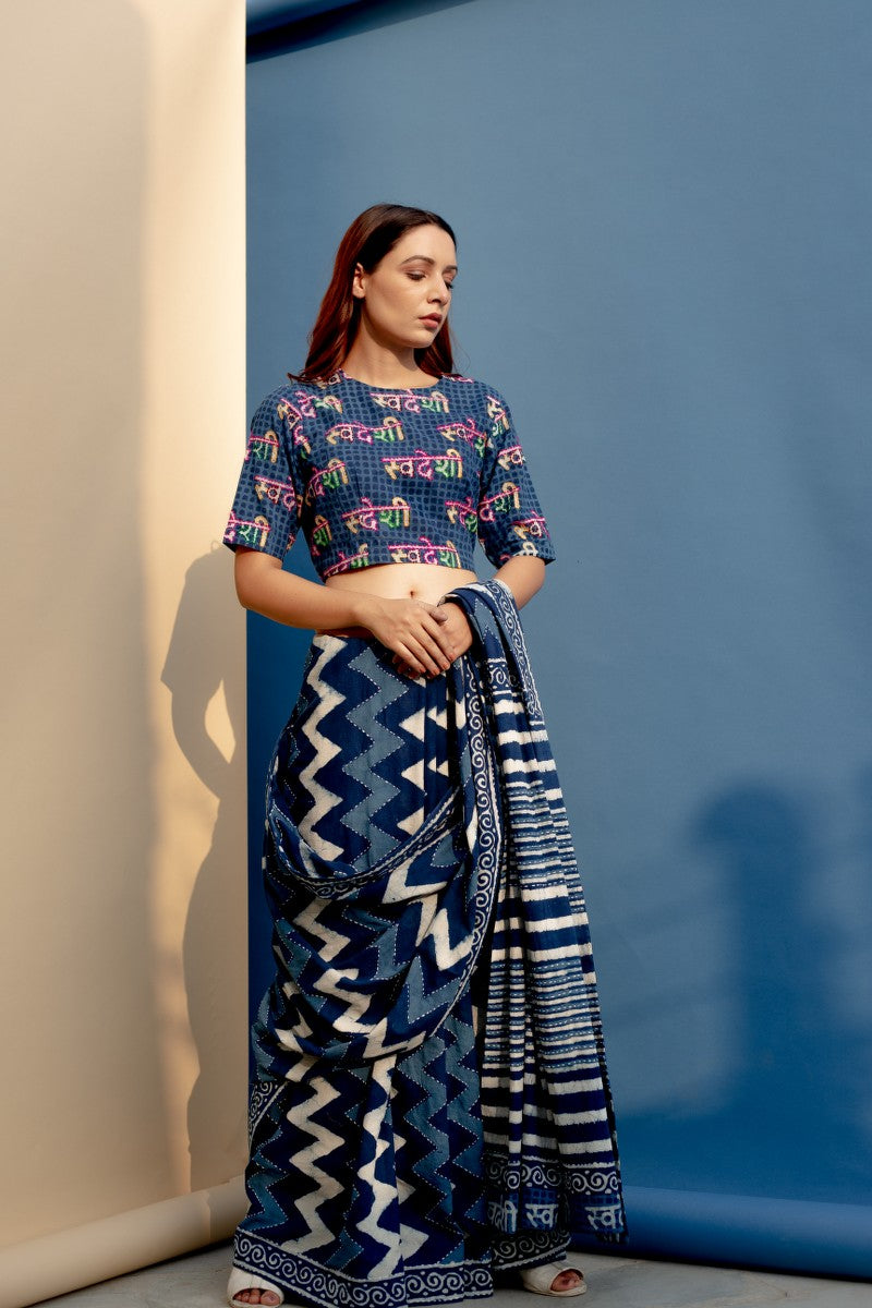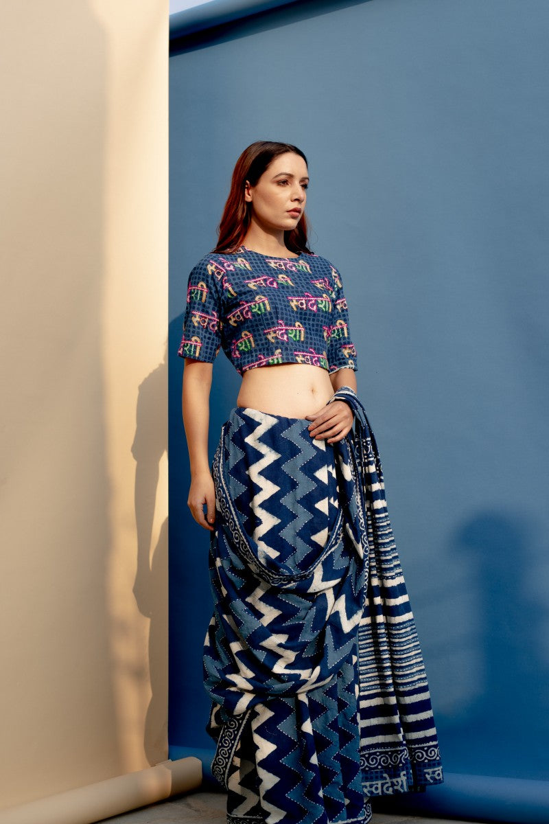 Swaroop Exclusive design. Featuring a zero neck blouse in our signature स्वदेशी block print in cotton base, enhanced with kantha embroidery.
