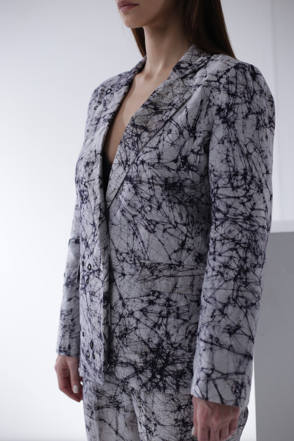Swaroop Exclusive Design. Wabi- Sabi Blazer is a marriage between Indian textile and modern silhouette. The Fabric of the Blazer is hand printed in Gujarat using traditional technique of Batik. The blazer is in tailored fit. Embellished with hand embroidered mirror work all over. Paired with straight fit pants.