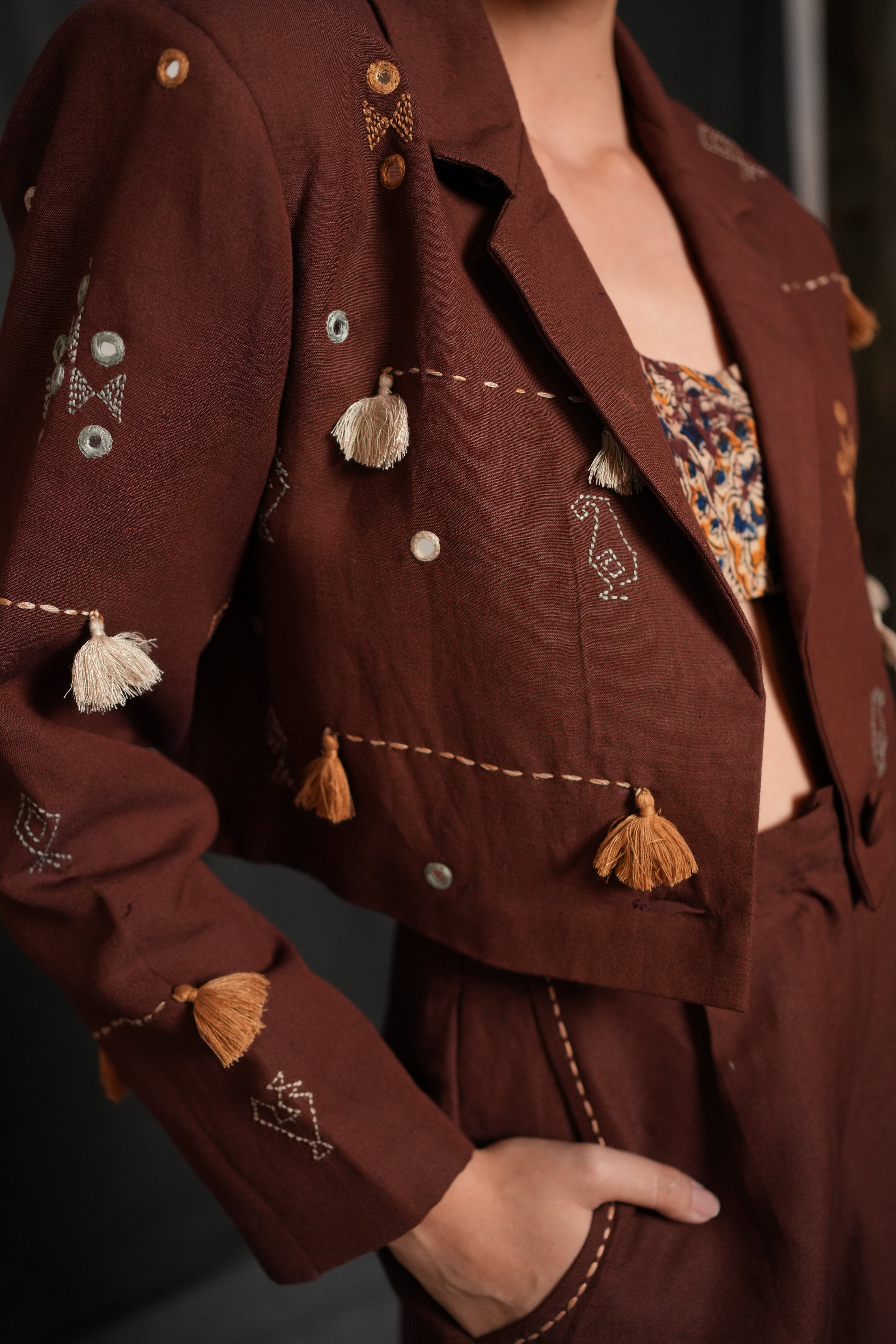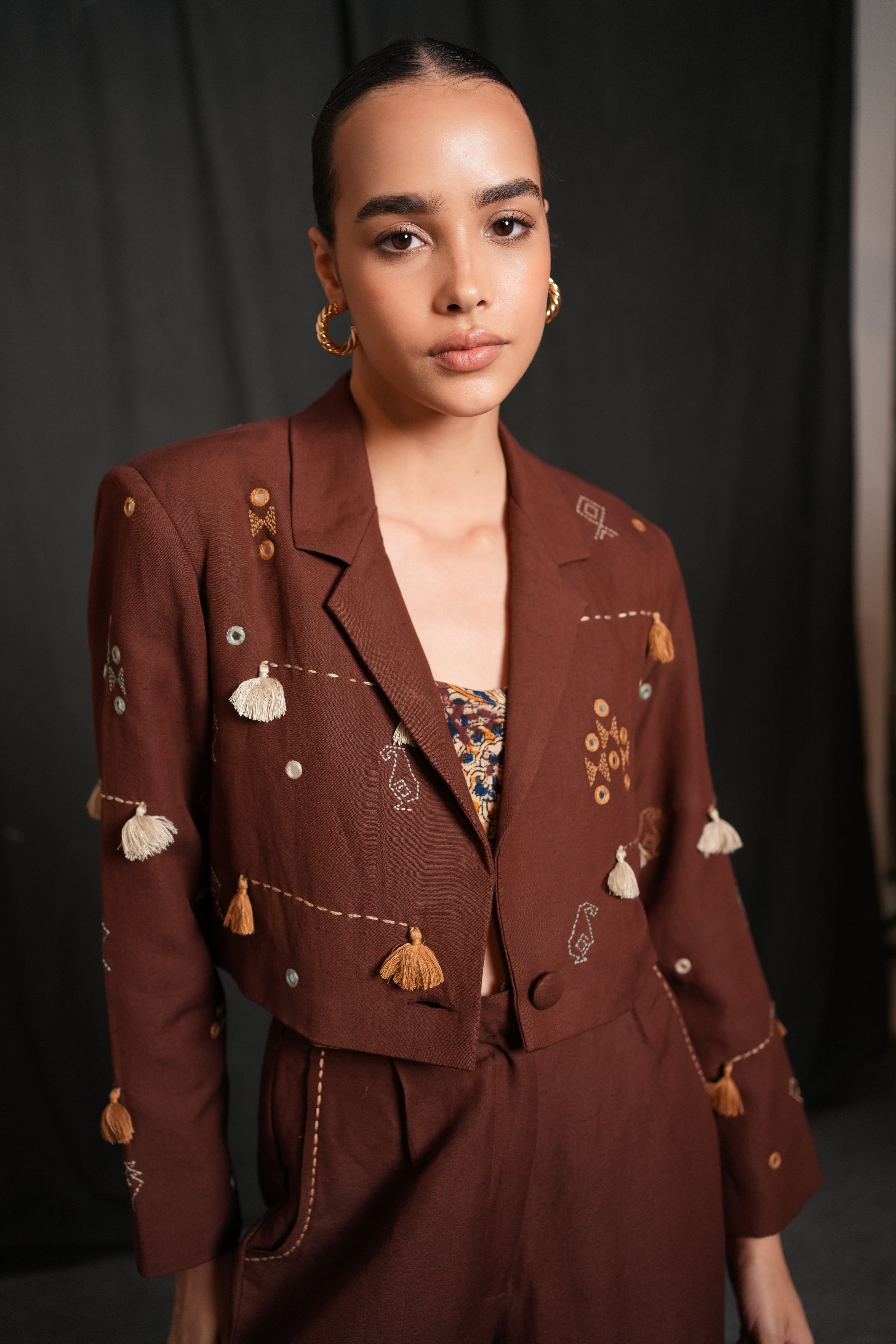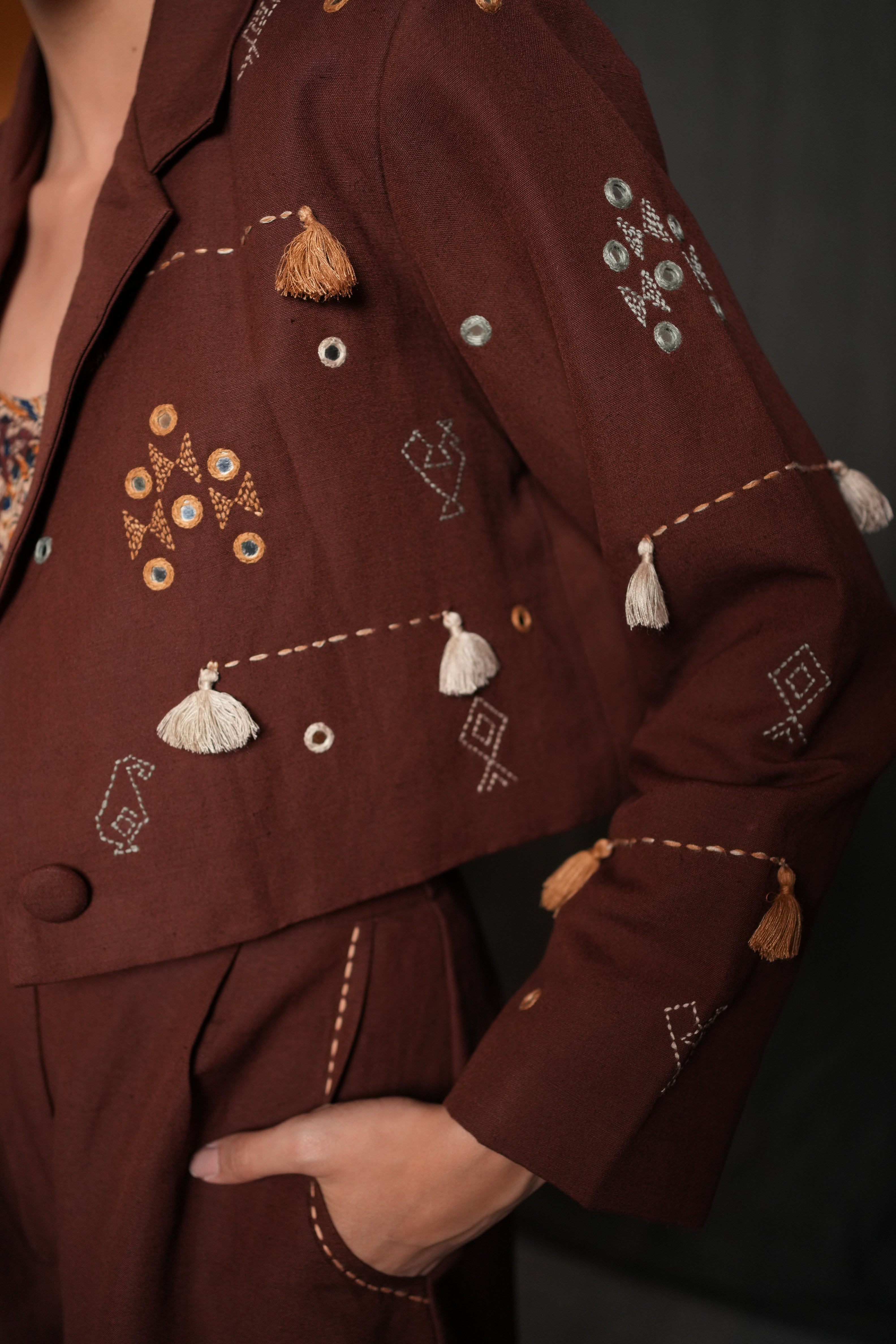 Swaroop Exclusive Design. Introducing Aura Crop Blazer, crafted for those with an experimental style. Adorned with mirror work, kantha stitches, and tassel embroidery on both the front and back panels, this piece features a notched lapel collar and long sleeves in viscose linen fabric.