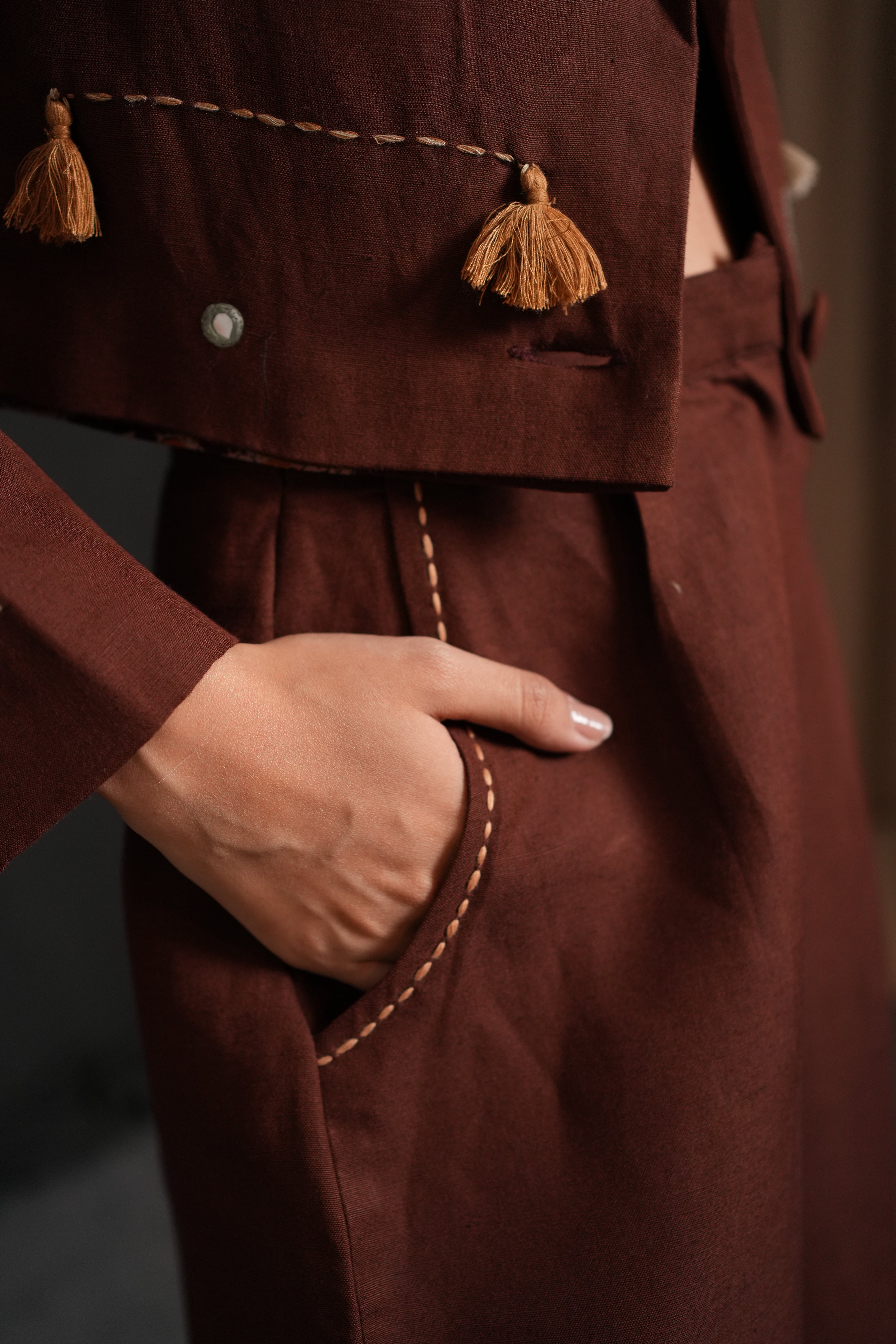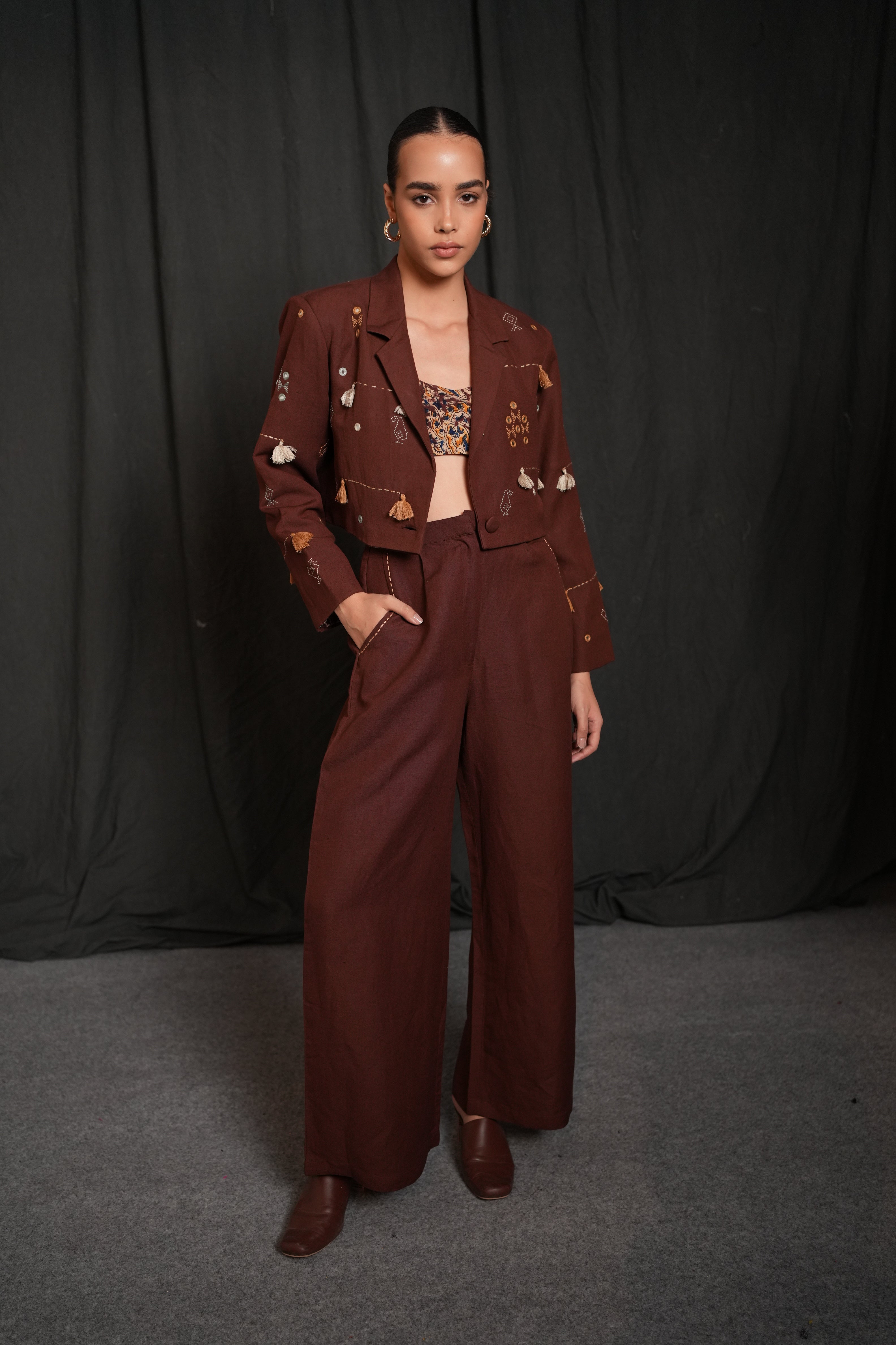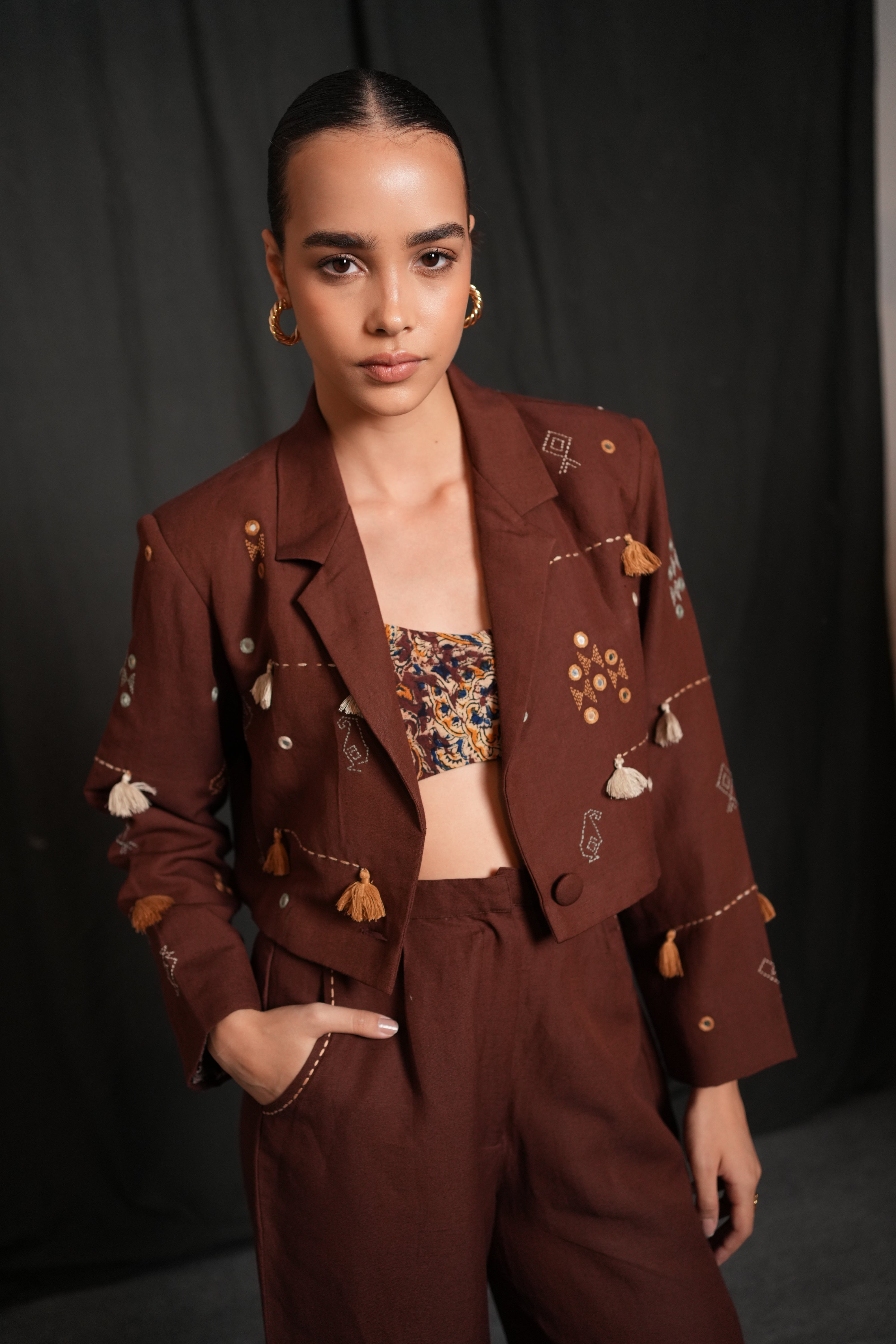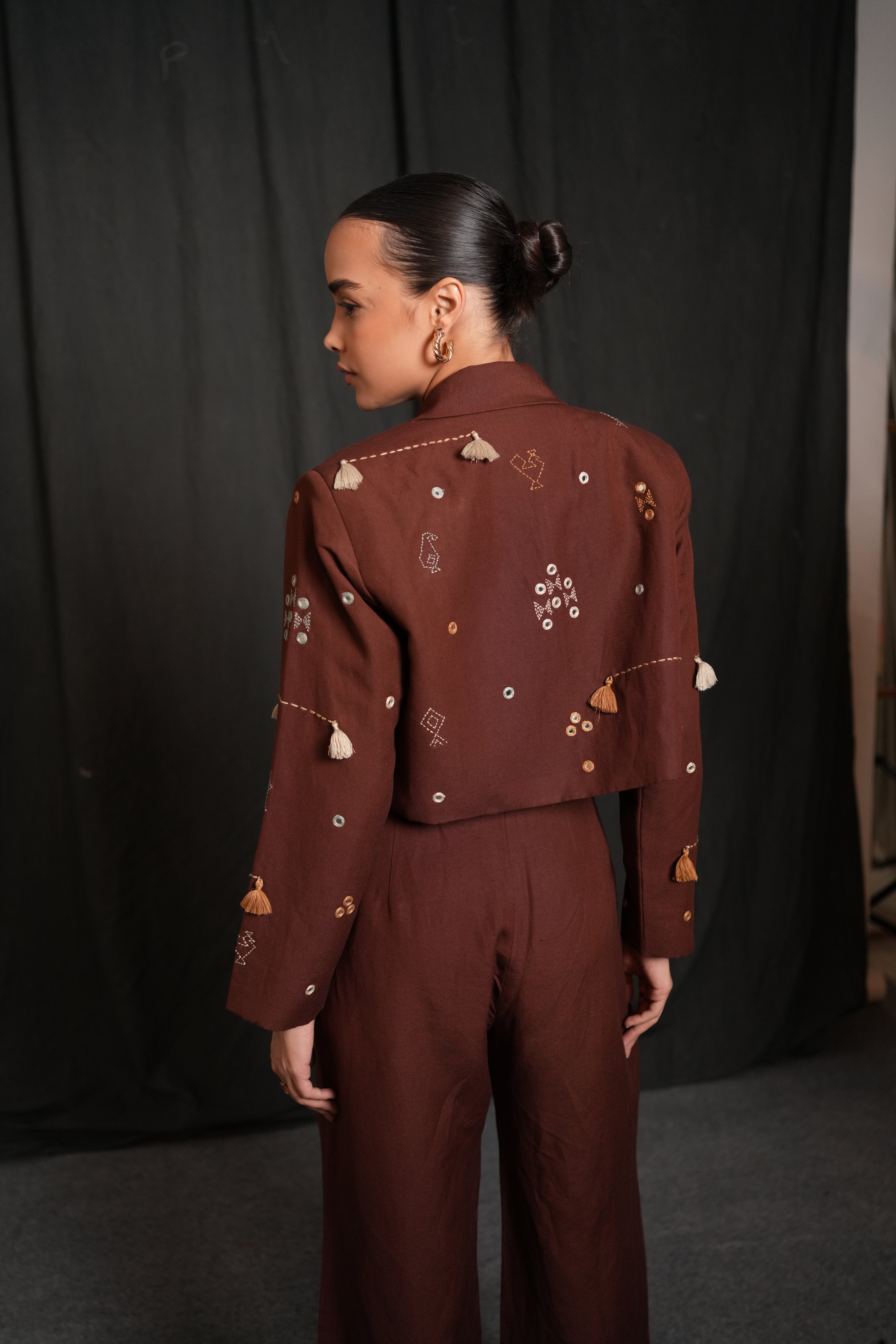 Swaroop Exclusive Design. Introducing Aura Crop Blazer, crafted for those with an experimental style. Adorned with mirror work, kantha stitches, and tassel embroidery on both the front and back panels, this piece features a notched lapel collar and long sleeves in viscose linen fabric.