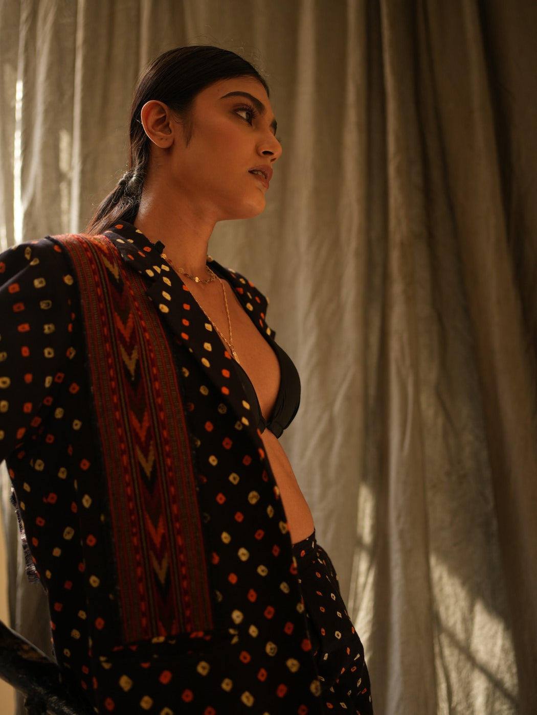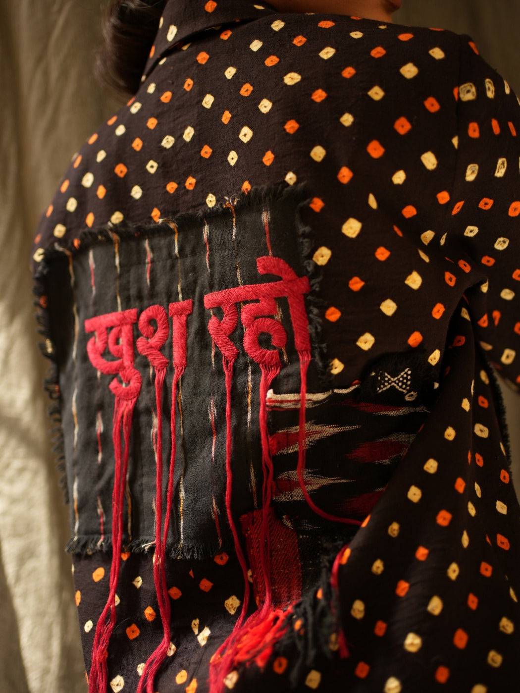 It has patchwork of Ikat and Kullu at back and the text is hand embroidered by our in-house Karigar using Aari work technique. The fabric of the blazer is authentic Bandhani crafted by the skilled artisans of Gujarat.