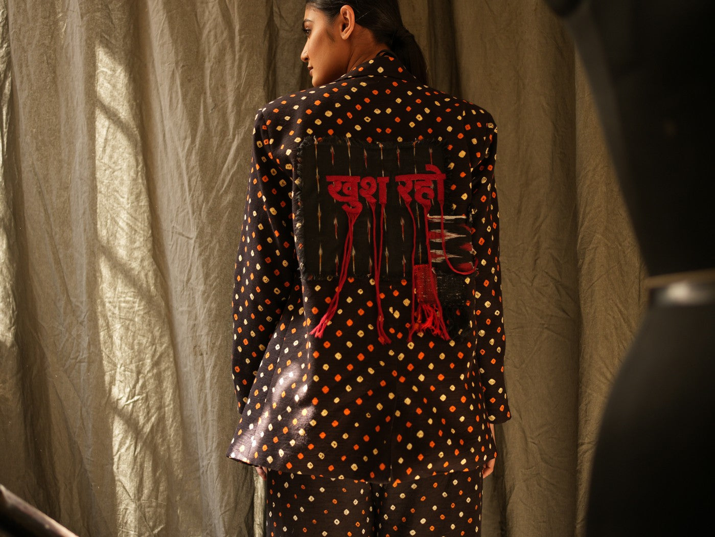 Swaroop Exclusive Design. Unveil the Allure of Tradition with a Twist: The Bandhani Blazer with enchanting "Khush Raho" embroidery at the back which translates to "Stay Happy" in Hindi. It's a secret reminder to find joy and contentment in life's everyday moments.
