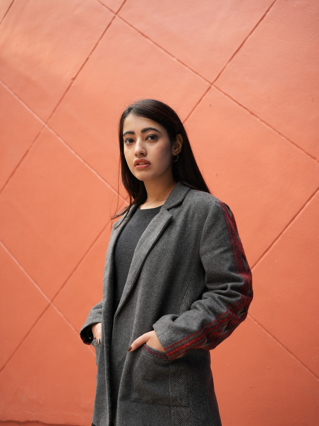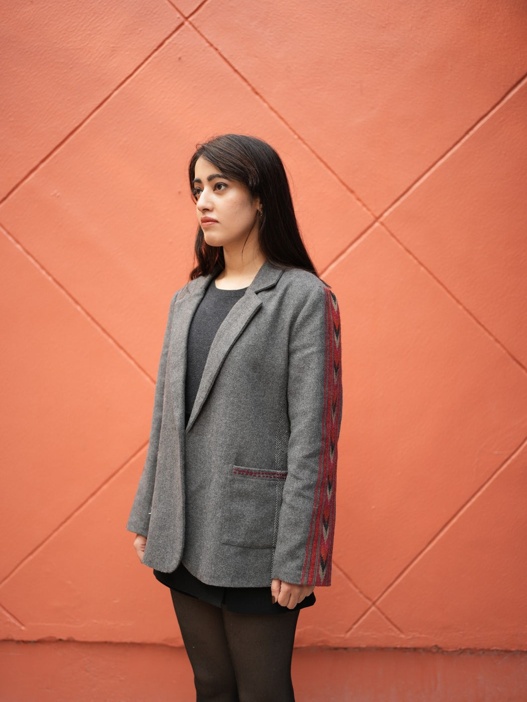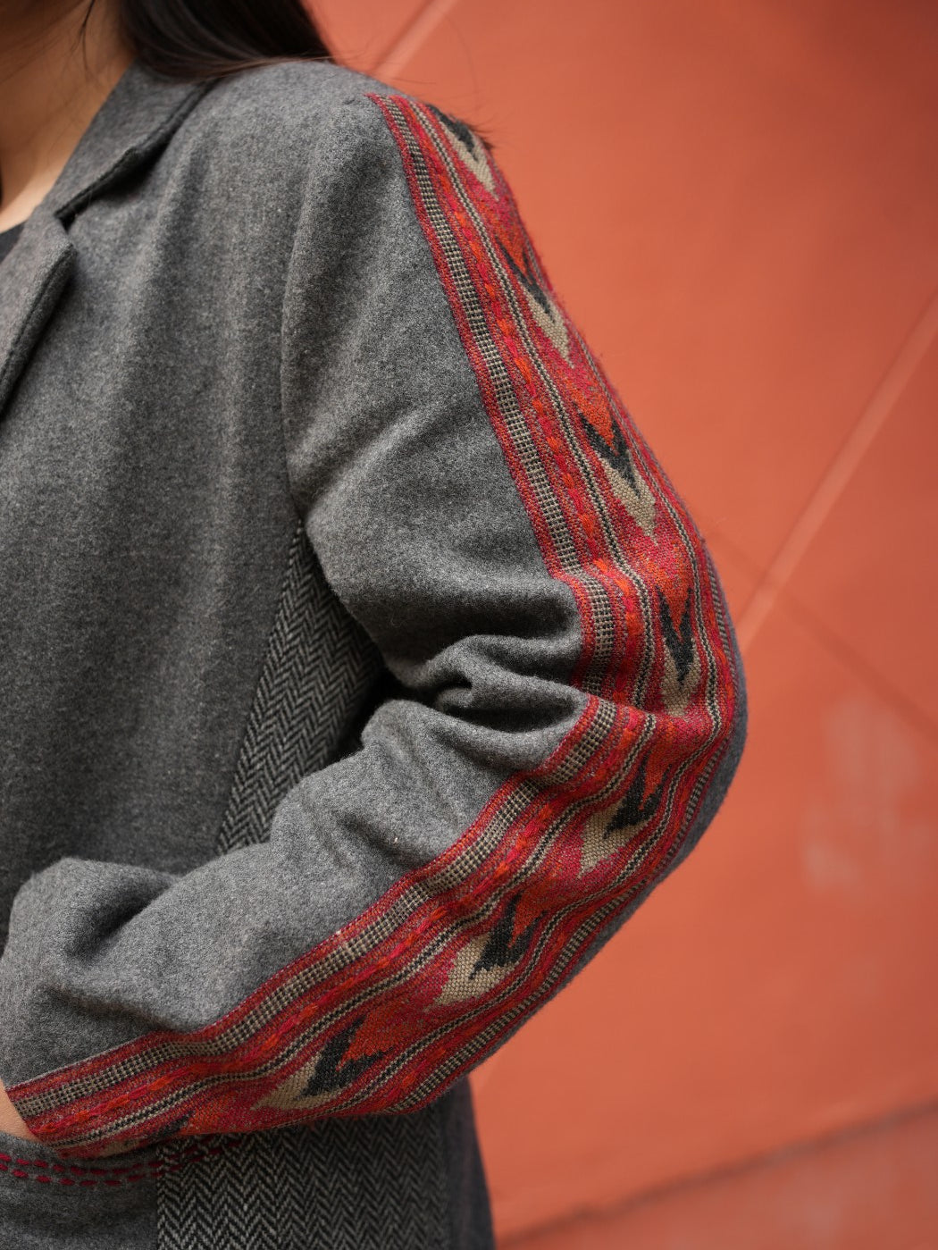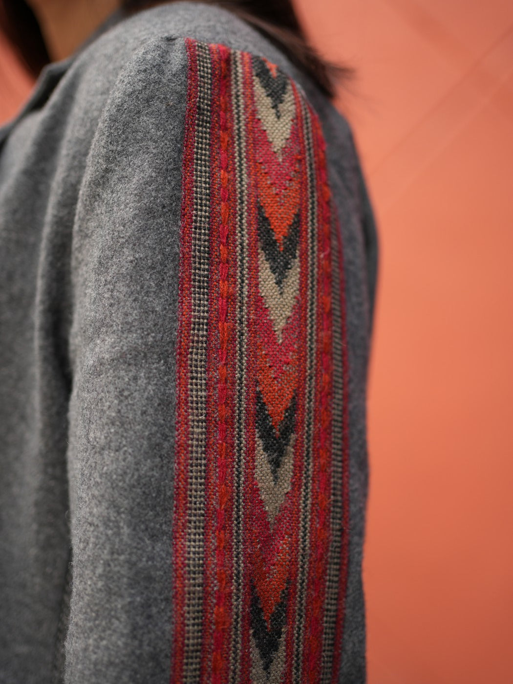 Swaroop Exclusive Design. Introducing "Kullu Blazer" in woollen fabric. Fetaures Notched lapel collar and long sleeves adorned with kullu borders. The front patch pockets are a stylish highlight, accentuated with chain stitch and blanket stitch detailing.