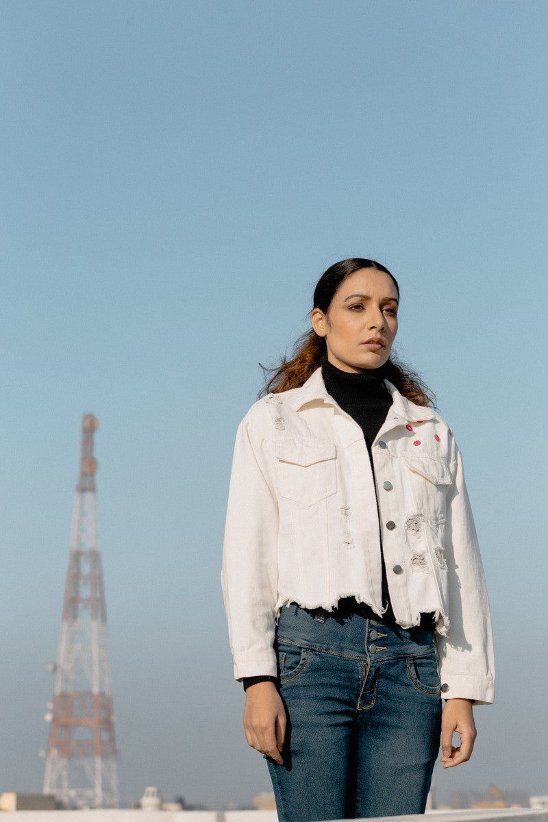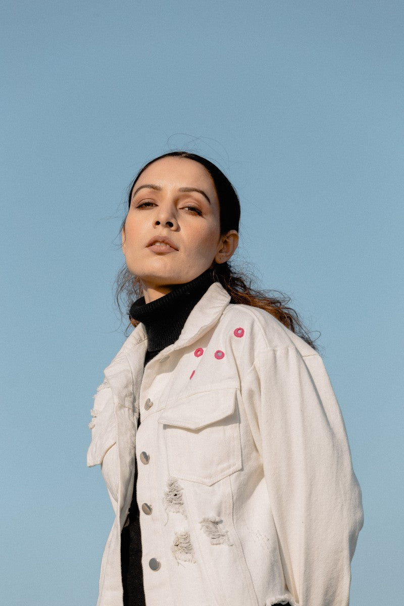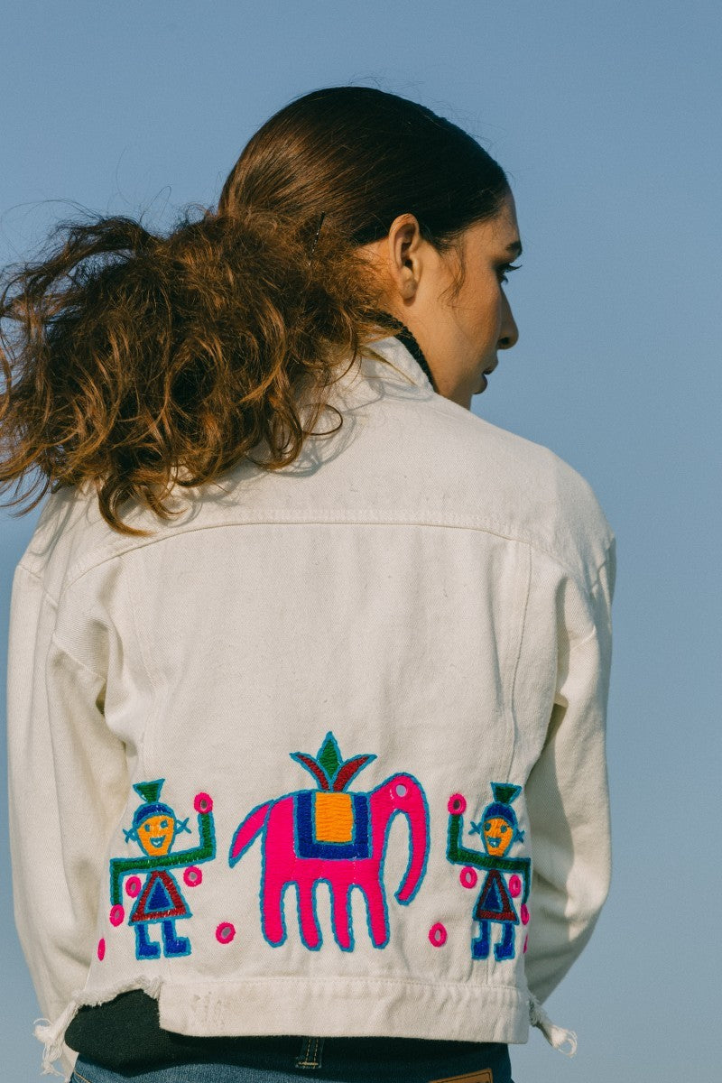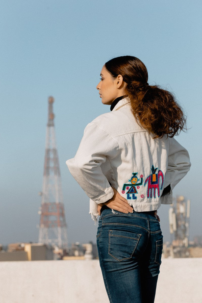 Swaroop Exclusive Design. The Boho Denim Jacket is a blend of Aari work with denims. The jacket features unfinished hem and the fabric is hand-embroidered by our in-house karigar, Munim Ji. The back is adorned with beautiful tribal motifs done with Aari work giving it a Boho look. The front panel is embellished with mirror work.