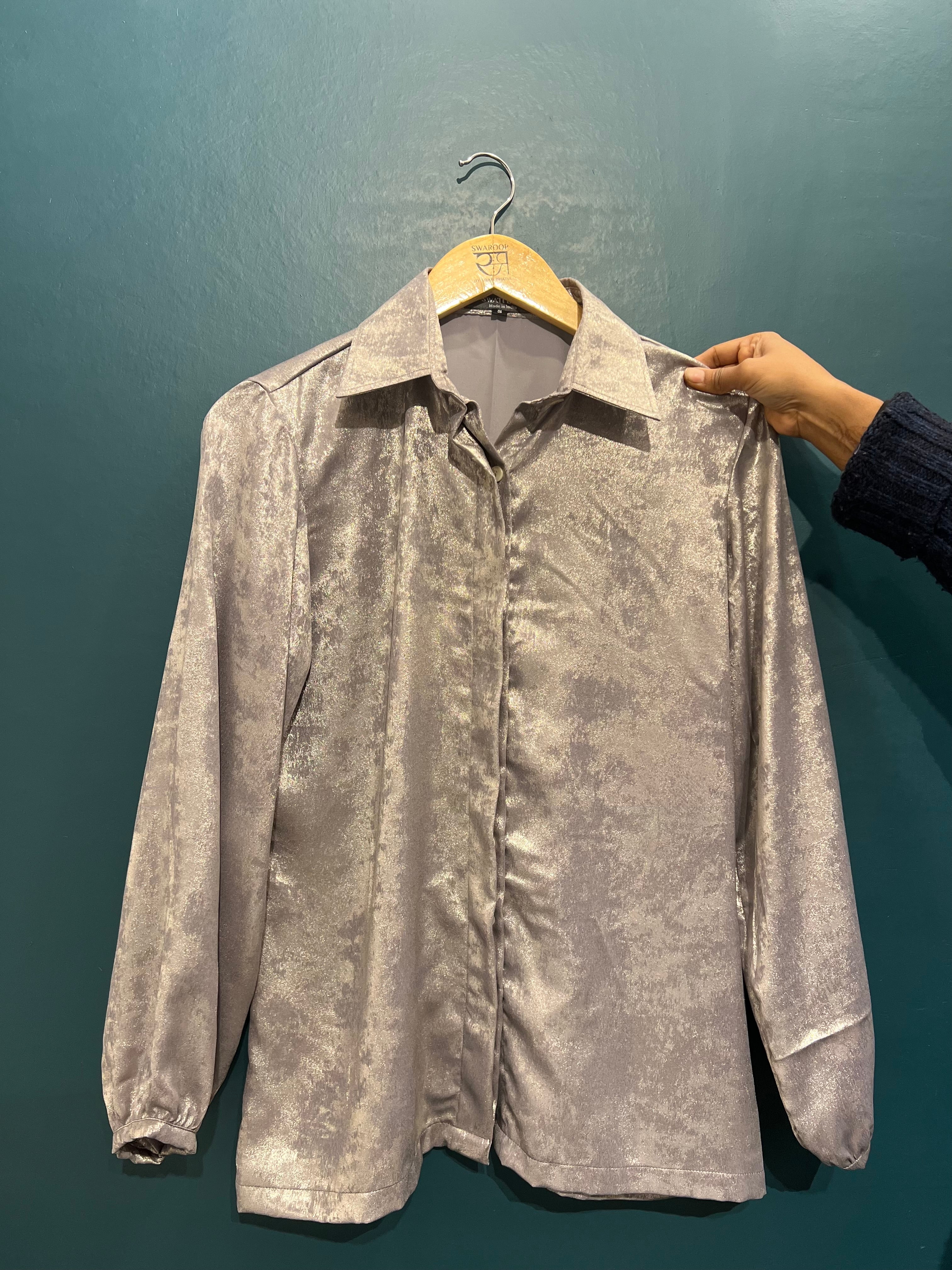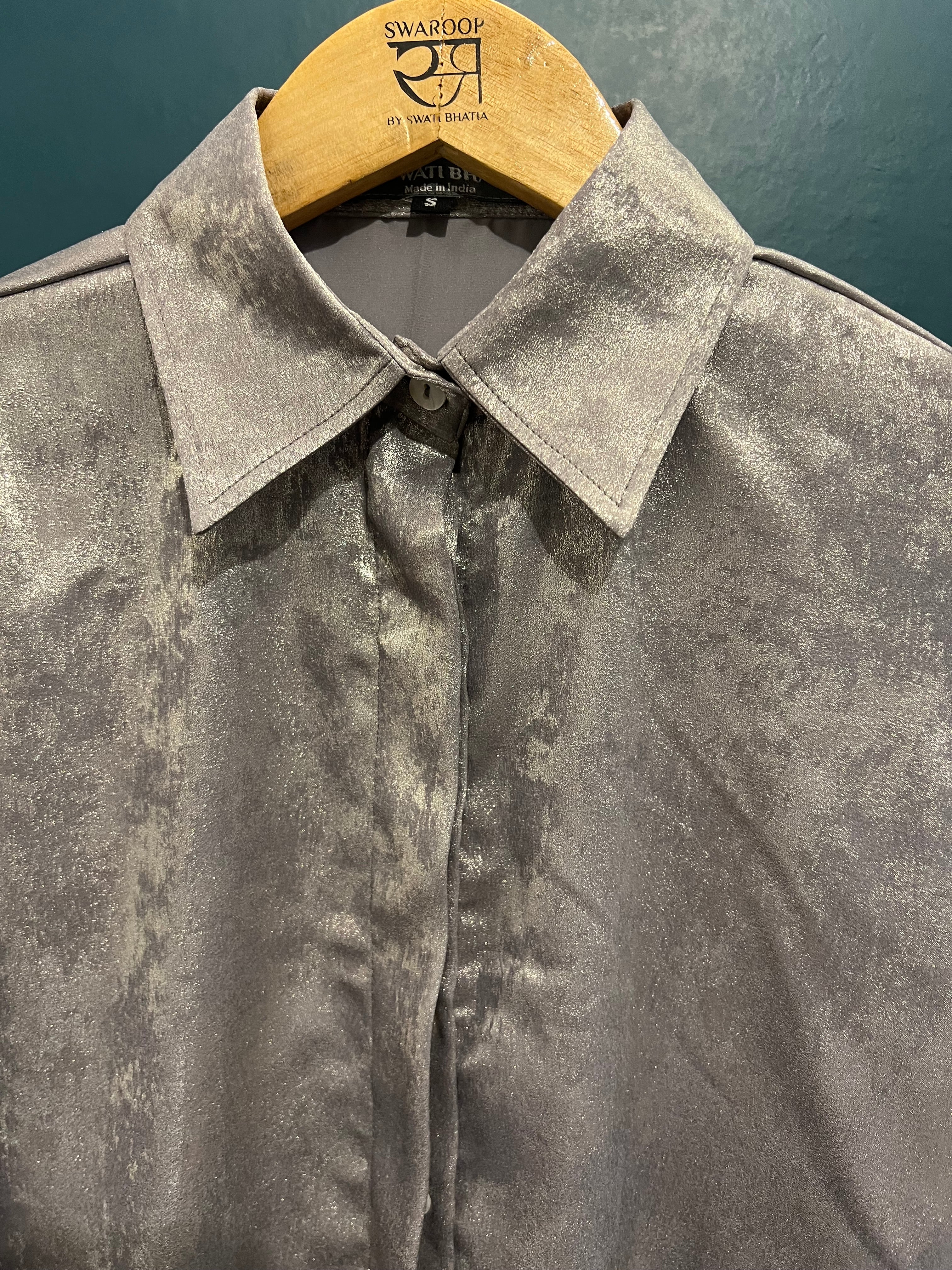 Swaroop Exclusive Design. Featuring Disco Shirt in crepe fabric. It has a hidden placket and delicate thin cuffs. The shirt is designed to make you stand out on any occasion.