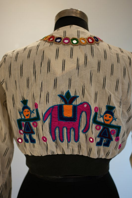 Swaroop exclusive design. Featuring Ikat jacket, enhanced with embroidered motifs. Crafted in a comfortable fit. Wear it and flaunt it a little bit everywhere you go.