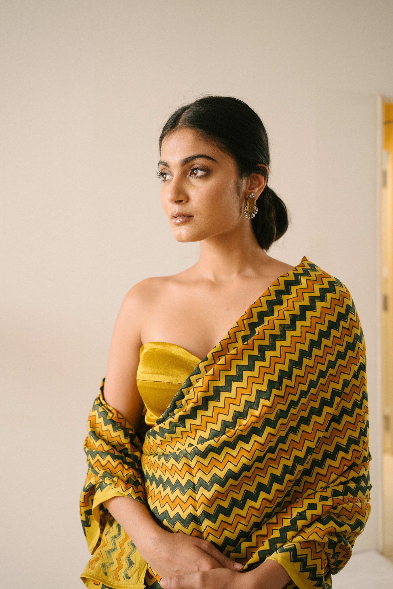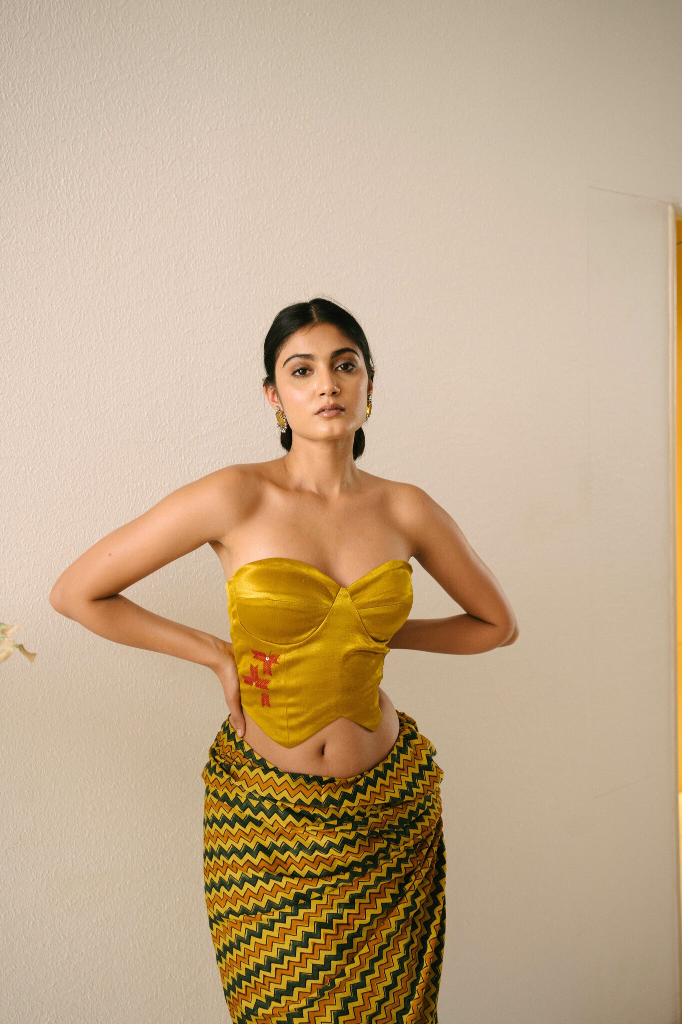 Introducing a stunning creation by our talented client, Ishita: a Mashru silk corset that showcases her exquisite design skills.