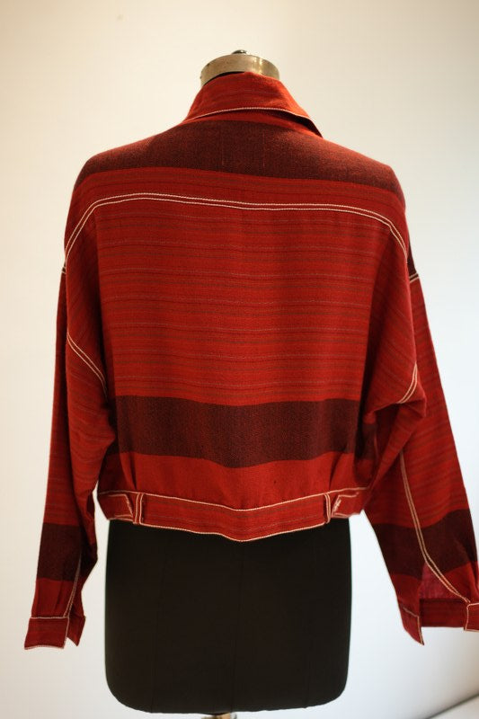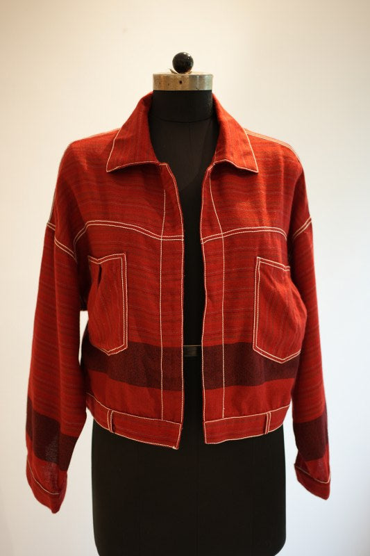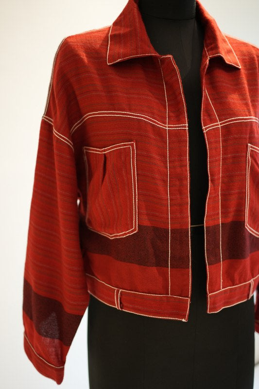 Swaroop Exclusive Design. The Jingle jacket is a marriage between Indian textile and modern silhouette. The fabric is handwoven by the weavers of Kullu, Himachal Pradesh. Enhanced with stitch lines all over the jacket.