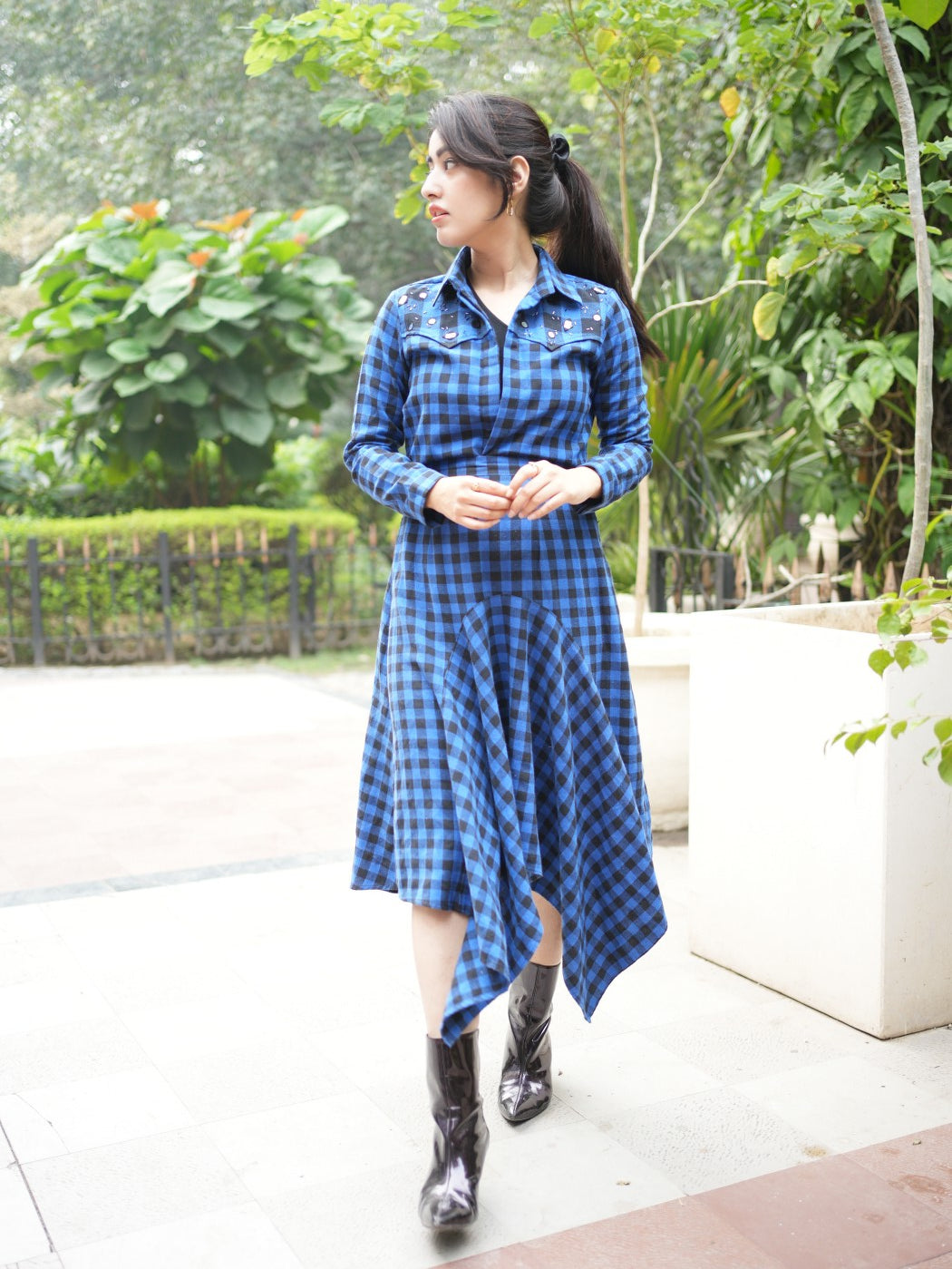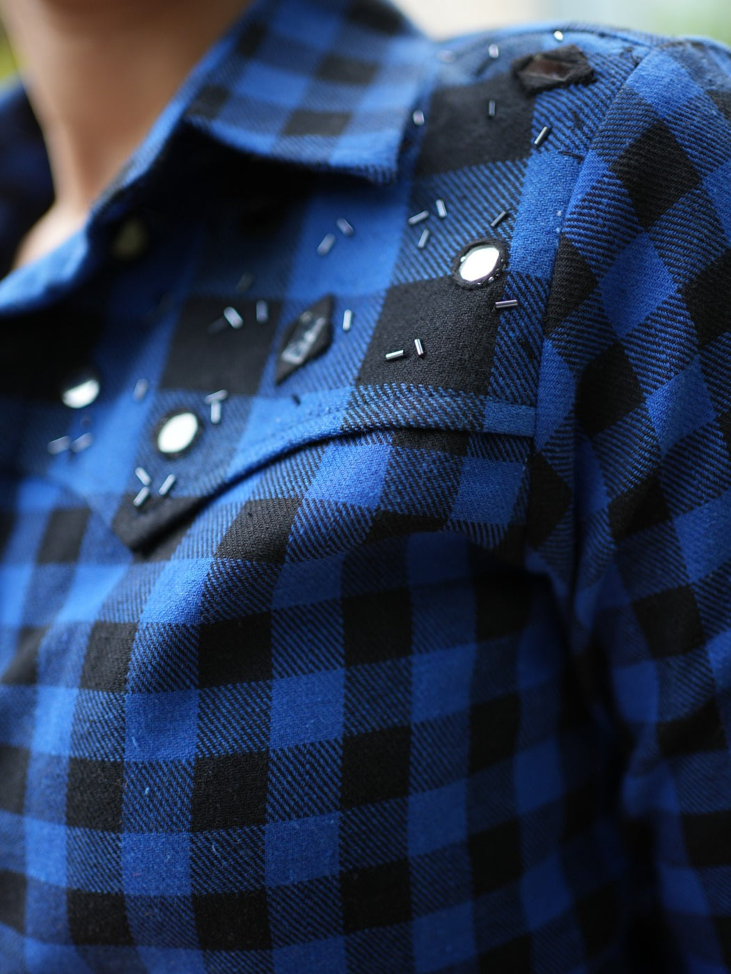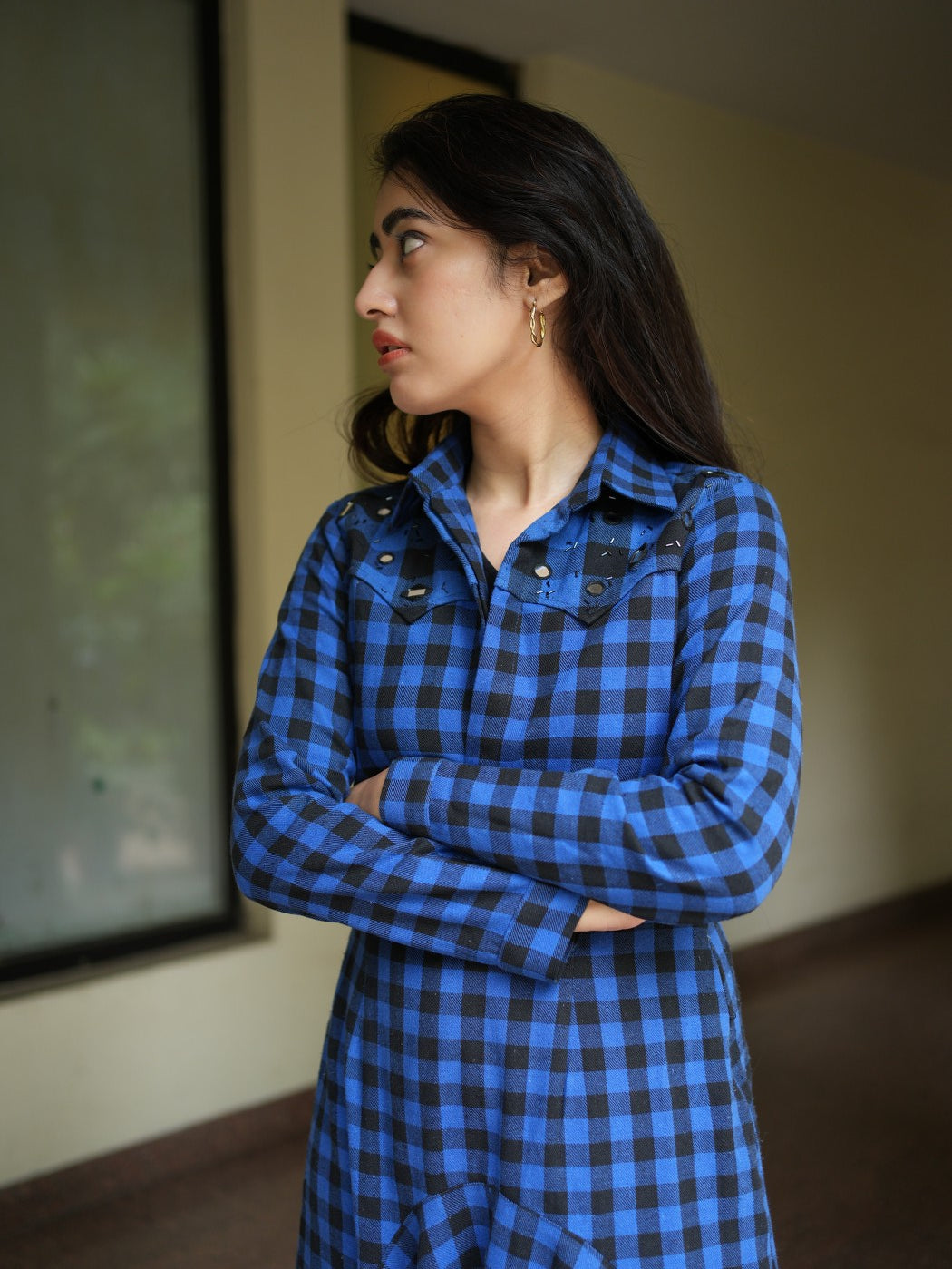 Swaroop Exclusive Design. The Pahadi is a check shirt that reminds us about Indian textiles through modern silhouettes. Embellished with mirror work by our in-house karigar, Munim Ji using the traditional aari work technique.