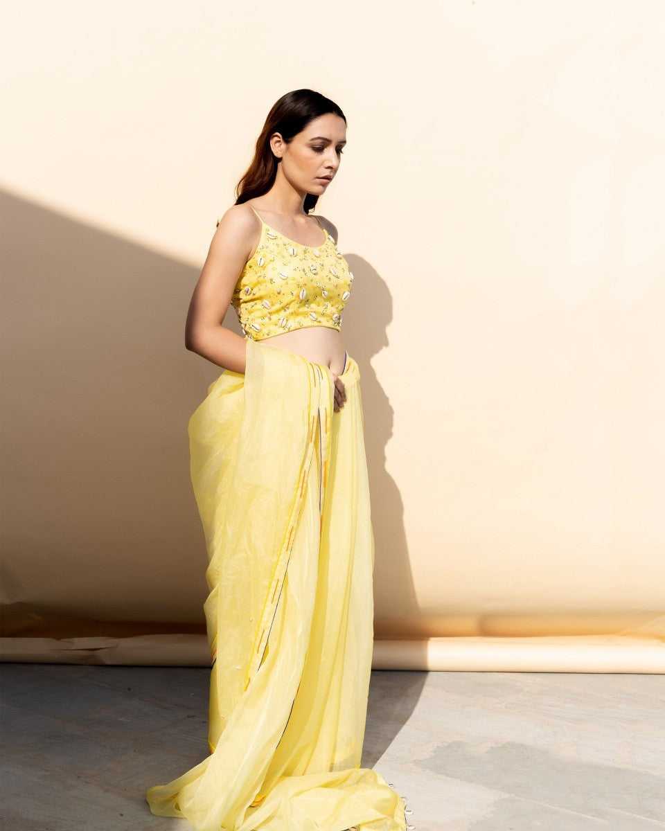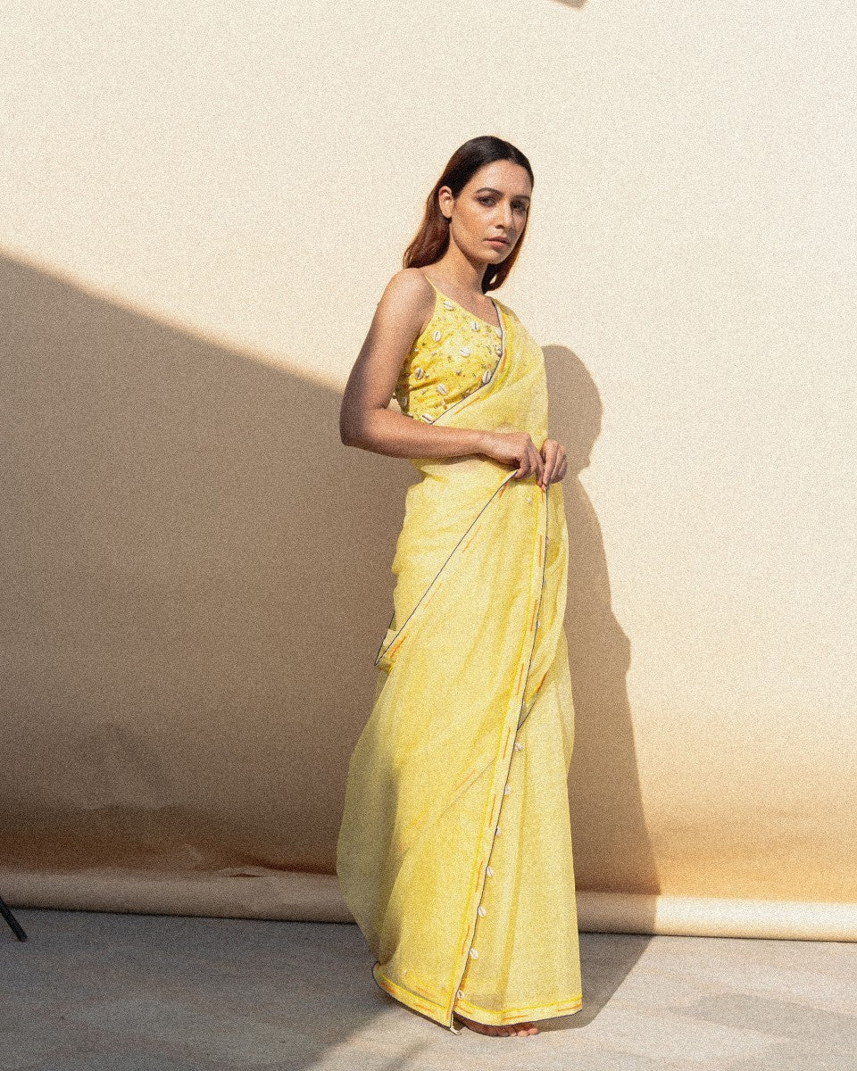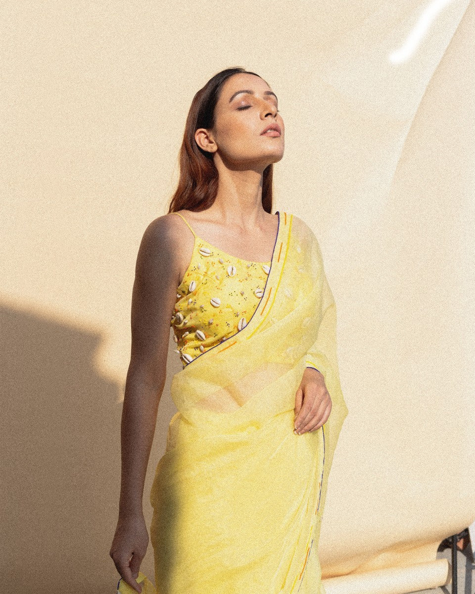 Swaroop Exclusive Design. Peeli Adivasi saree is a marriage between Indian textile and modern silhouette.It is an organza based hand crafted Saree with intricate bead work border by our Inhouse karigar 'Moneem ji'