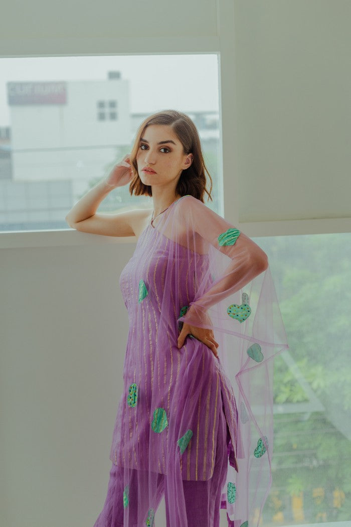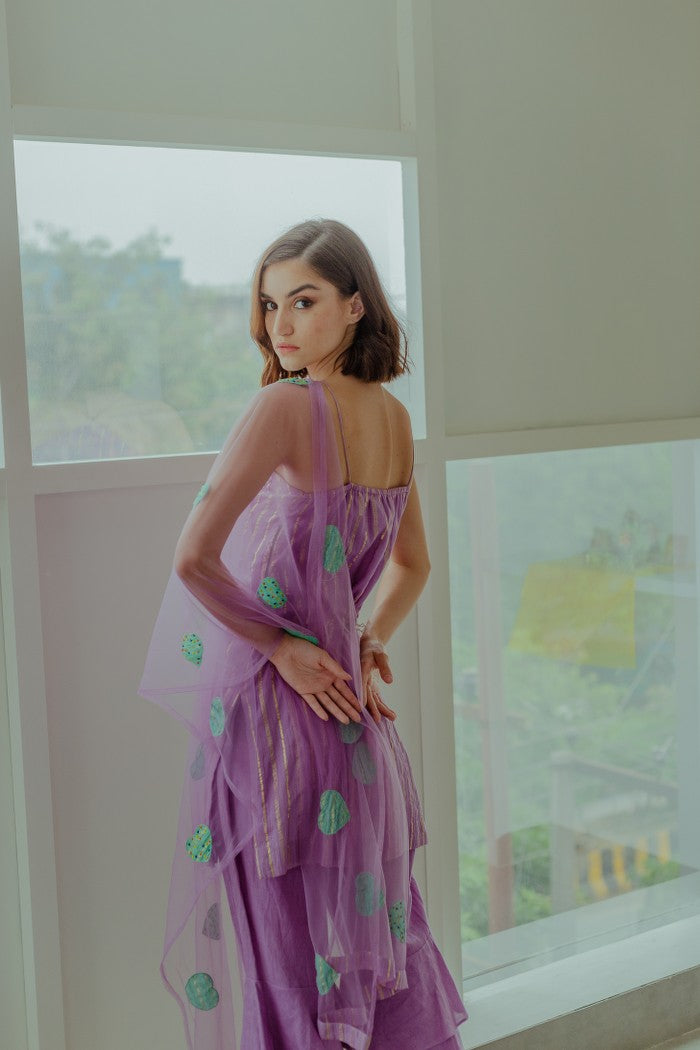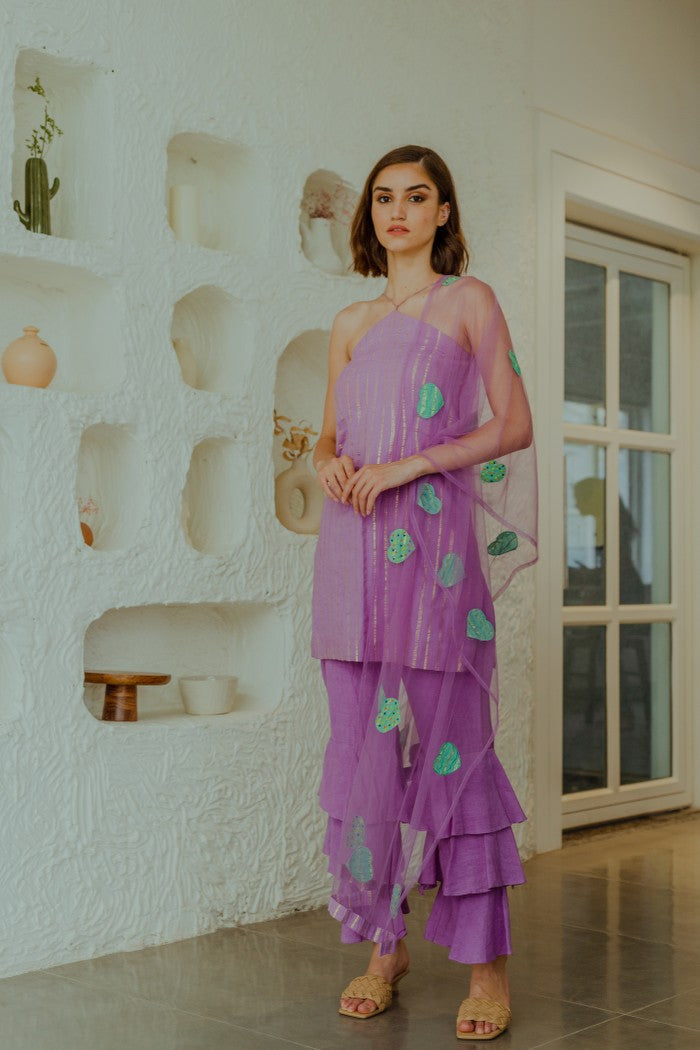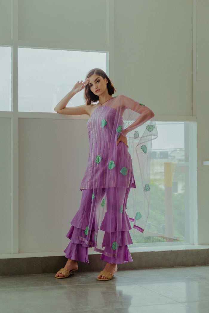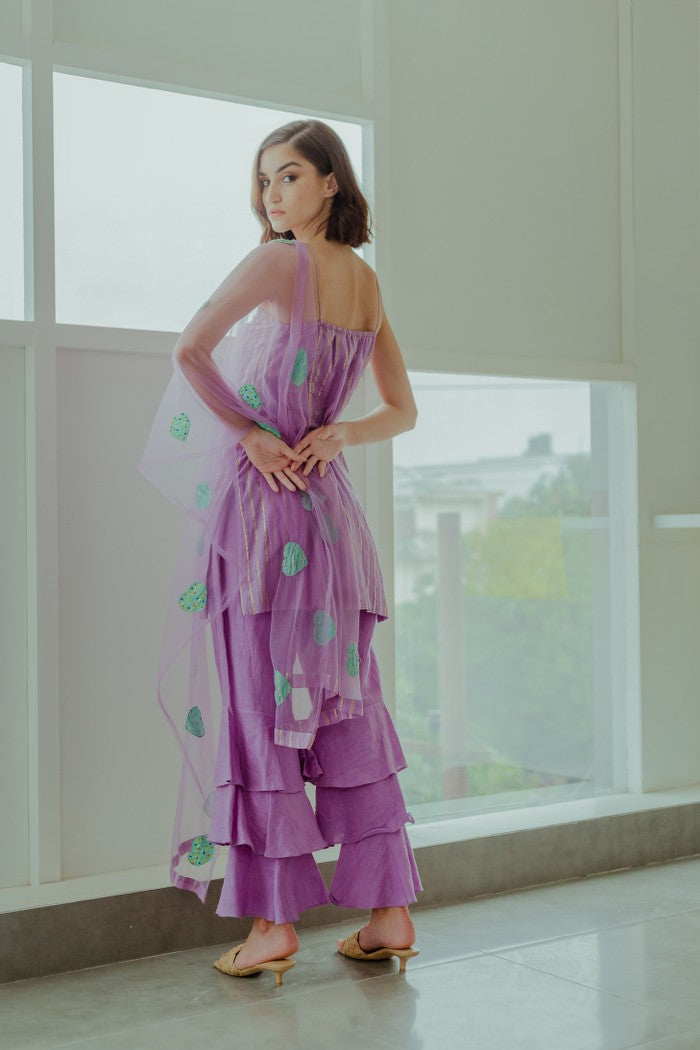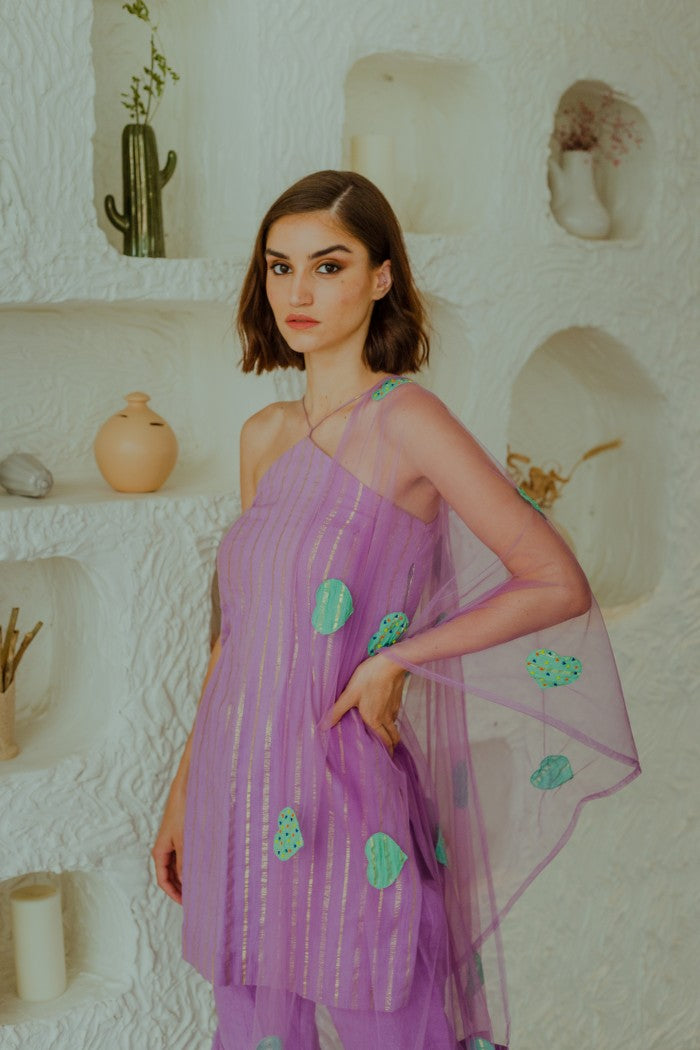 Swaroop Exclusive Design. This Lavender Nazar set is perfect for festive season. Padded Halter neck kurta in cotton base paired with three- layer bell- bottoms. Enhanced with heart shape patchwork dupatta with beads hand embroidery. Back Elasticated and front belt bell-bottoms.