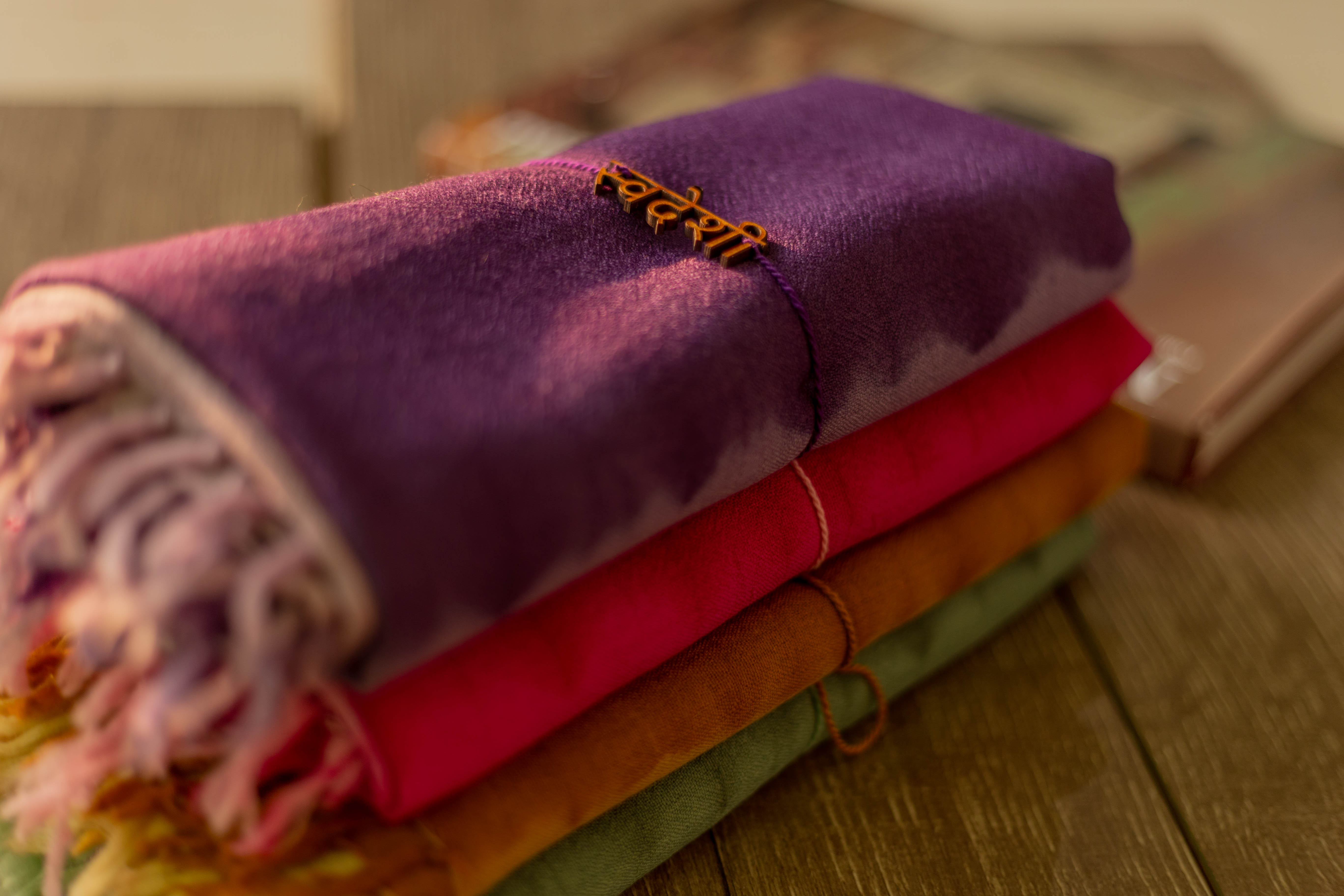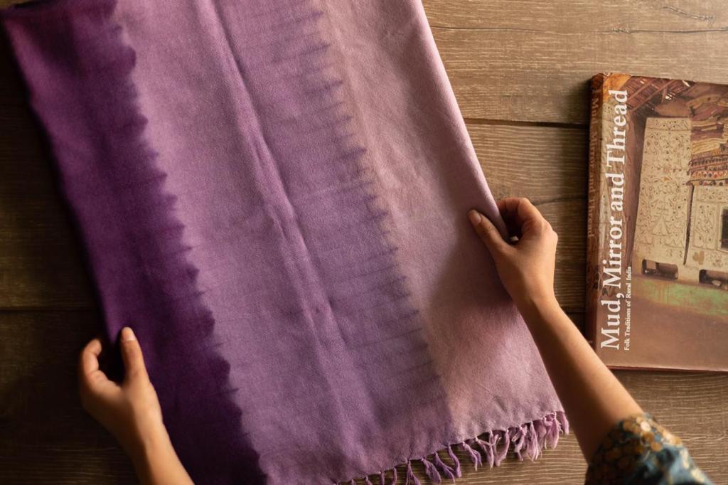 Swaroop Exclusive Design. Handloom ombre stoles in merino wool base have been hand-woven by the weavers of Bhujodi, Gujarat using their traditional techniques passed down from generation to generation. Adorned with handmade tassels.
