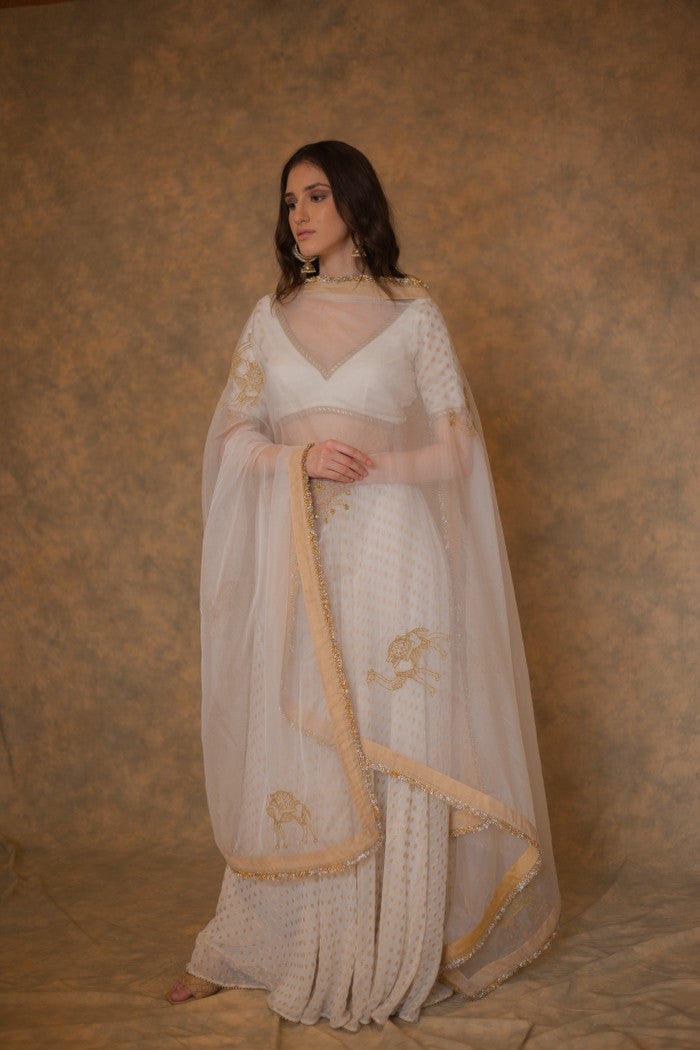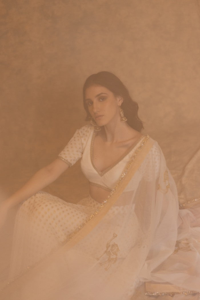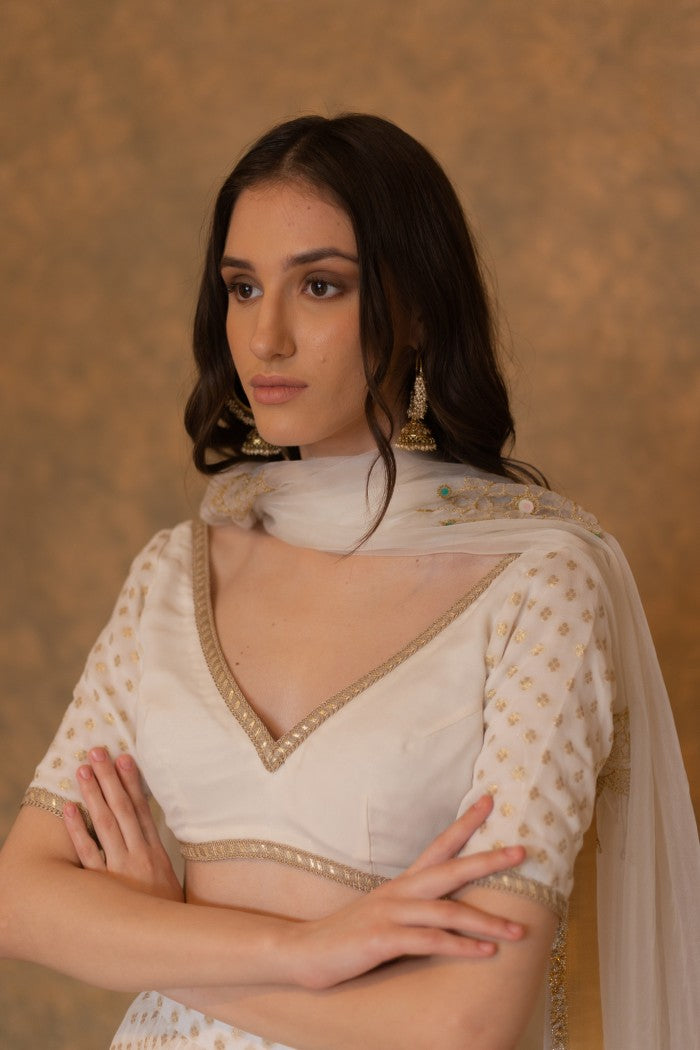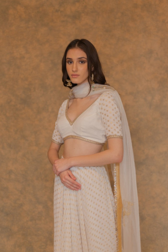 Swaroop Exclusive Design. The Mogra Lehenga Choli in geoergette fabric paired with hand-embroidered camel dupatta. The dupatta has intricate Aari and mirror work. The blouse is crafted with deep V-neckline and side zip closure. The deep V back of the blouse is enhanced with hand made latkan. Flaunt Indian craftsmanship in the most exclusive modern version.
