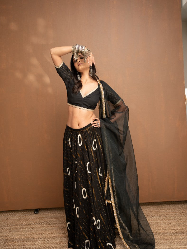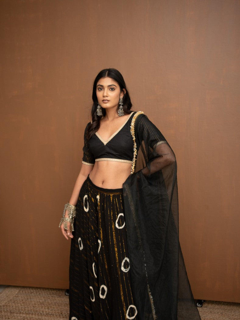 The skirt showcases the true artistry of skilled artisans in its authentic tie-dye fabric. This ensemble beautifully merges traditional Indian craftsmanship with a modern aesthetic, making it a perfect choice for your upcoming Diwali outfit. Stand out and make a statement this festive season.