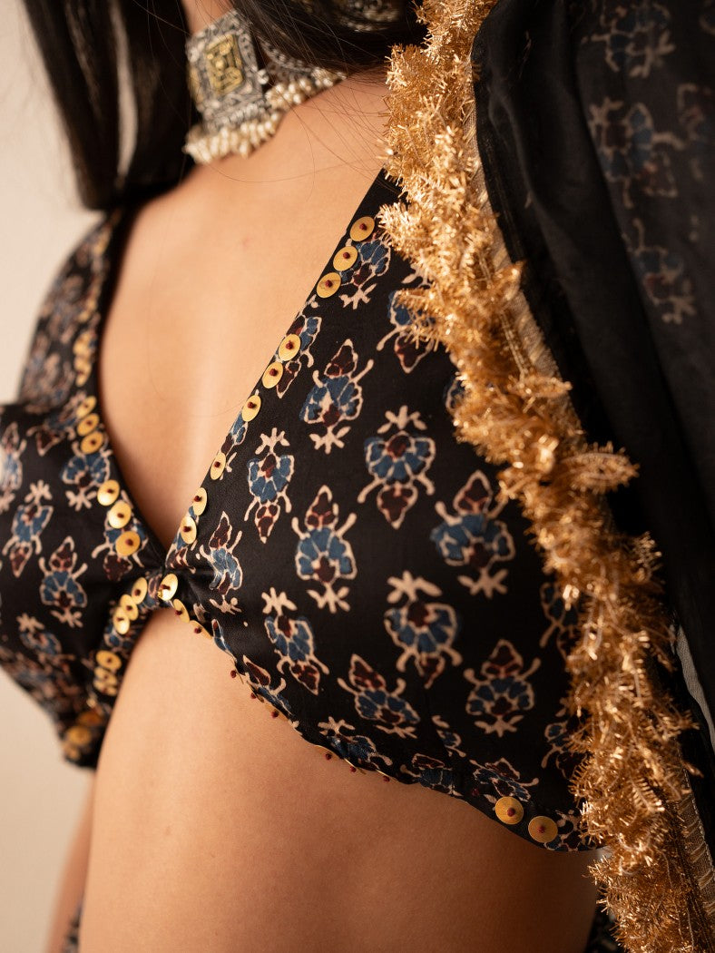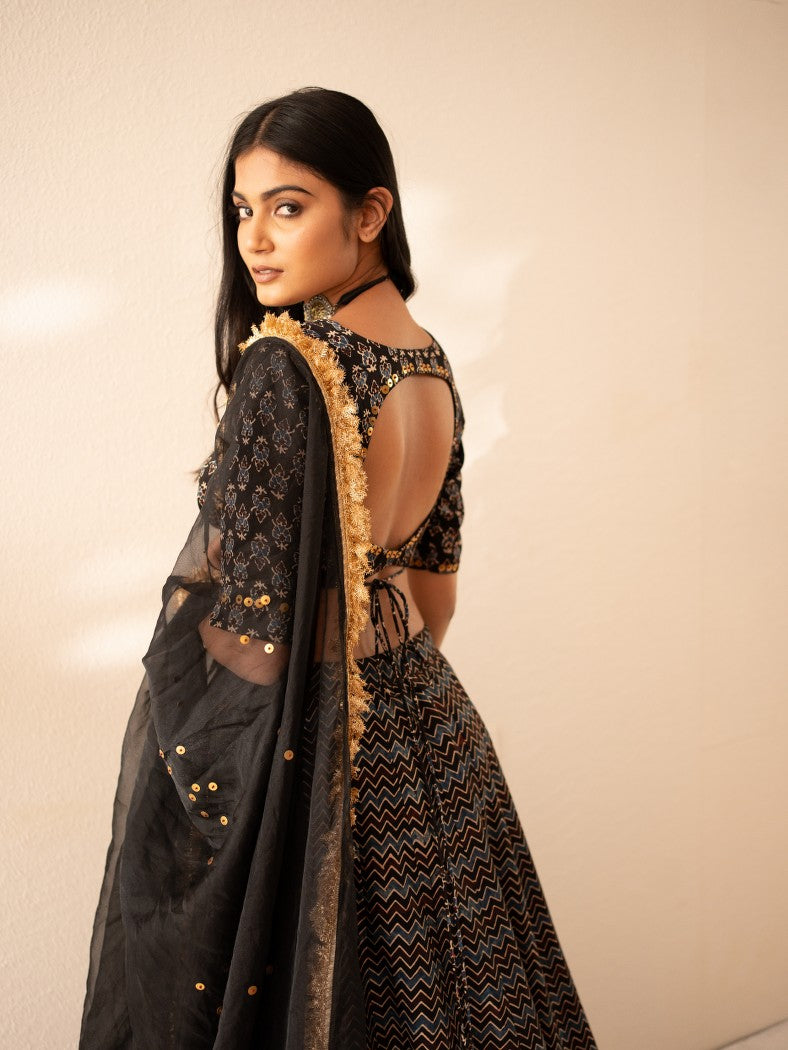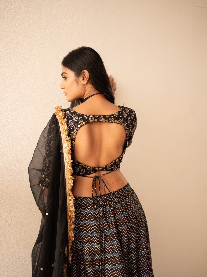 Swaroop Exclusive Design presents the Ajrakh Lehenga Set, seamlessly blending tradition with modern design. The skirt features a zig-zag block-print pattern, while the blouse showcases a deep V-neck, a round back with an ambi print embellished with brass sequins embroidery on the neck, and a side zip closure. Complete with an organza dupatta adorned with brass sequins hand embroidery and golden lace.