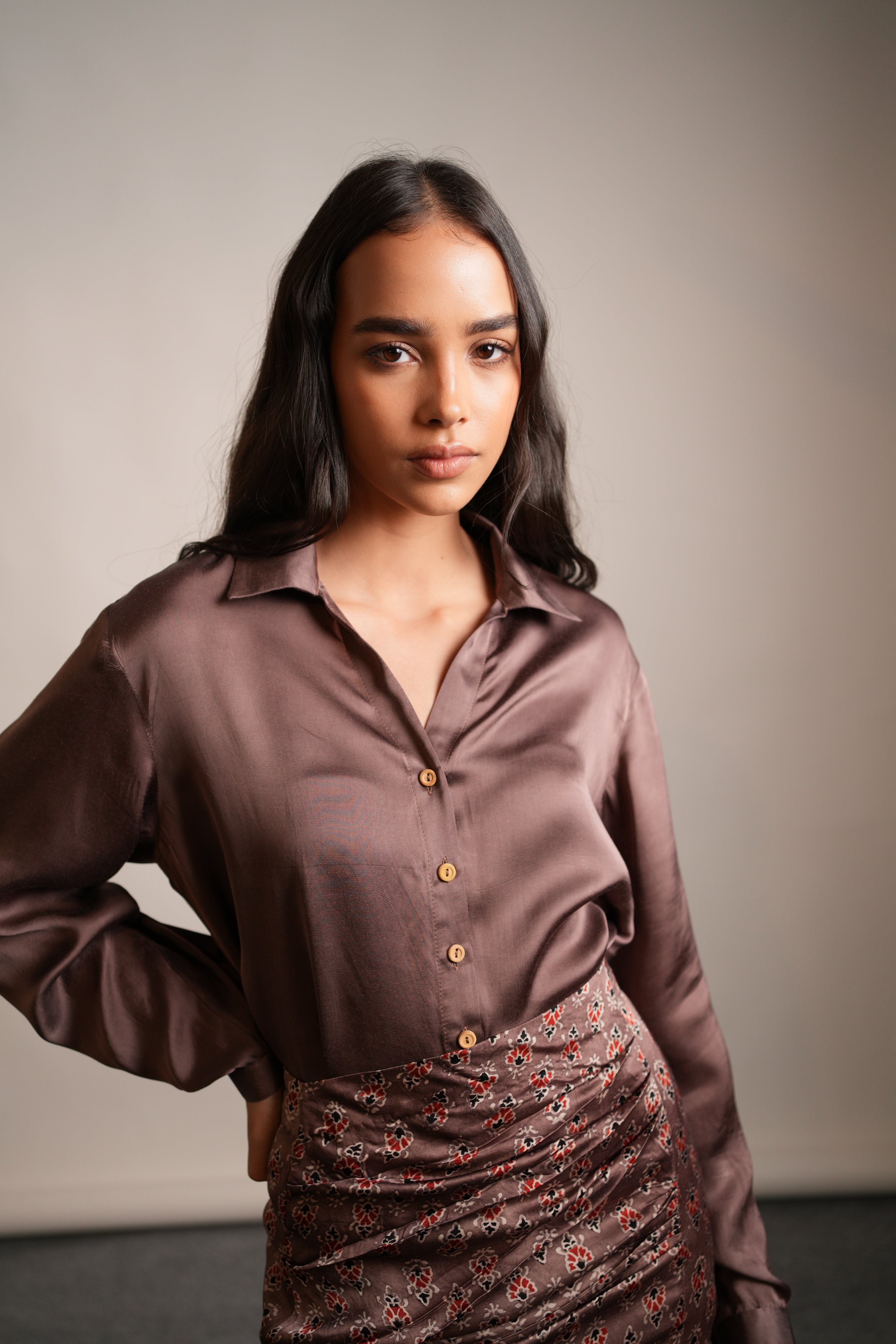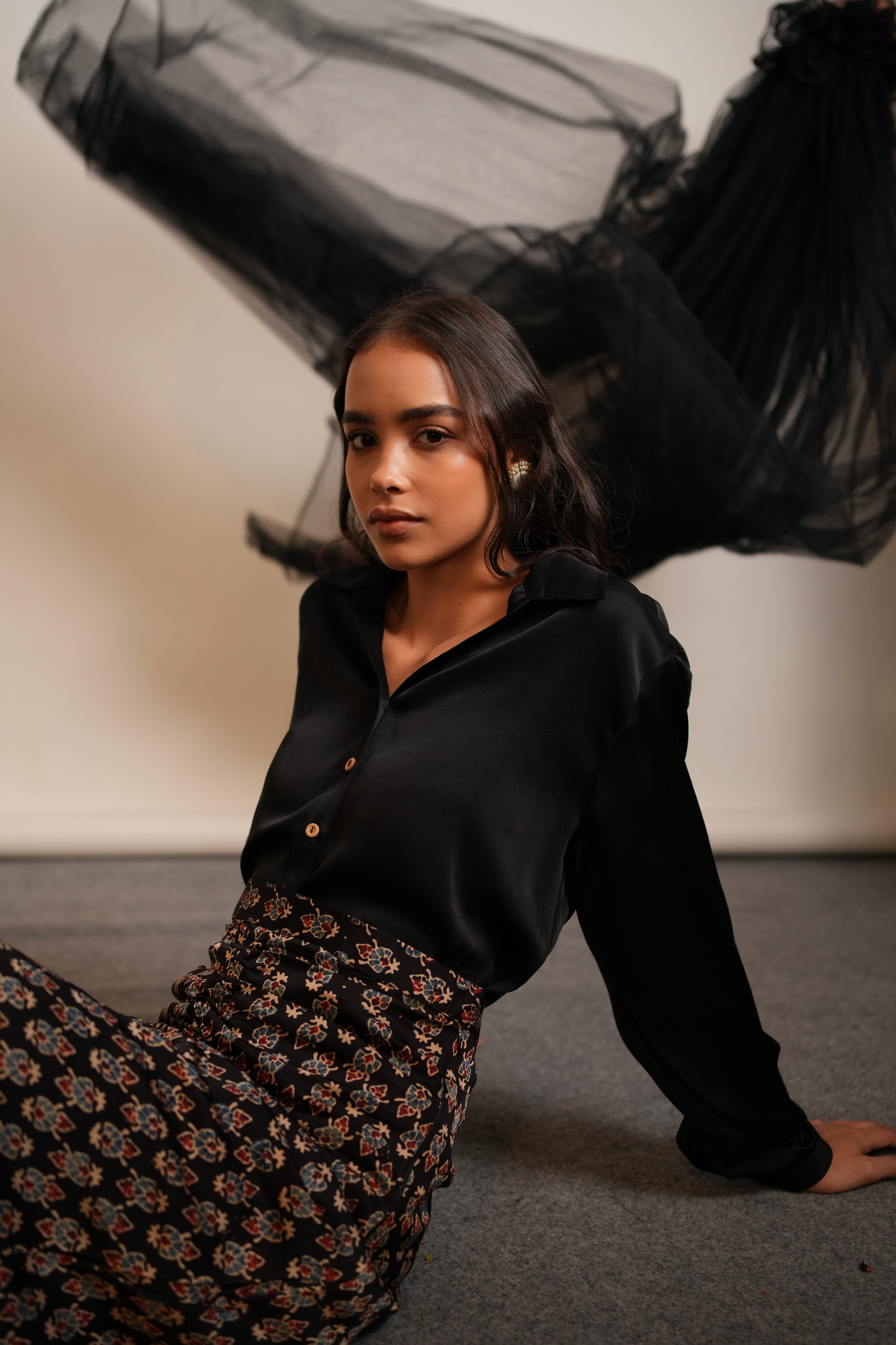 Elevate your style with our satin shirt, available in chic black, rich maroon, and soft mauve. This piece features stylish short cuffs, a sophisticated V-neck, and a classic collar. Pair it with our Ajrakh Black Ambi skirt for a stunning festive look, or wear it with tailored trousers for polished office meetings. Versatile elegance at its finest!