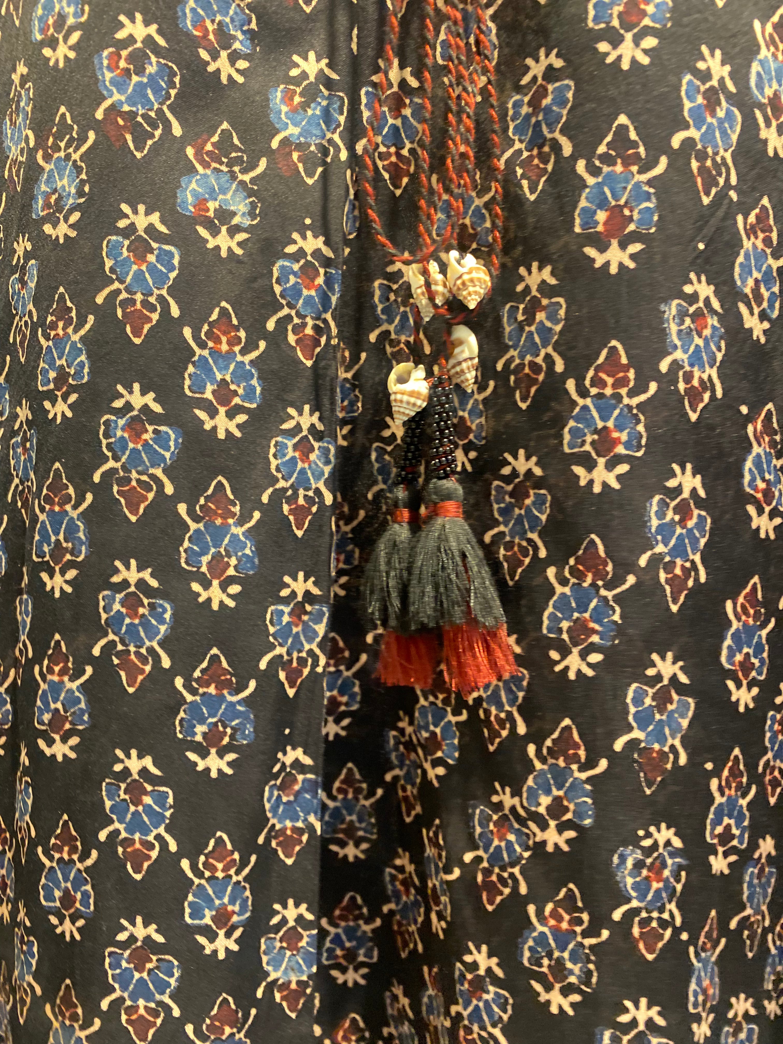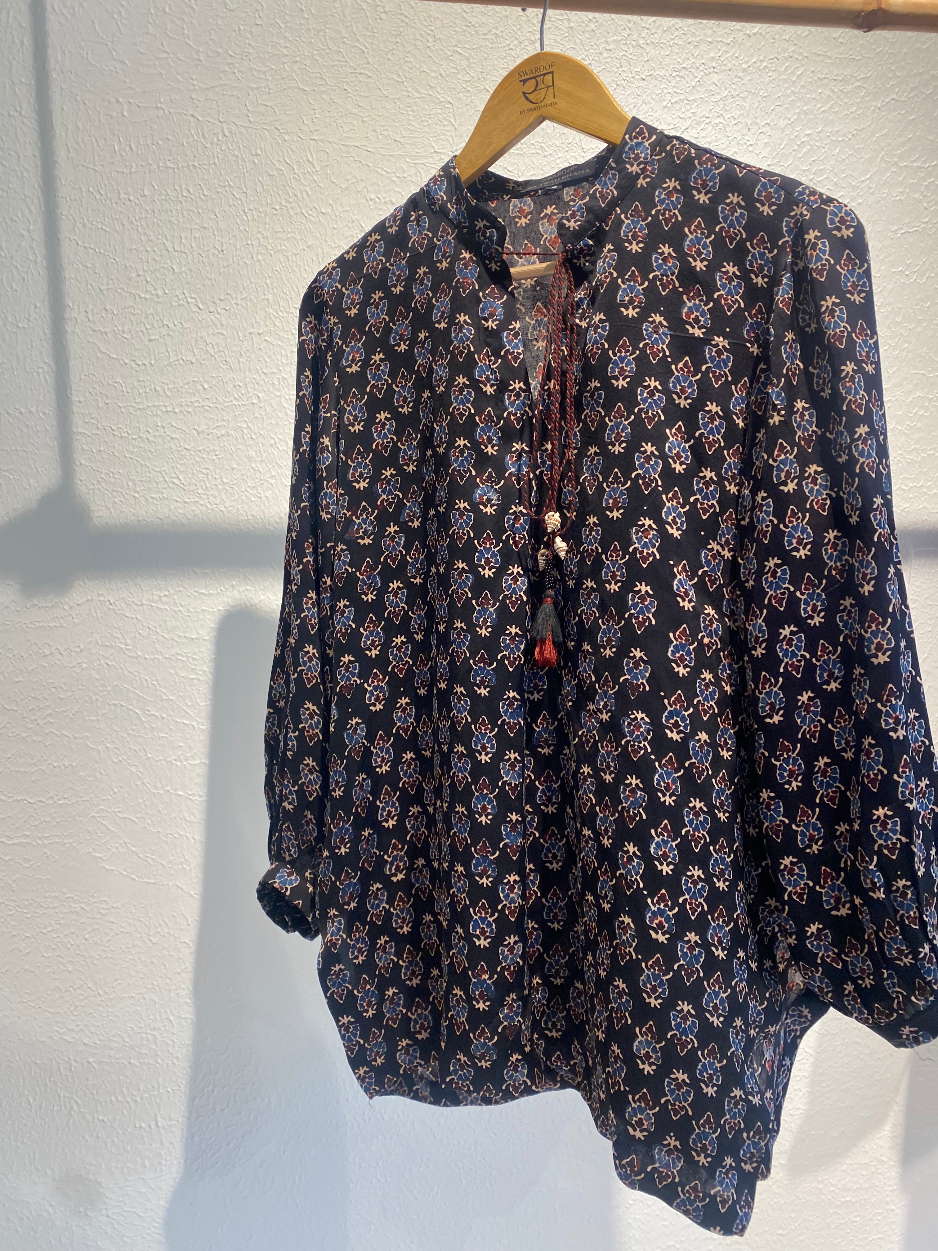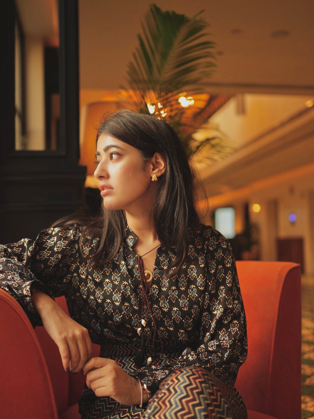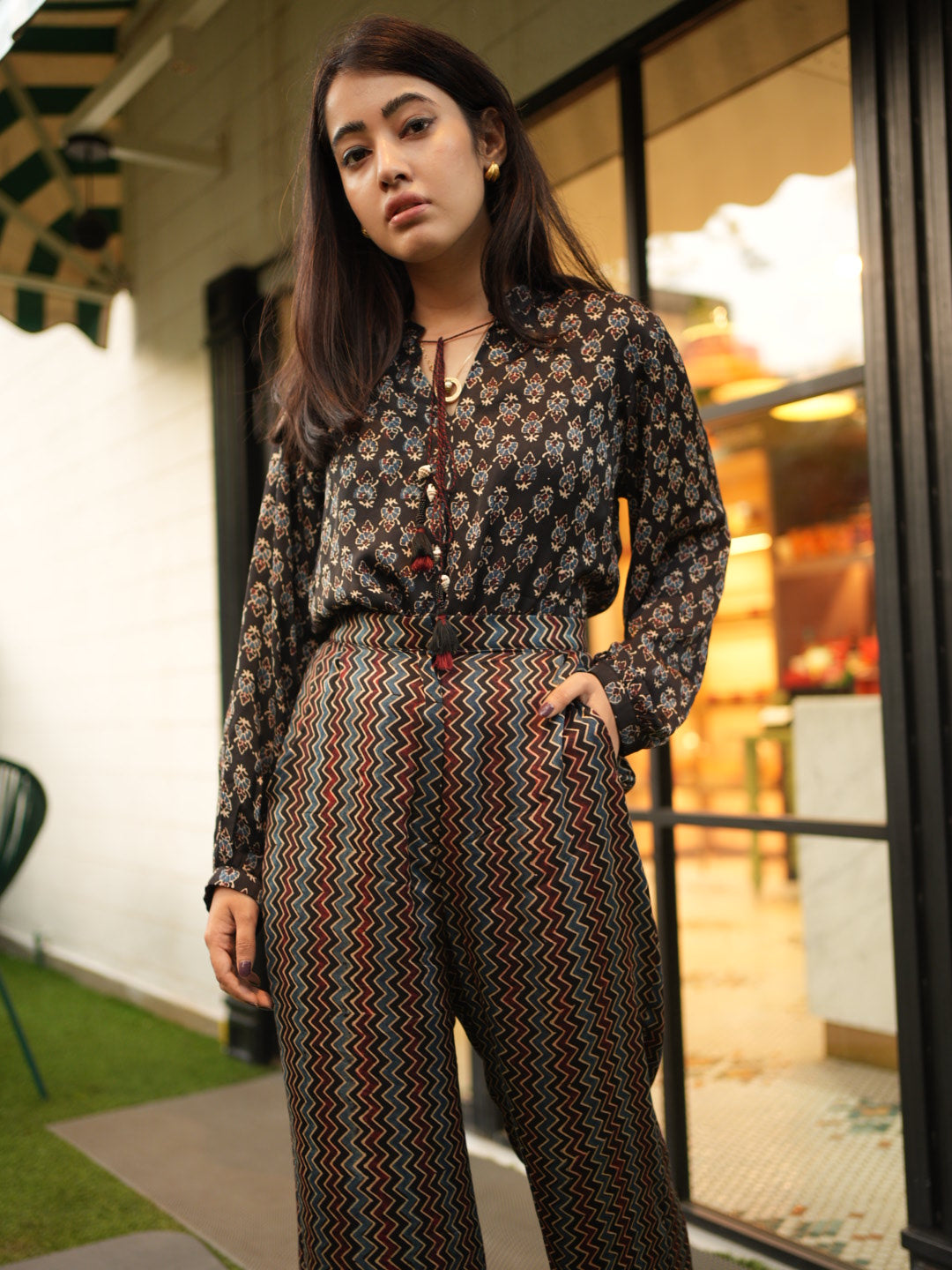 Elevate your festive wardrobe with Boho Ambi Kurta in mesmerizing Ajrakh print. This exquisite creation brings together the timeless allure of Ajrakh artistry with contemporary Bohemian charm, making it the perfect choice for your celebratory moments.