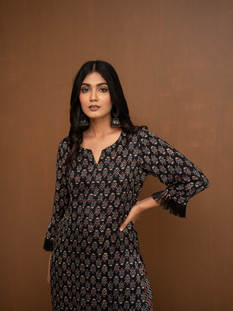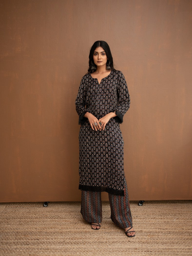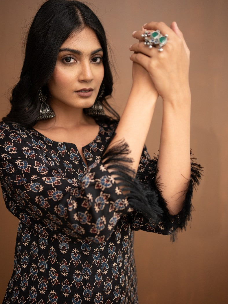 Swaroop Exclusive Design. Light up your diwali celebration with our exquisite Fulra kurta in Ajrakh print, embellished with a delicate silk thread tassel lace. Style this kurta with straight black pants or with our Zig-zag pants.
