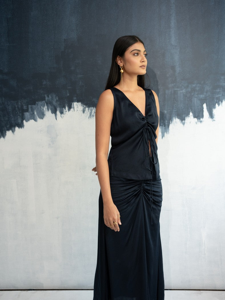 Swaroop Exclusive Design. Introducing Mori set, a striking ensemble designed to make you the center of attention. The top boast a deep V-Neck design and a sleeveless silhouette, exuding modern and chic look. It has front gathers and dori knot which adds a unique twist. The skirt, with its front panel gathers, creates an elegant and flowing effect. This versatile set is suitable for a casual brunch with friends or to make a grand entrance at a Diwali party.