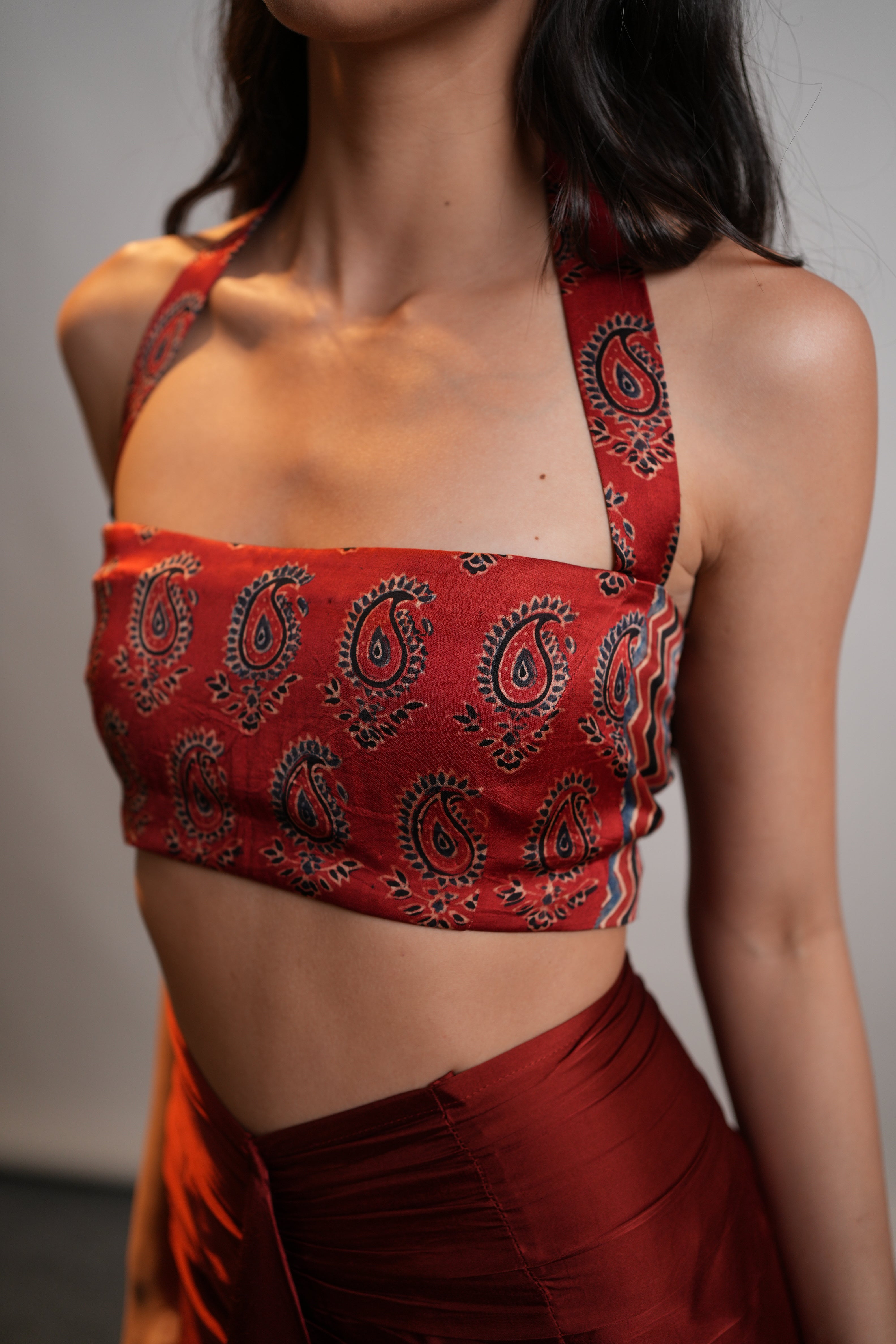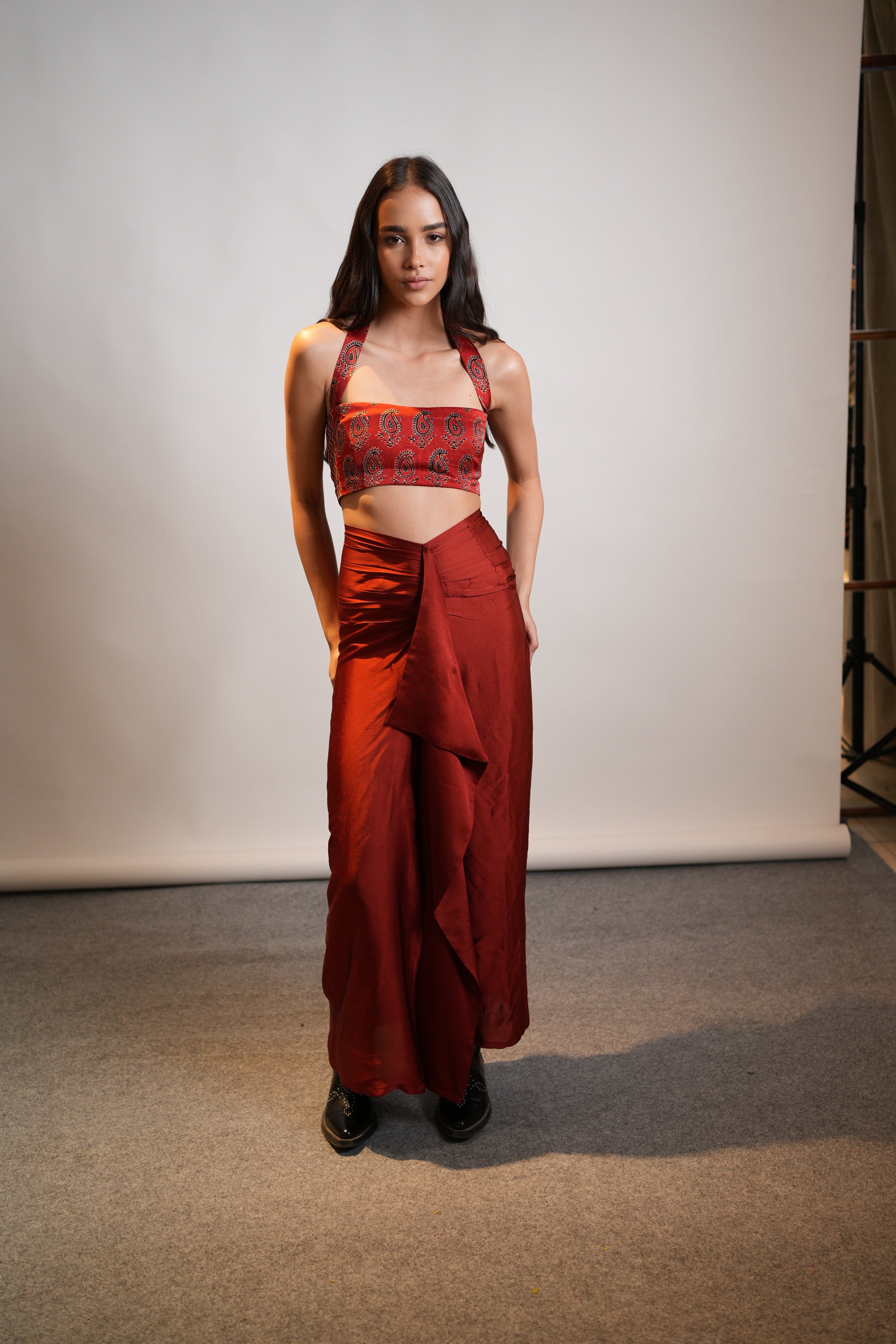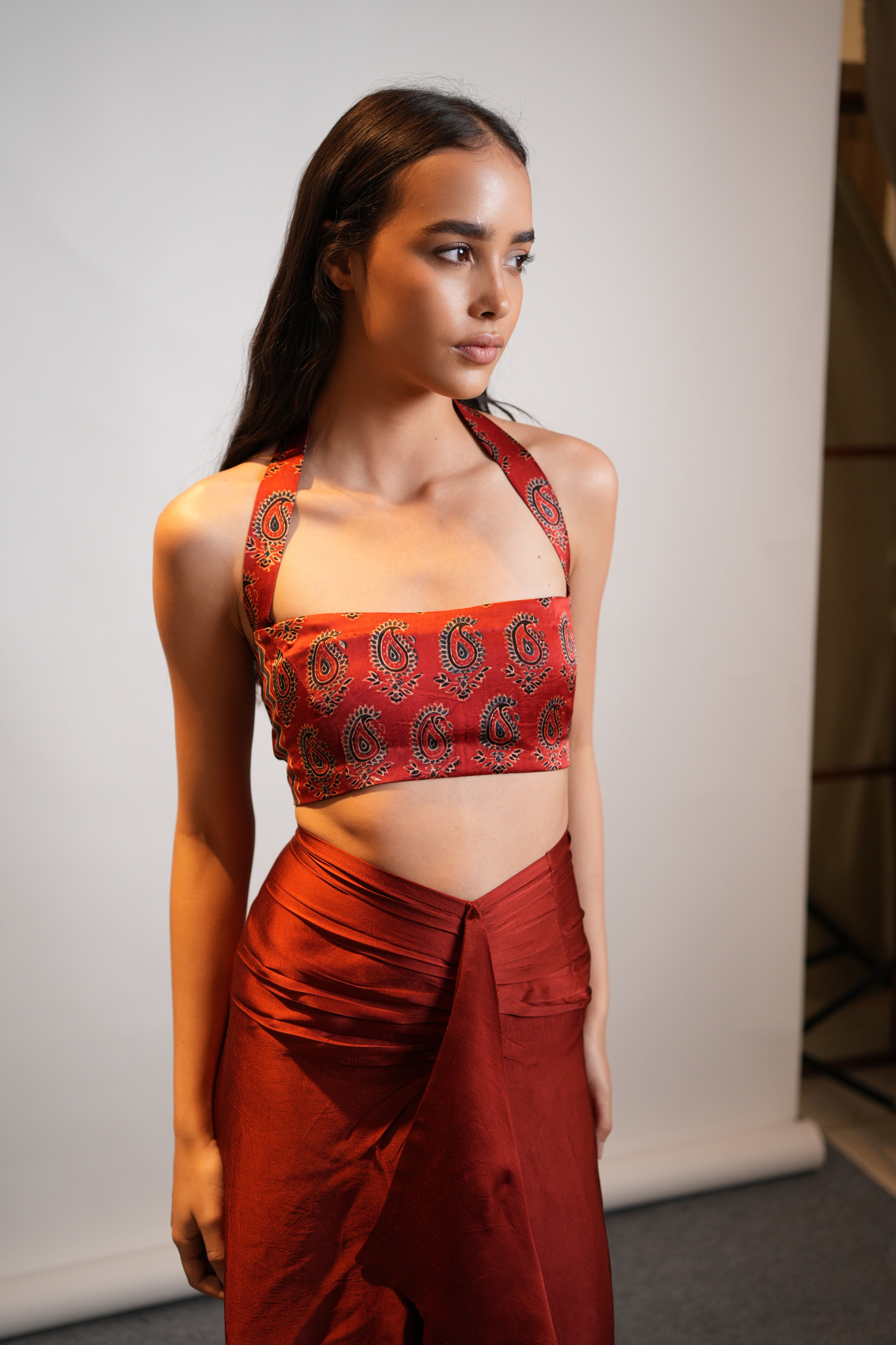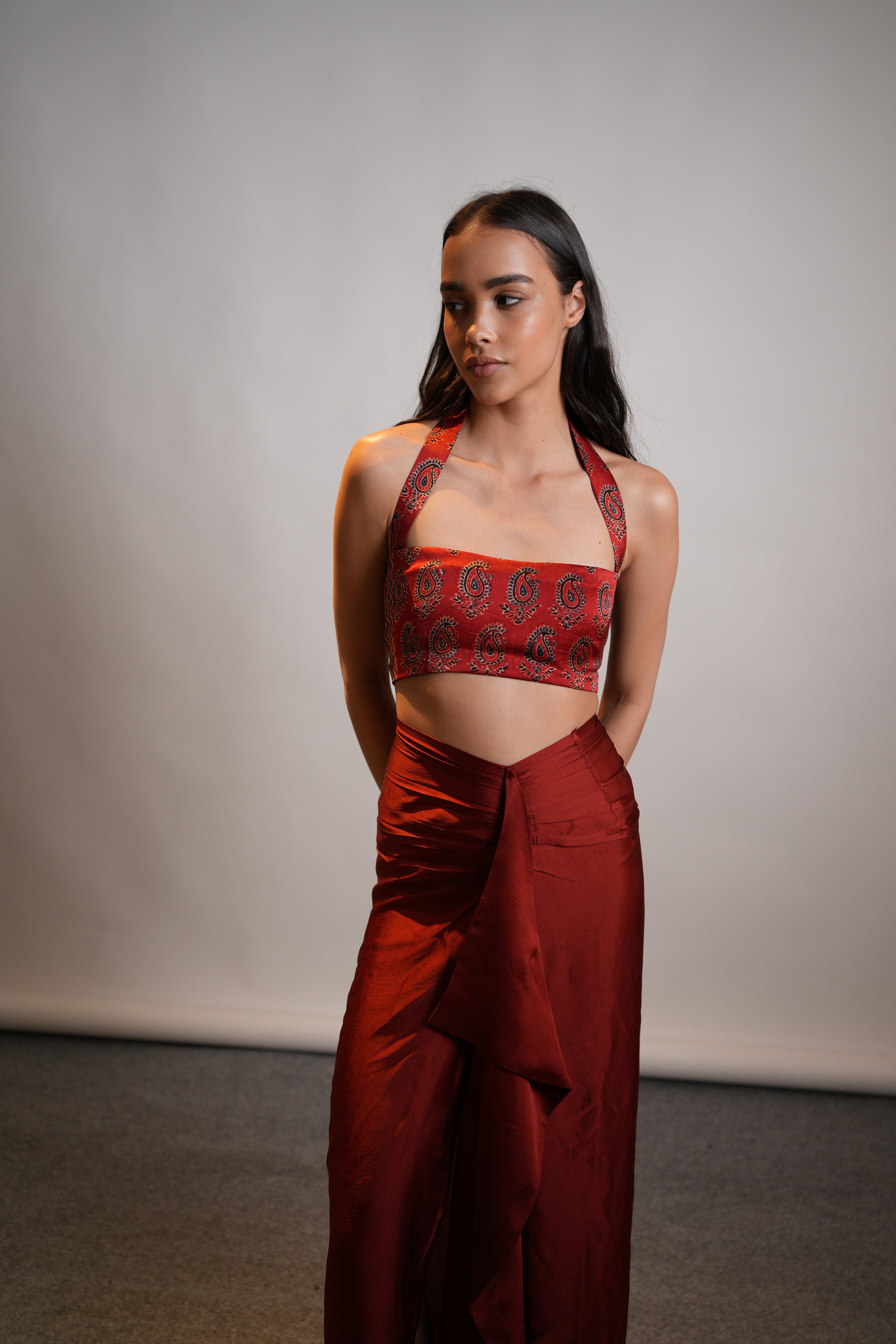 Introducing the Ambi Bustier & skirt set is a vibrant fusion of contemporary fashion and traditional Indian craftsmanship. The halter neck bustier is in rich modal satin fabric with back zipper. Paired with our draped satin skirt.