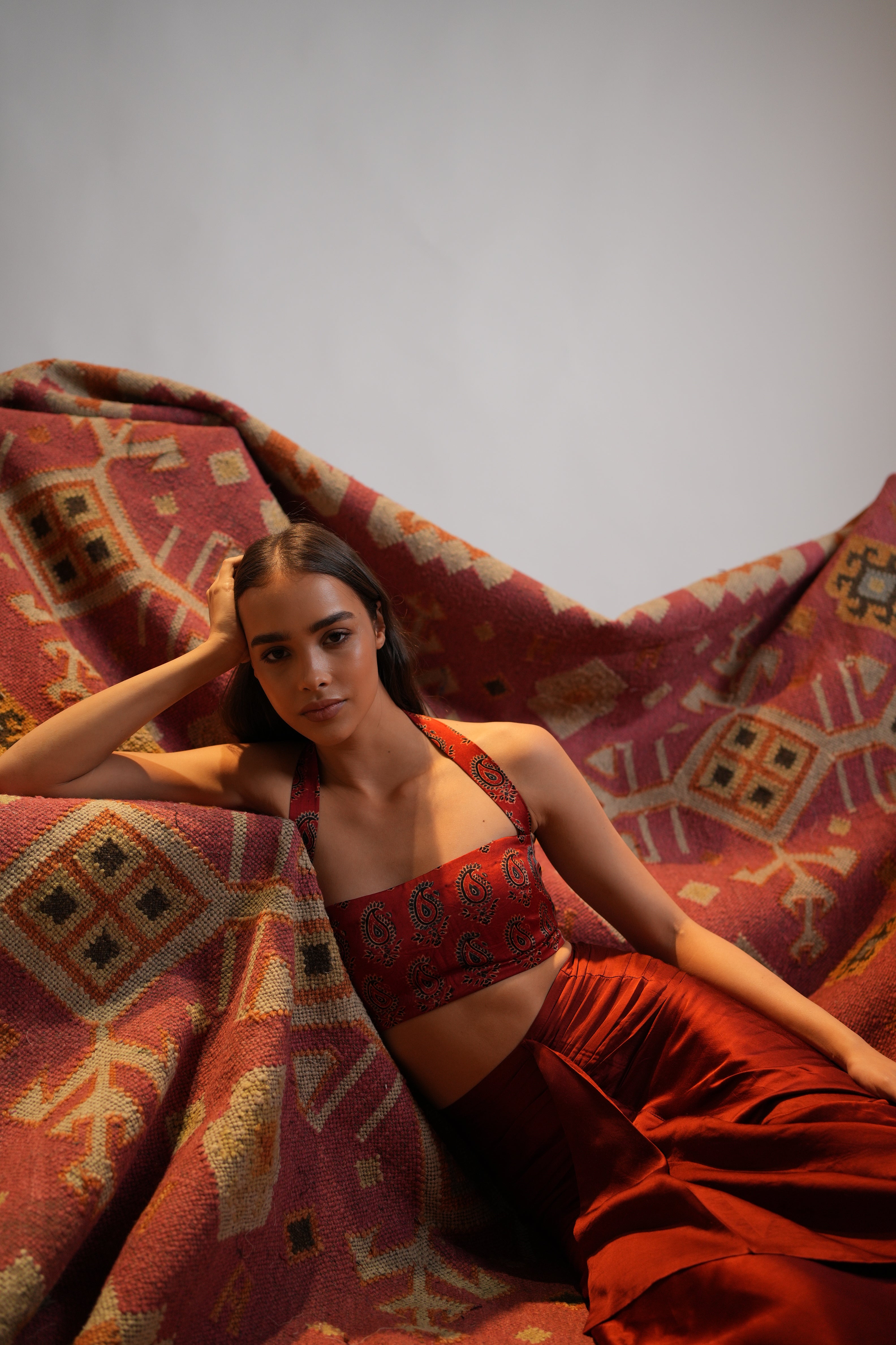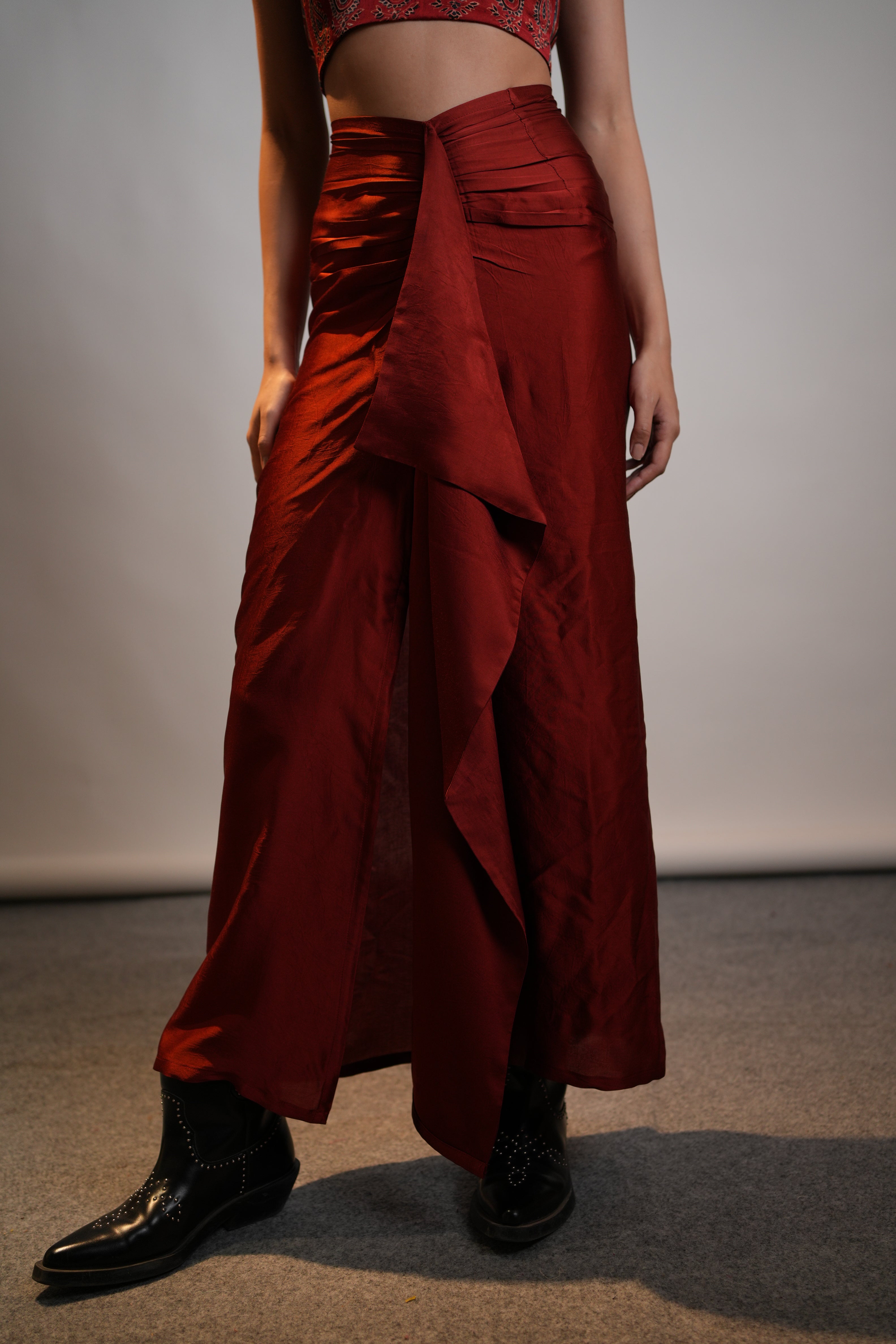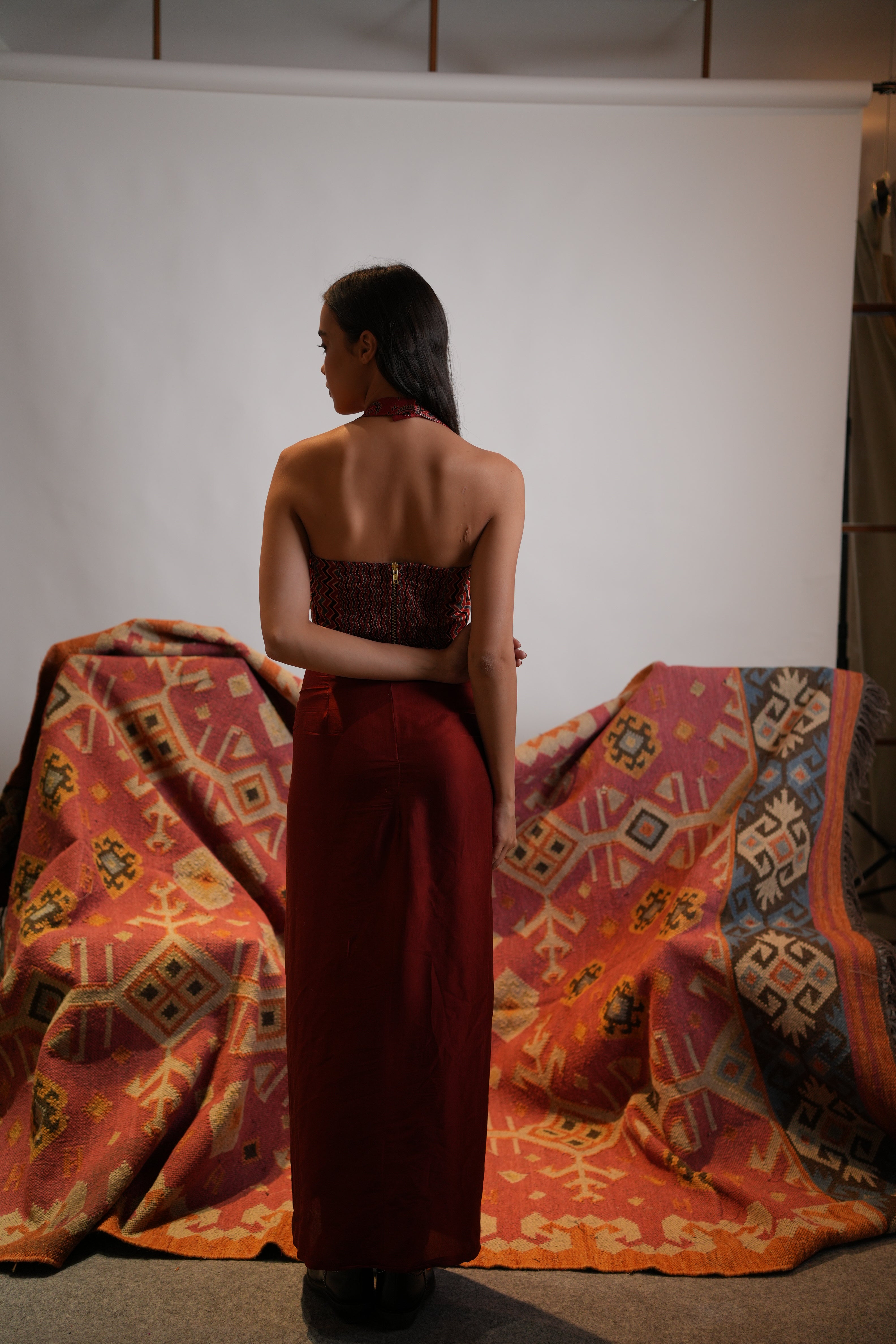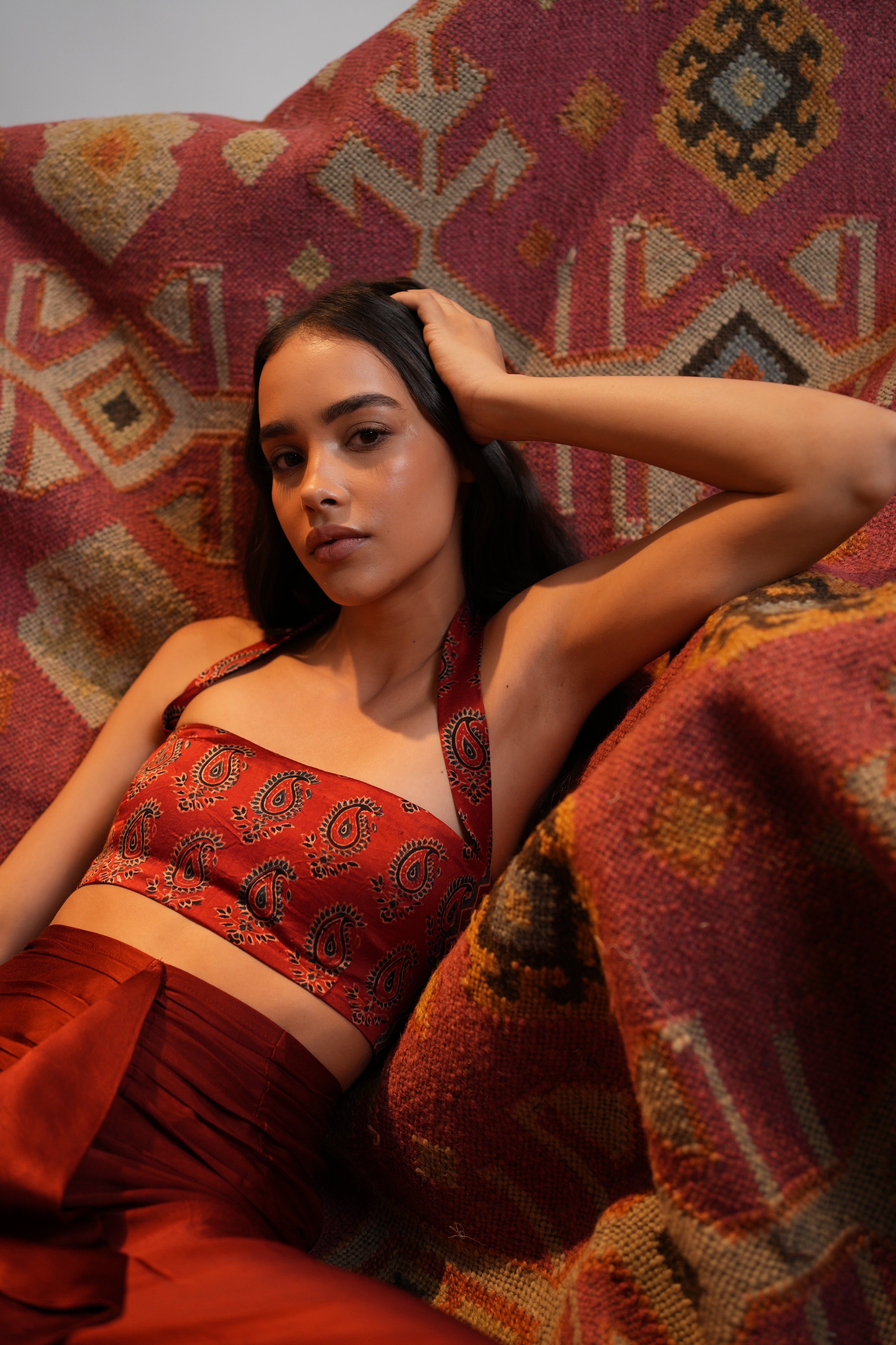 Introducing the Ambi Bustier & skirt set is a vibrant fusion of contemporary fashion and traditional Indian craftsmanship. The halter neck bustier is in rich modal satin fabric with back zipper. Paired with our draped satin skirt.
