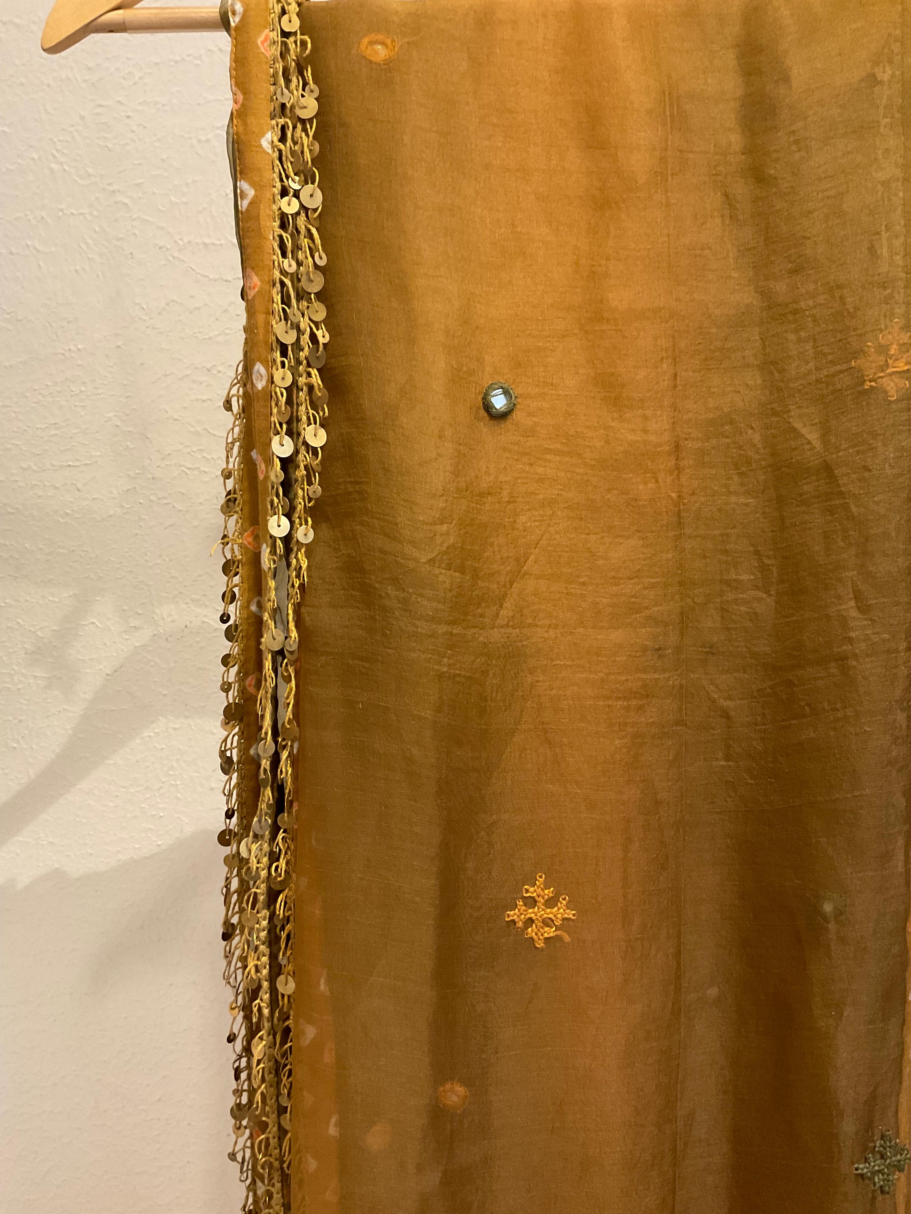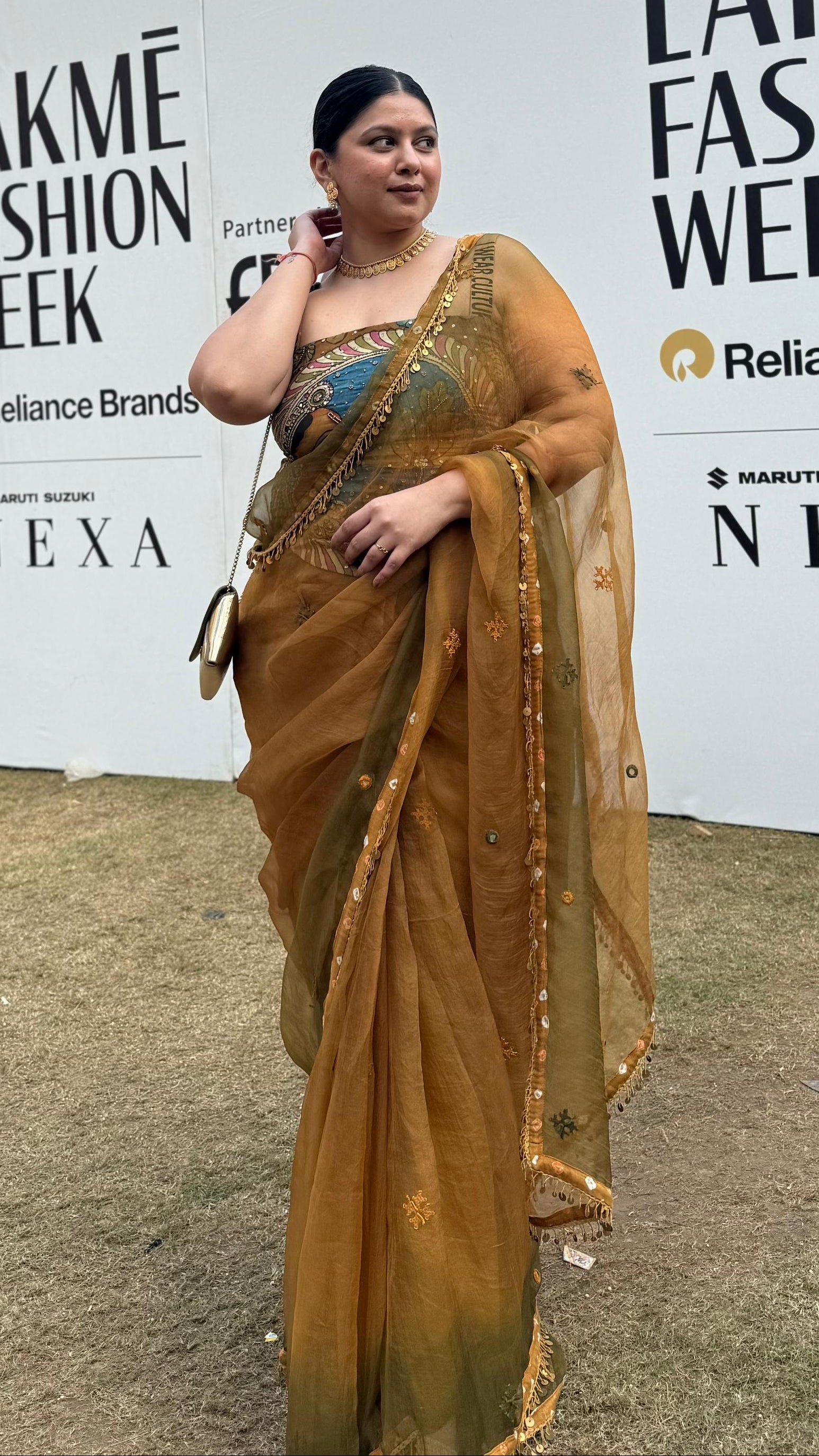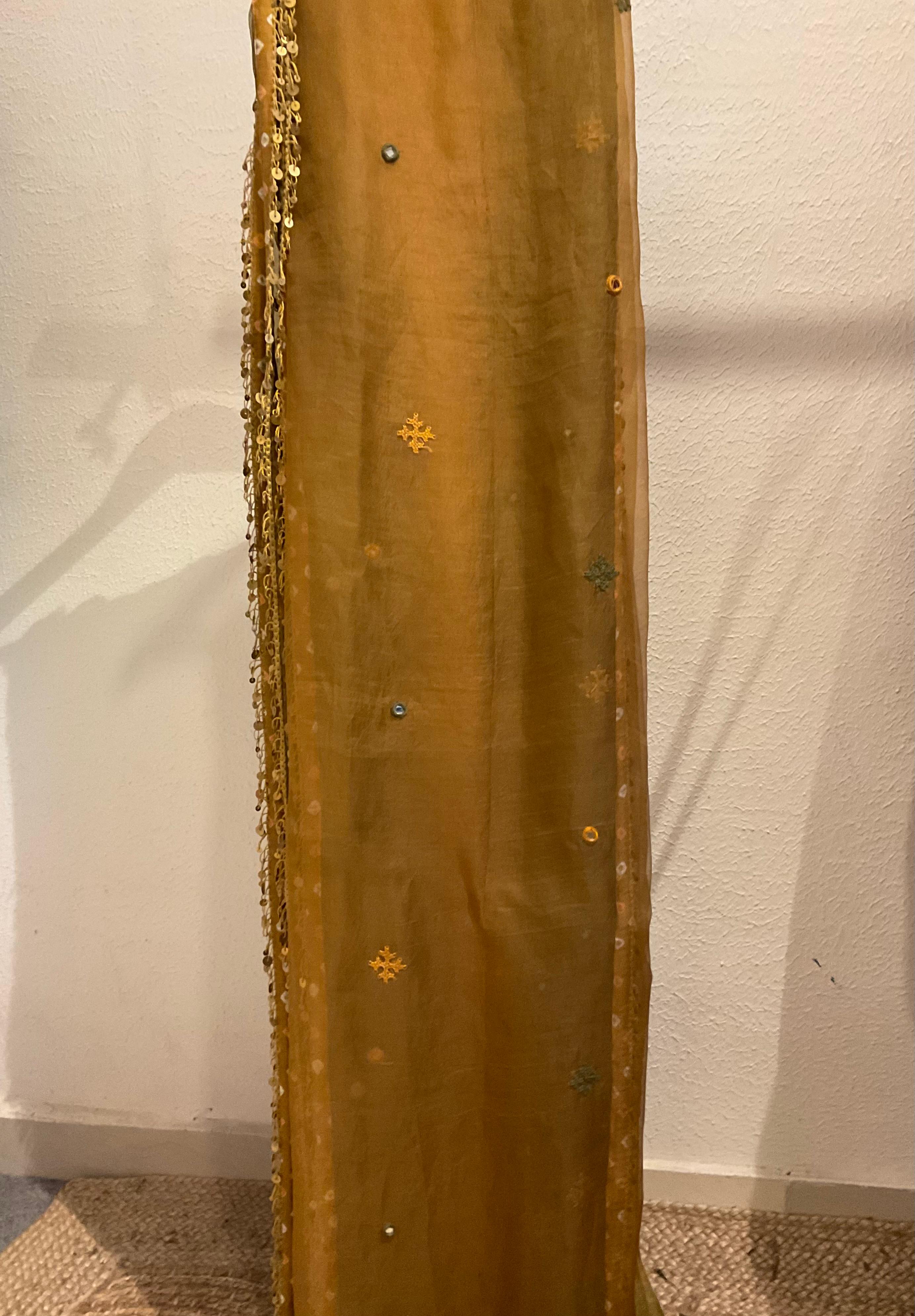 The Swaroop Exclusive Pure Organza Ombre Saree is elegant yet easy to wear. Crafted in lightweight pure organza, it features a soft ombre blend from mustard to green. Subtle Sindhi and mirror hand embroidery adds a handcrafted touch, while the sequin lace border lends a gentle shimmer. Perfect for festive occasions and intimate celebrations, this saree beautifully merges traditional craftsmanship with contemporary allure — a timeless drape for the modern muse.