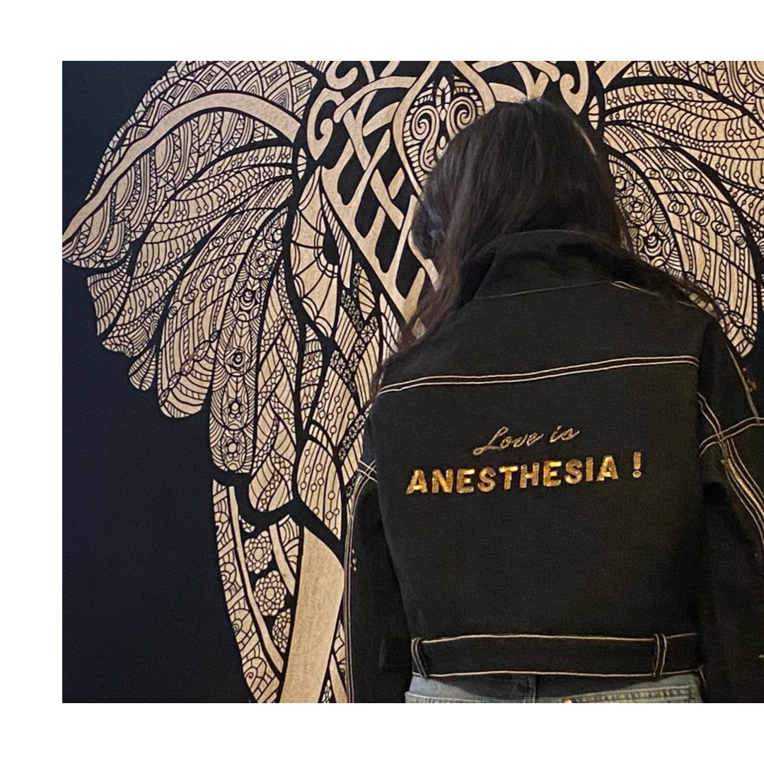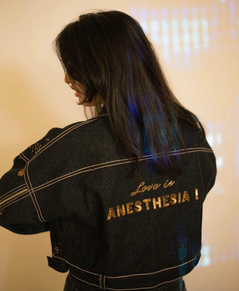 Swaroop Exclusive Design. One of a kind LOVE IS anaesthesia jacket . The jacket is inspired from the my friends poem. The intricate embroidery with katdana and sequence hand embroidery.