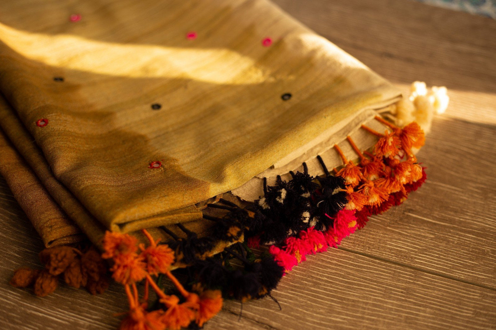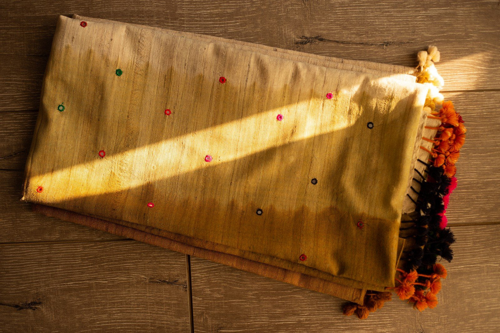 Swaroop Exclusive Design. Handloom ombre l stoles in pure silk/wool base have been hand-woven by the weavers of Bhujodi, Gujarat using their traditional techniques passed down from generation to generation. Adorned with colourful mirror work and handmade tassels.