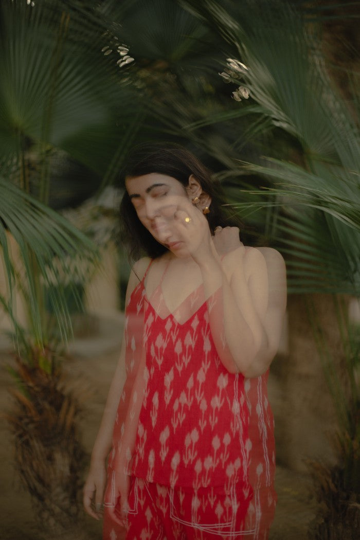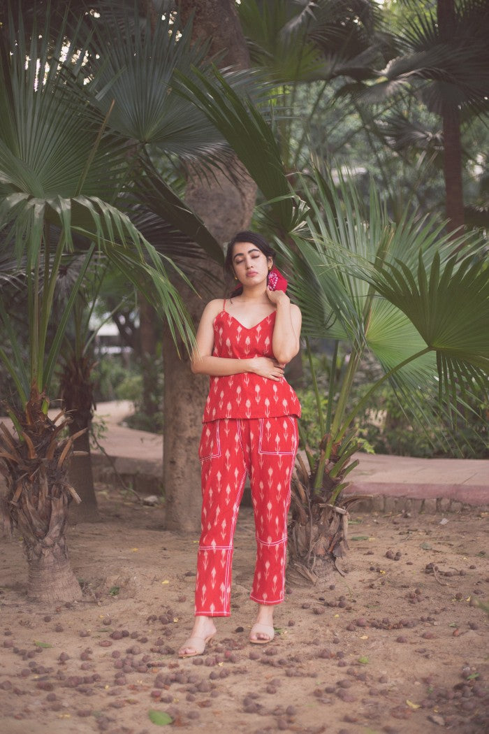 Swaroop Exclusive Design. The Ikat Top is a noodle strap top in cotton Handloom Ikat. The fabric is woven by the weavers of Andhra Pradesh and keeps you cool in summers. Every outfit from this collection has a unique small hand embroidered message on the inside of the outfit for the client to boost their positivity.