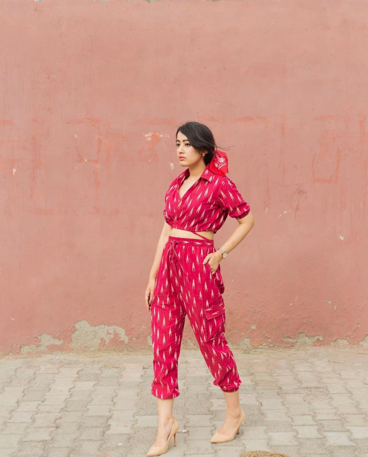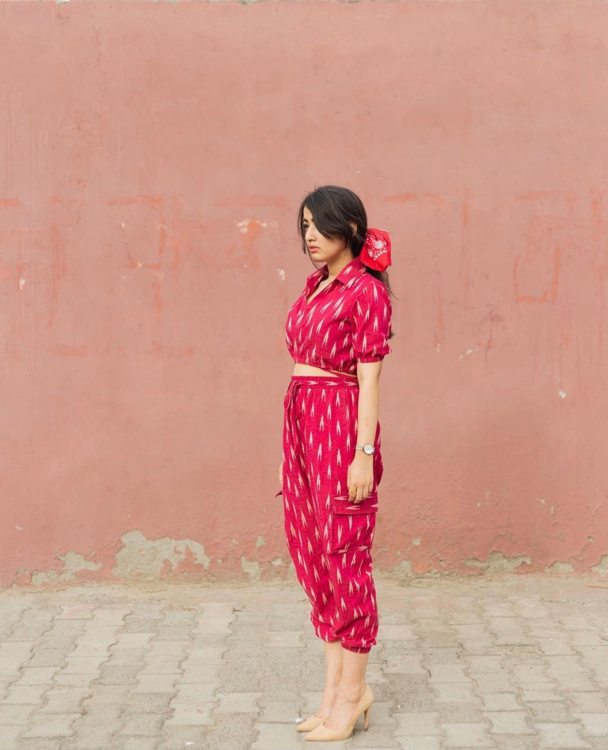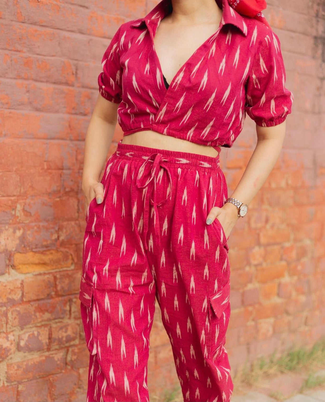 Swaroop Exclusive Design. Featuring an Indie Jogger. It is a fusion between Handloom Ikat weaves and modern silhouettes. Comfortable yet stylish, perfect for a laid back day at home or a zoom meeting.