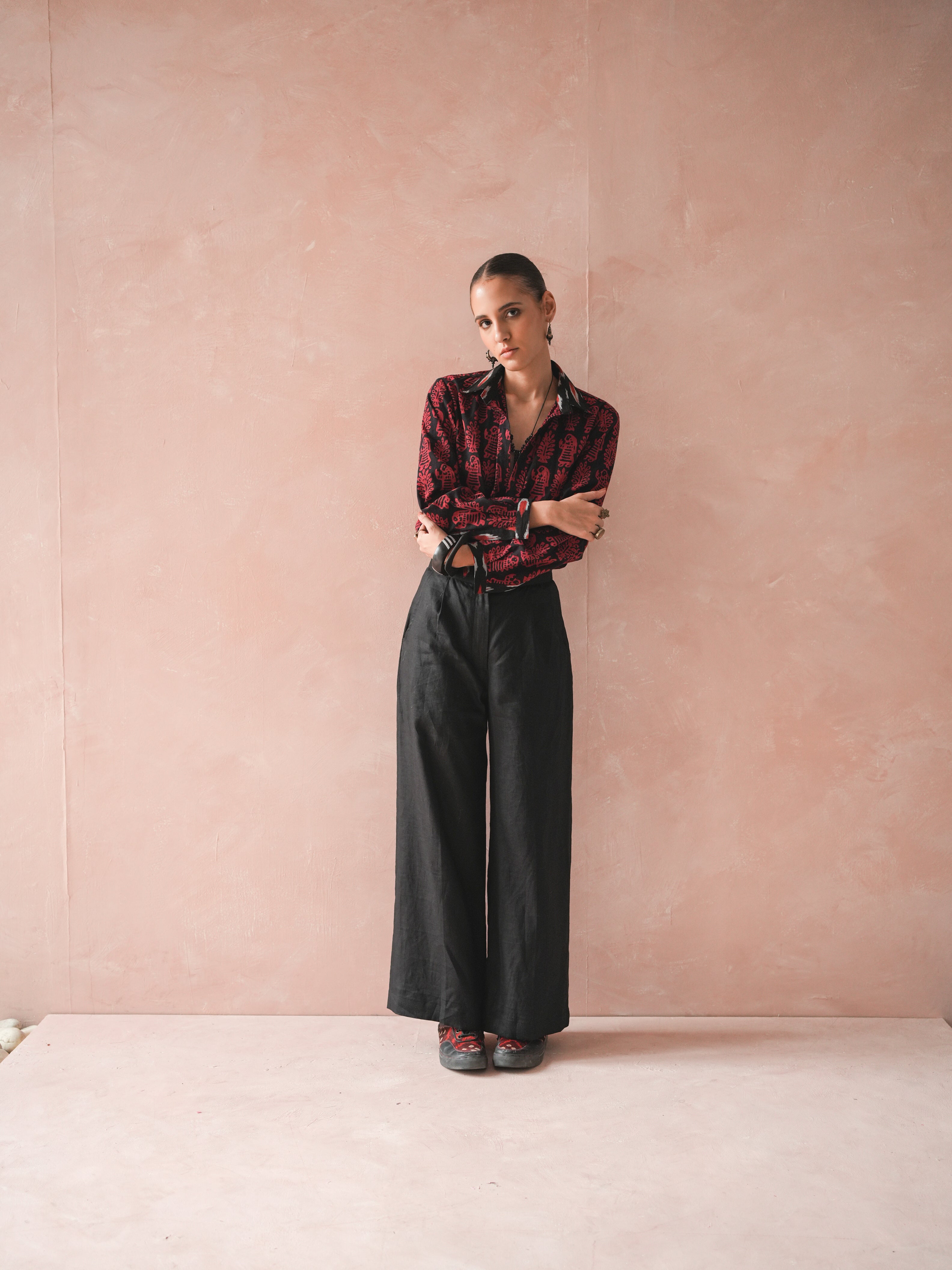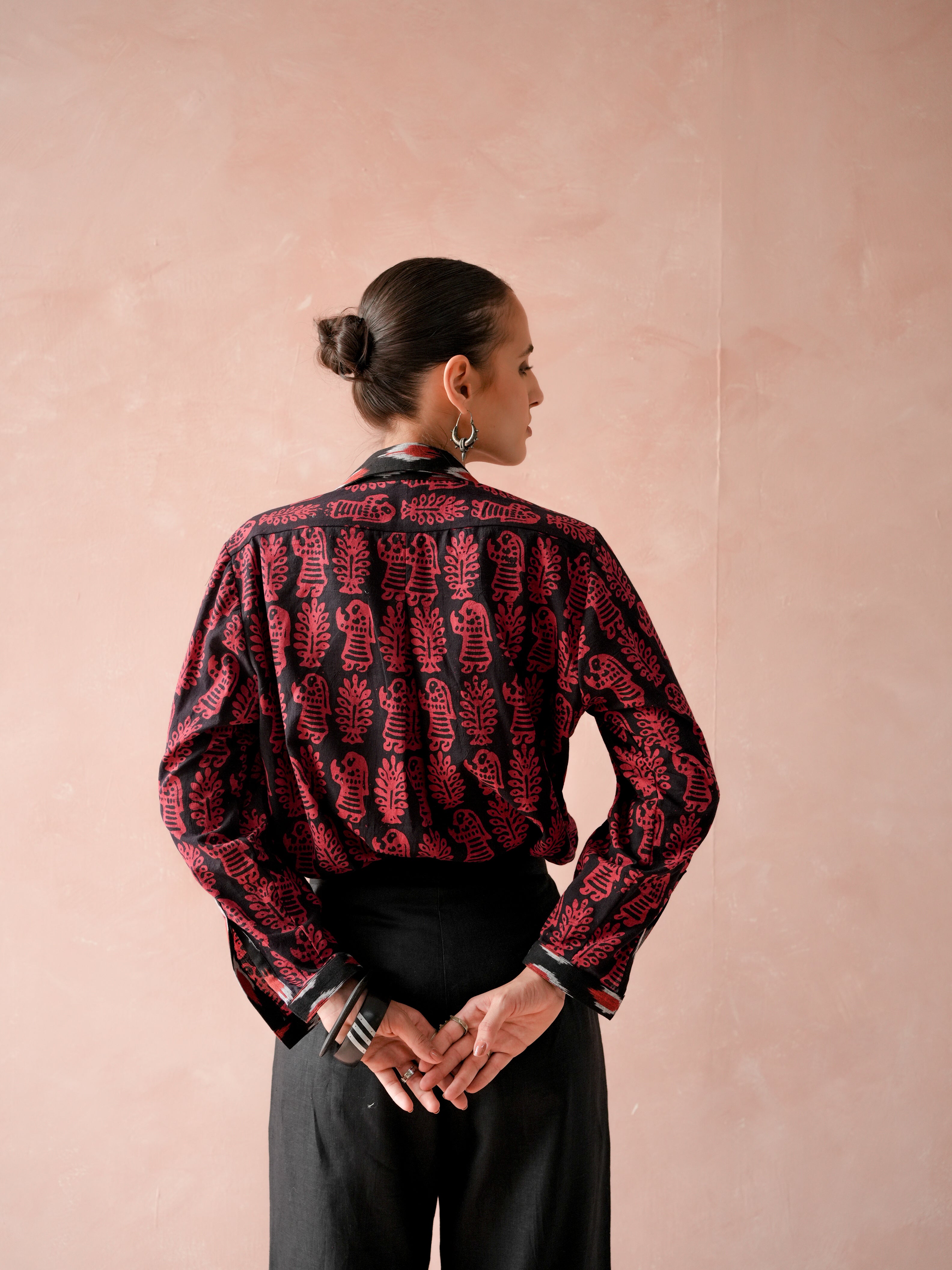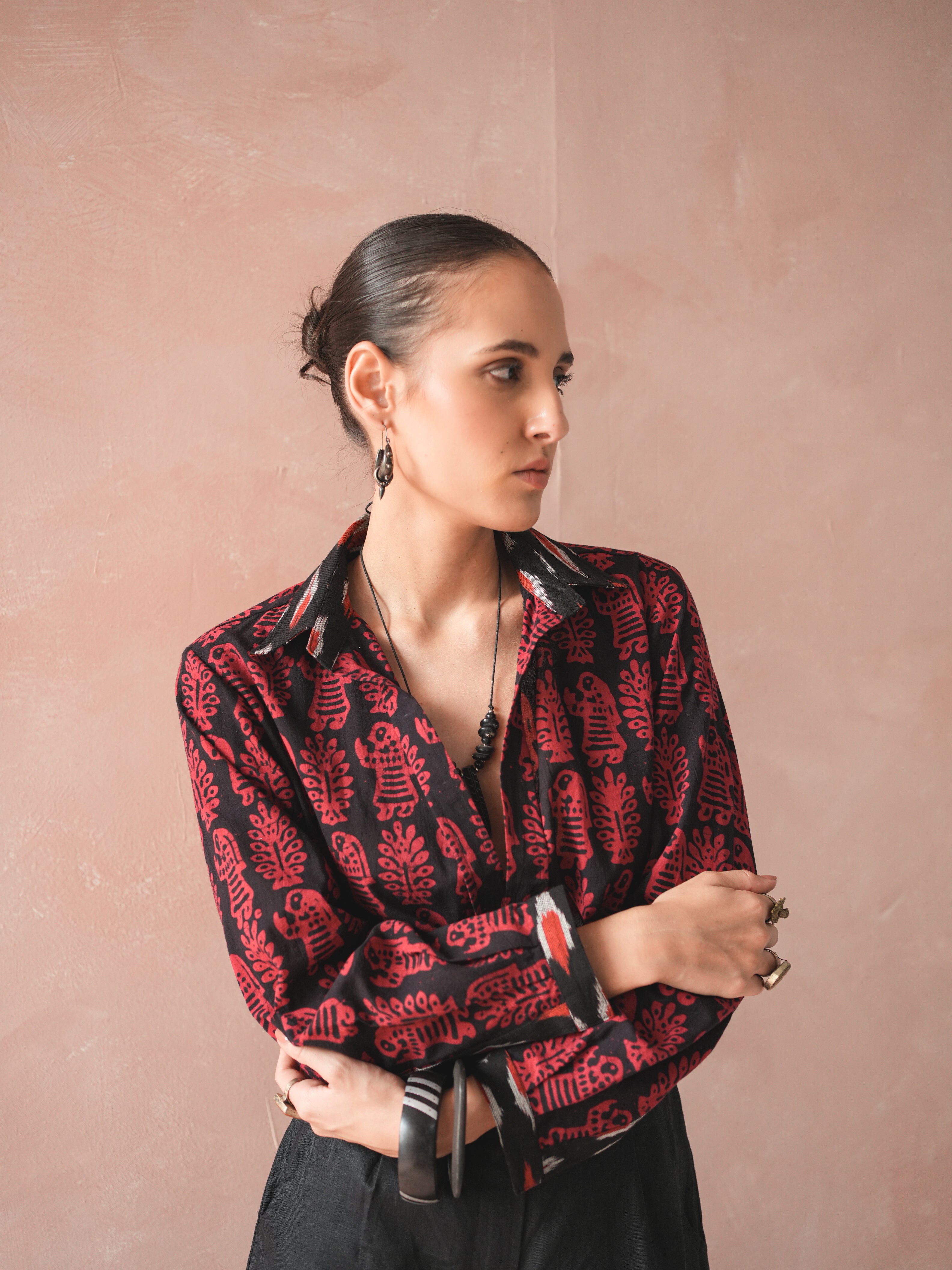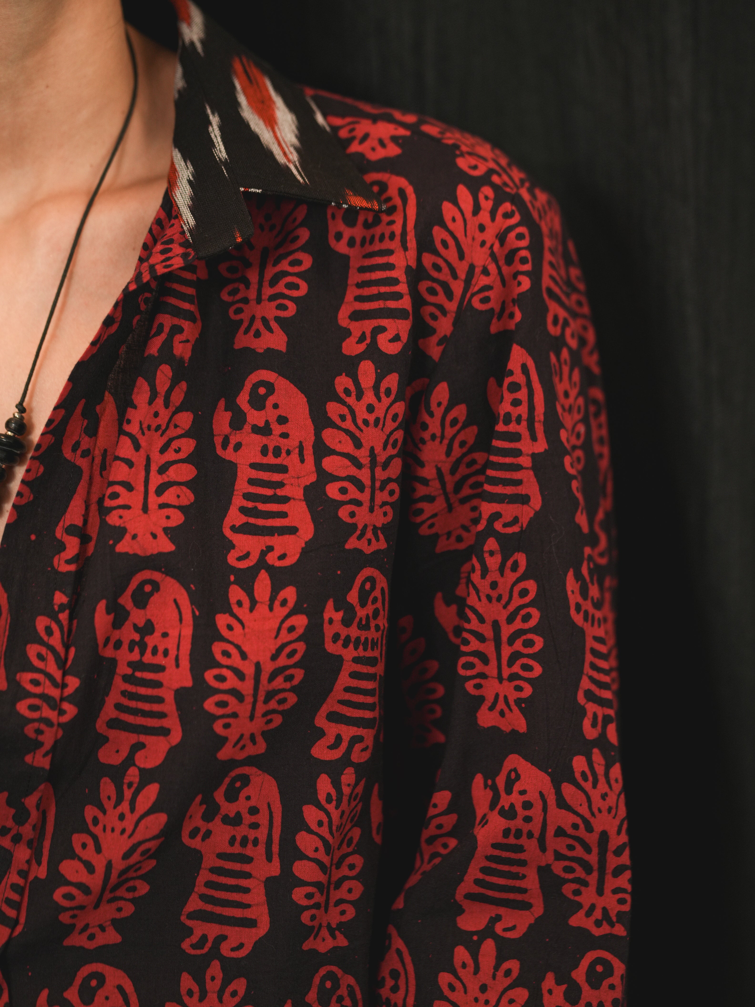 Swaroop Exclusive collection Introducing the Red & Black Geru Batik Cotton Shirt—crafted from lightweight, breathable cotton. This shirt features a vibrant wax batik Farm Lady motif, intricate with delicate ikat detailing on the sleeve and 1''cuffs, placket, and collar.
