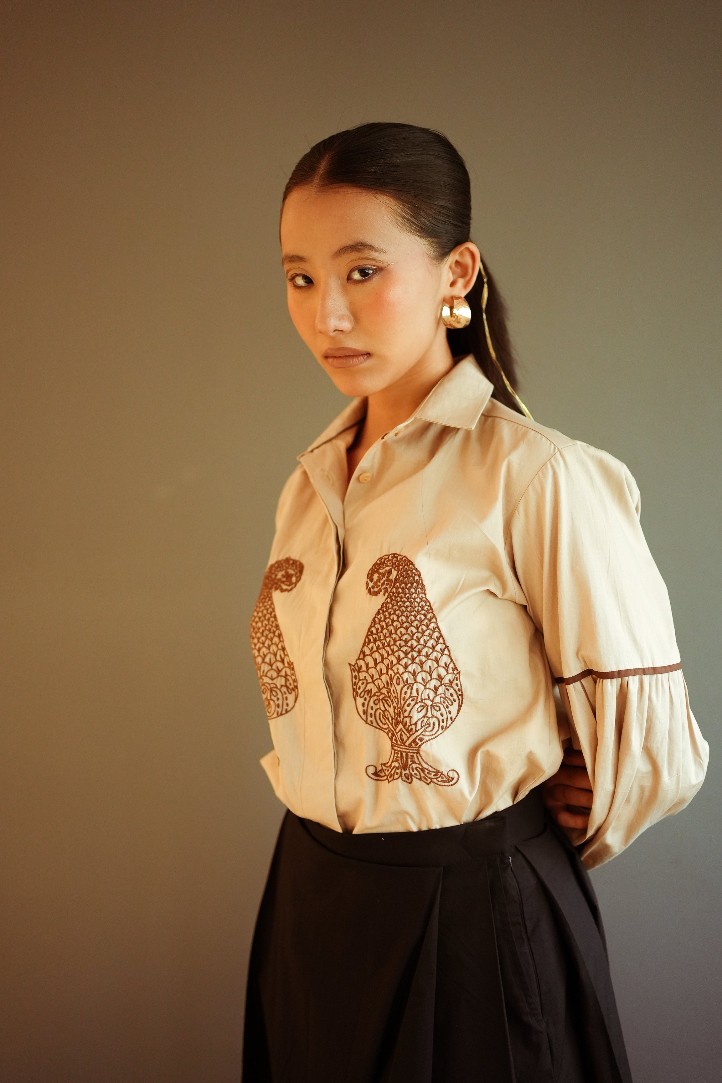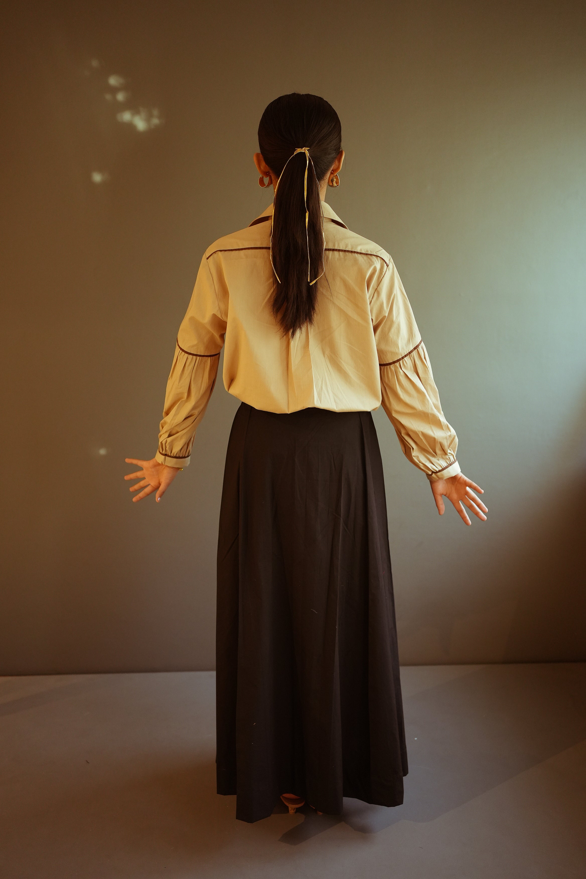It boasts a shirt collar with a concealed placket, while the sleeves are delicately gathered with intricate piping detail. Pair it with our box-pleated skirt or any other trousers for a flawless ensemble.