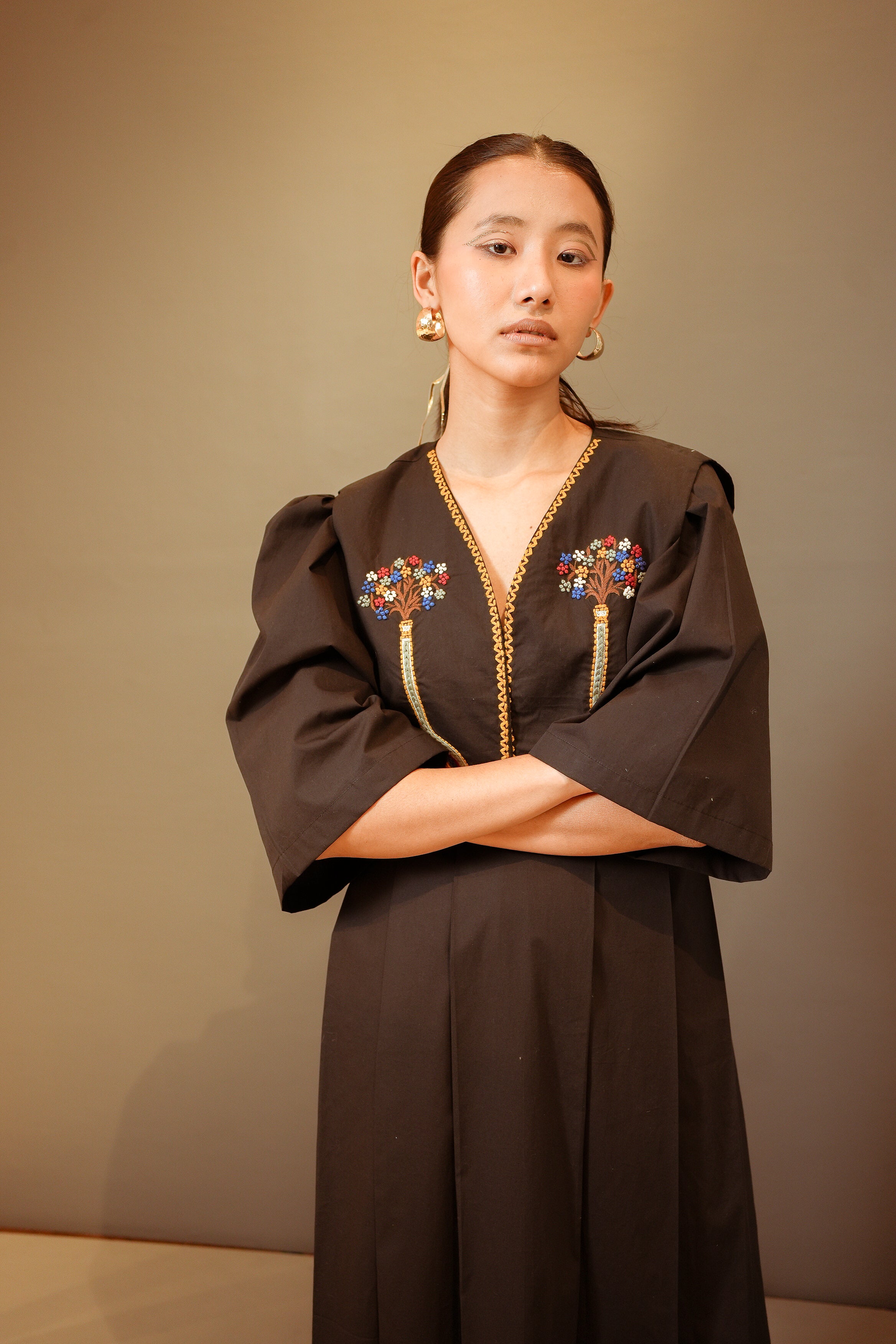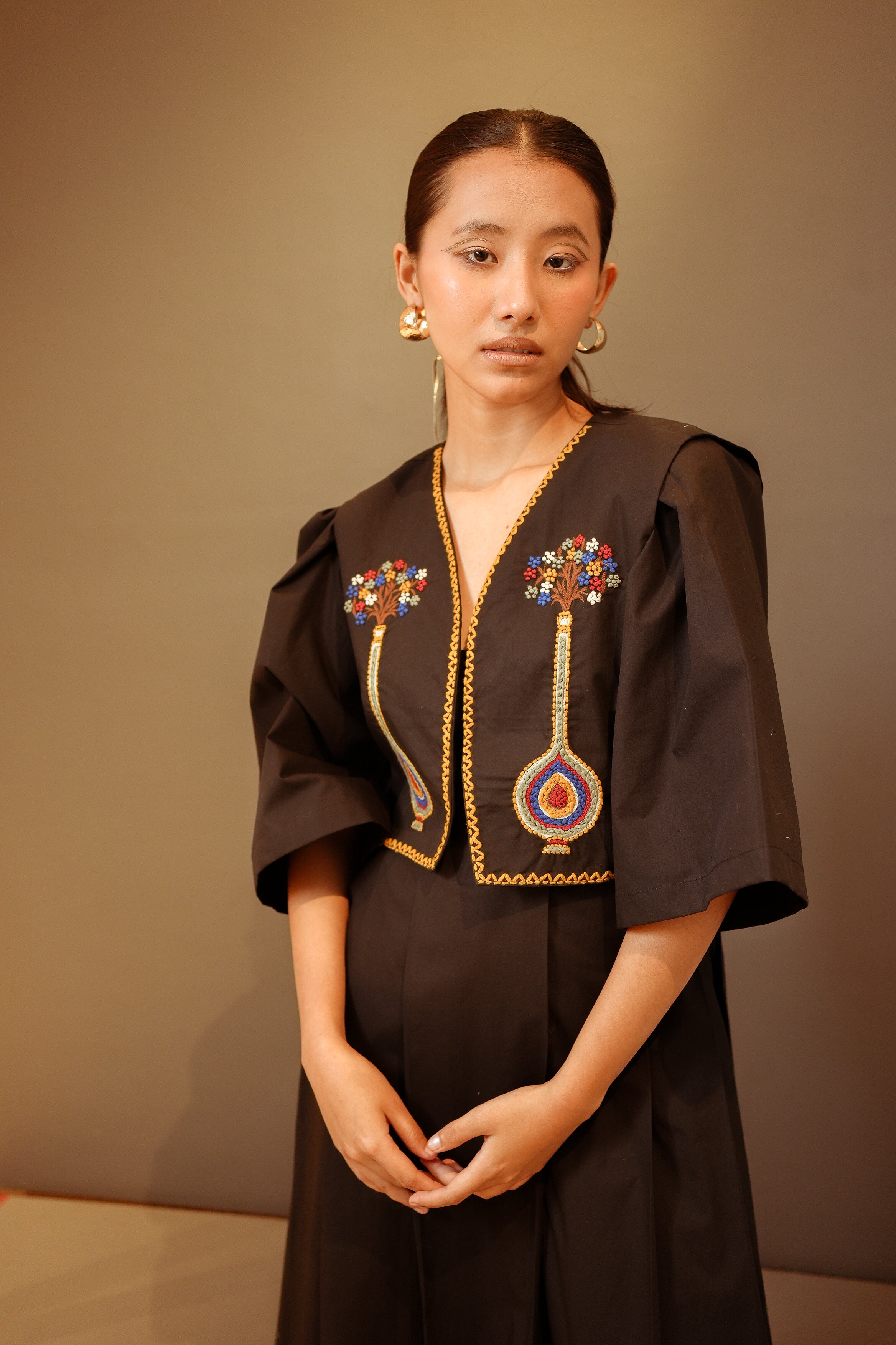Swaroop Exclusive Collection. Introducing our hand-embroidered cotton jacket, featuring a stunning matka motif crafted on the front. This vibrant piece adds a burst of color to elevate any outfit.
