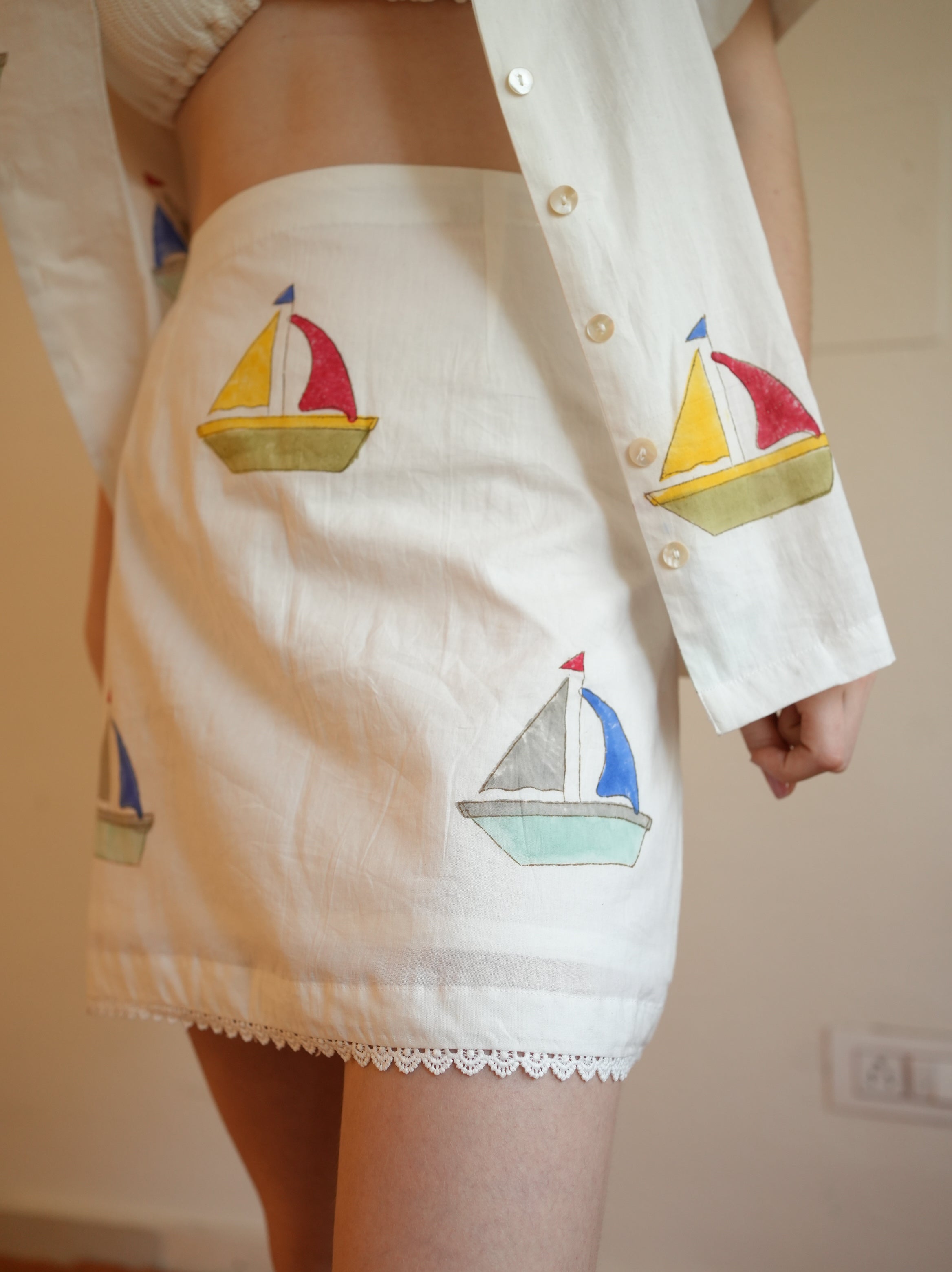 Set sail in style with the Boat Skirt, a high-waisted skirt that combines playful design with effortless elegance. This block-printed skirt features a charming boat print, adding a whimsical touch to your summer wardrobe. The invisible side zip fastening ensures a seamless fit, while the delicate lace at the hemline provides a chic finish.