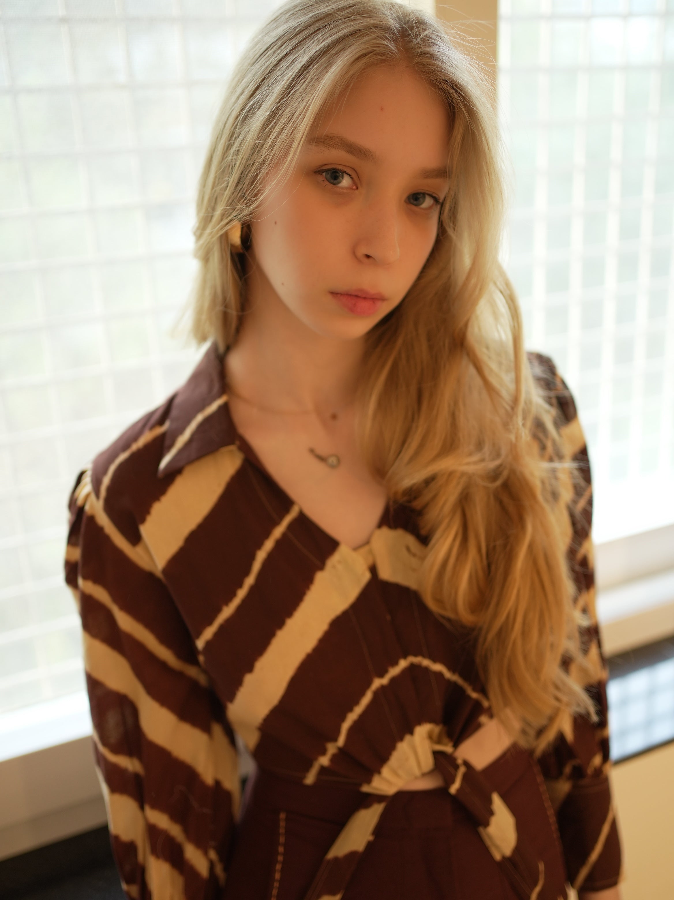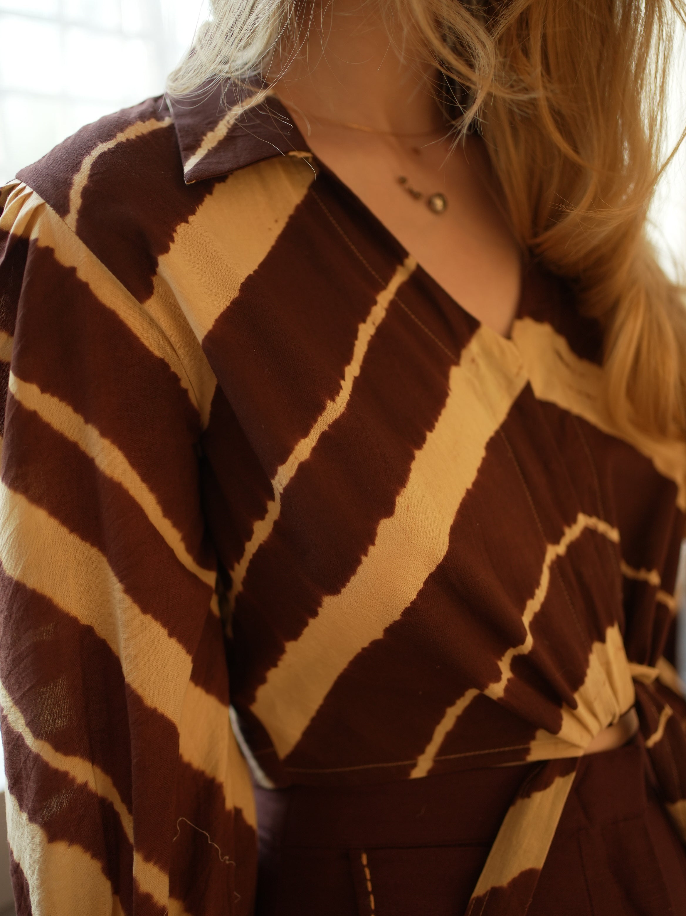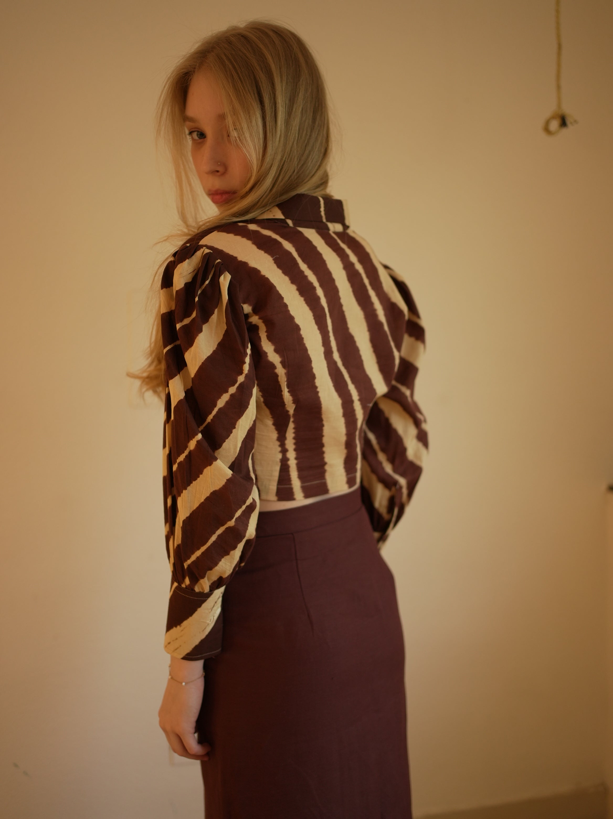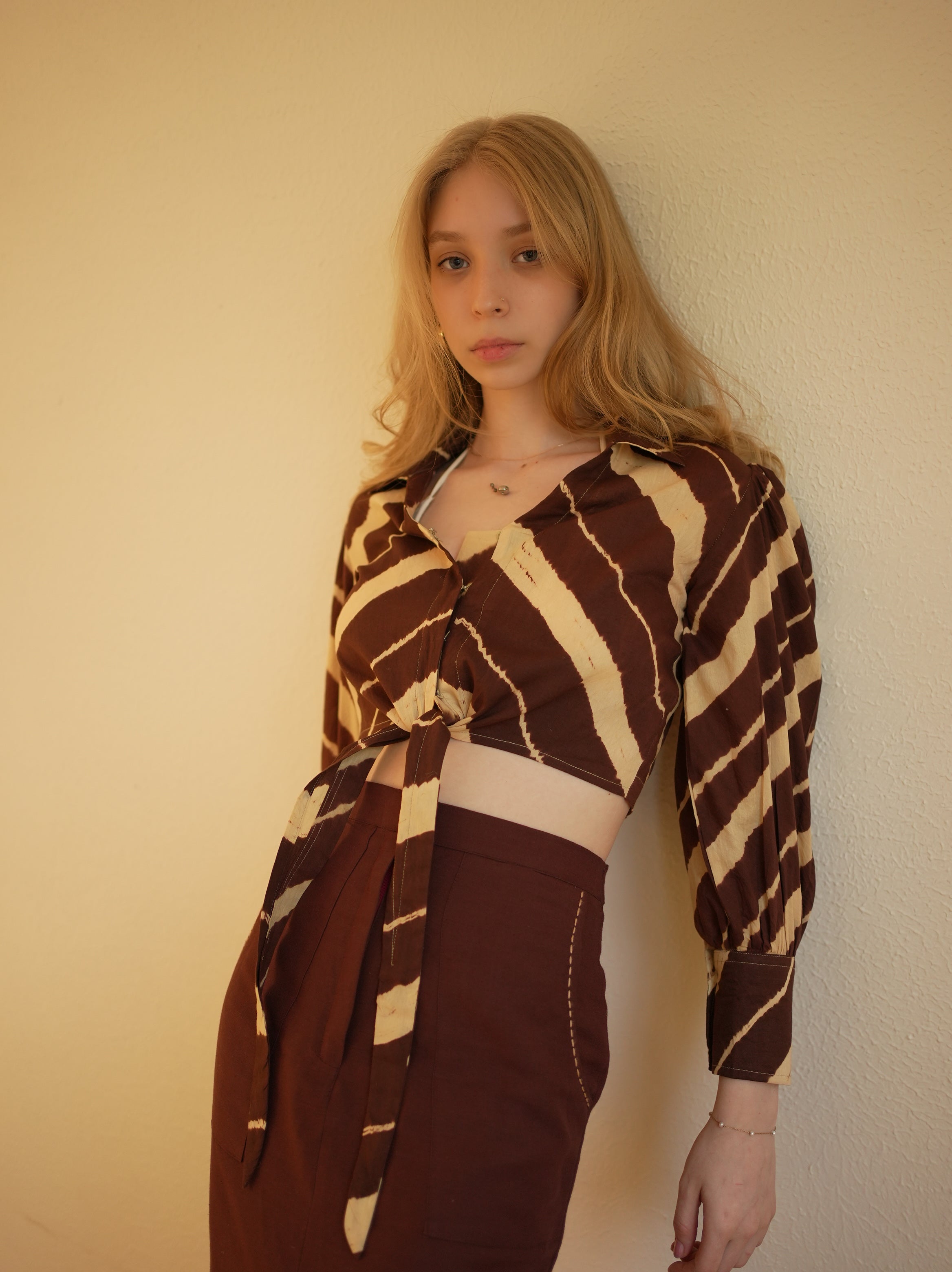 Swaroop Exclusive Collection. Featuring Leheriya shirt in a brown & beige hue, crafted from cotton fabric. Designed with a hidden placket and puffed sleeves featuring thick cuffs. The cropped front knot style adds a trendy twist, making it a must-have for the season.