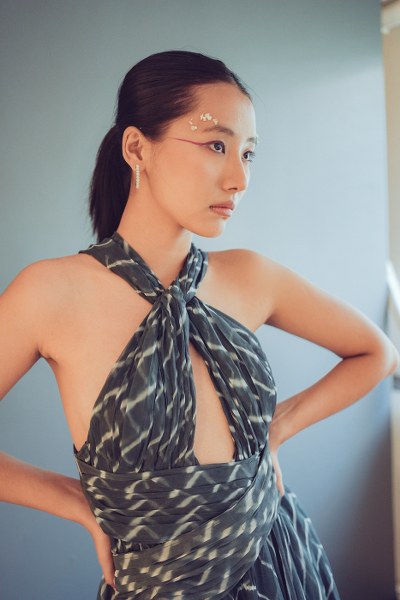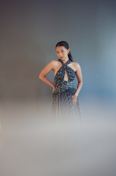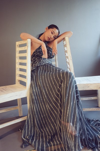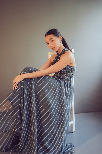 Swaroop Exclusive Collection. Introducing Leheriya gown, draped in a grey hue and with traditional Leheriya patterns. Crafted from chiffon fabric, it boasts a halter neckline. With its maxi length and flowy silhouette, it exudes effortless elegance. Designed for utmost convenience, it features a discreet side zip closure.