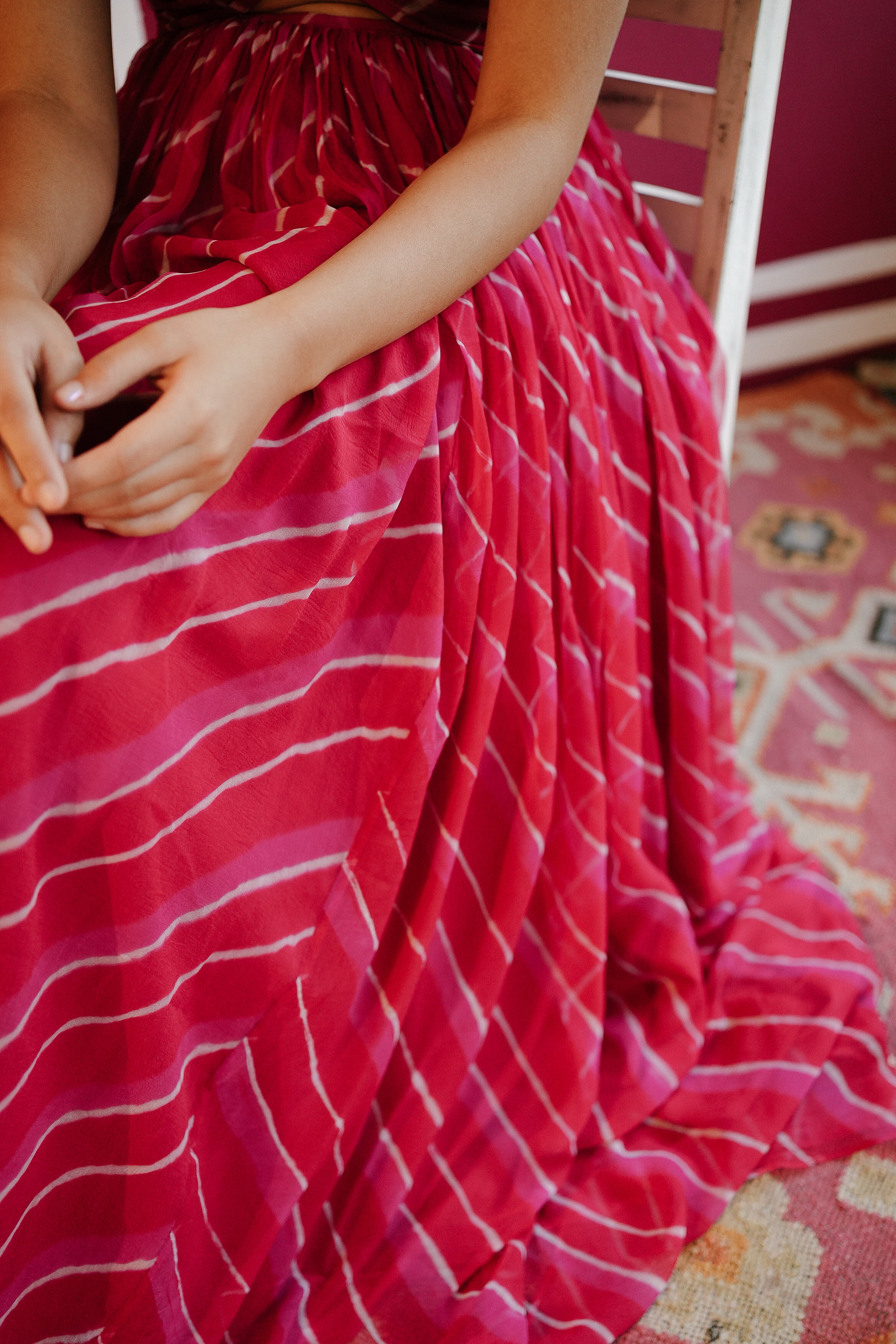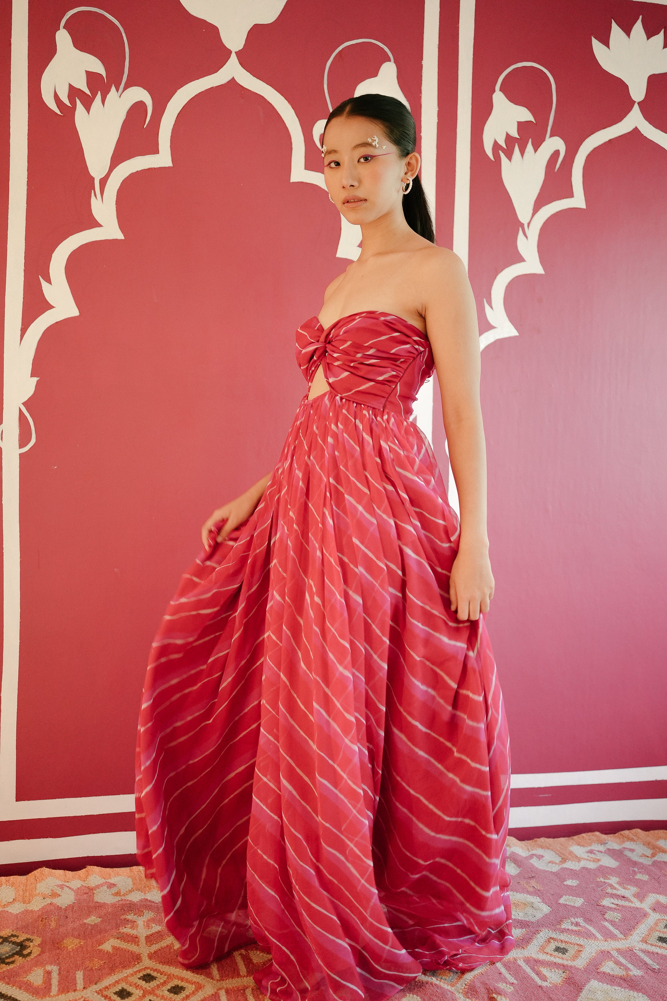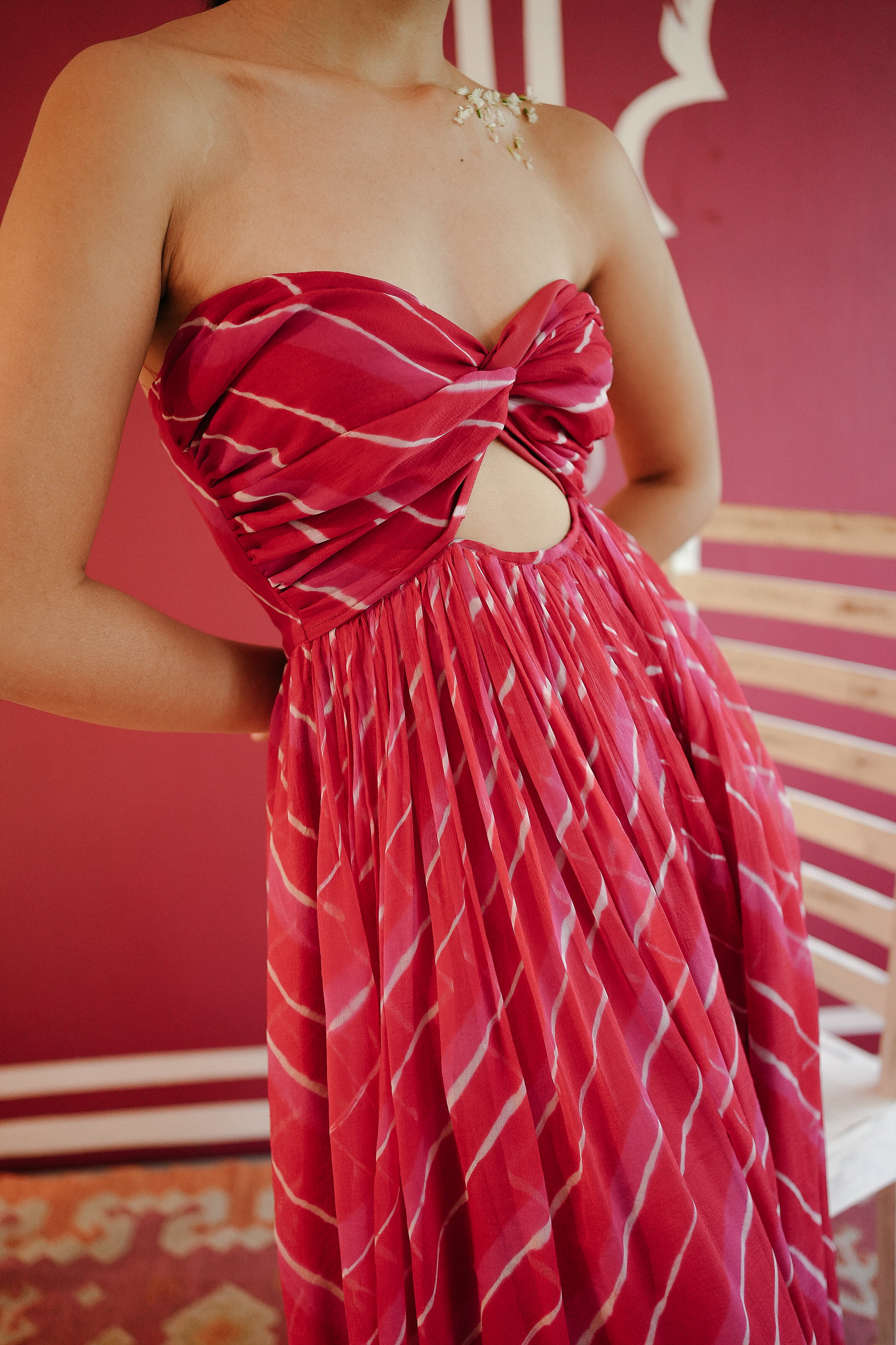 Swaroop Exclusive Collection. Featuring "Gulmohar gown" showcasing a stunning Leheriya pattern in pink and red hues, crafted from chiffon fabric. Featuring a chic tube neckline, this maxi-length dress boasts a flowy silhouette, exuding effortless elegance. Designed for ultimate convenience, it includes a discreet side zip closure.