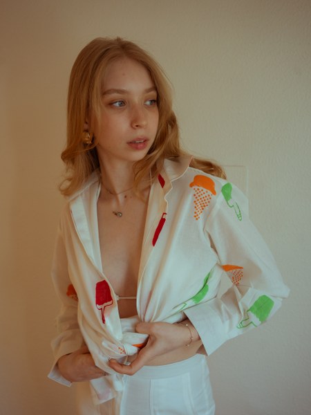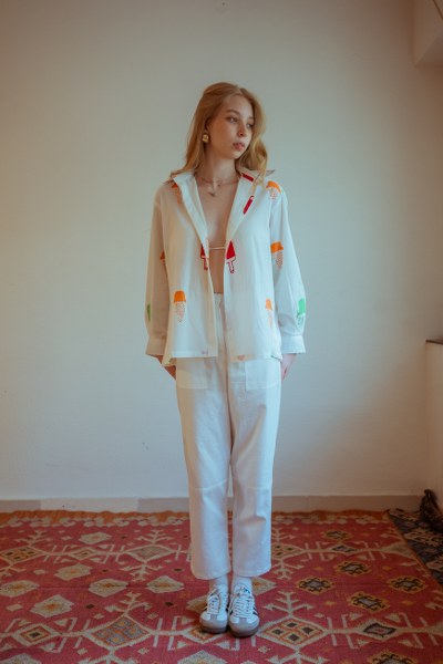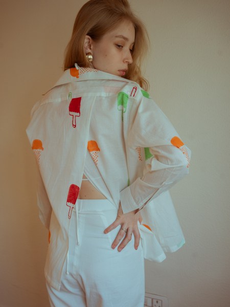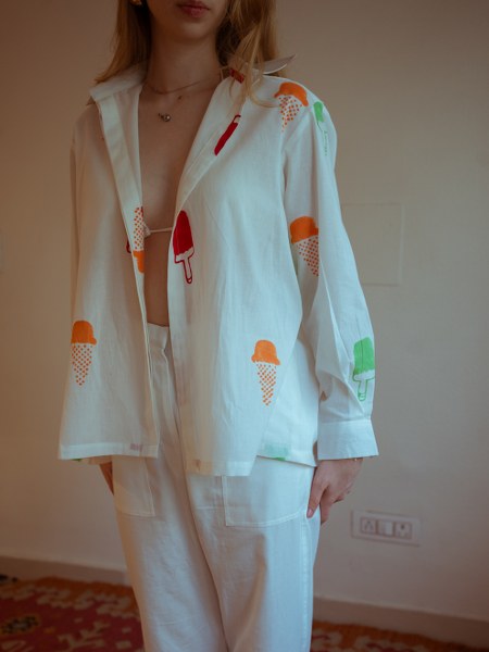 Swaroop Exclusive Design. Introducing the Ice Cream Shirt, a summer-friendly and lightweight addition to your wardrobe. Made from 100% cotton, this block-printed shirt features a quirky ice cream print that embodies the spirit of fun and relaxation. The design includes a back flap detail, a classic collar, and full sleeves.