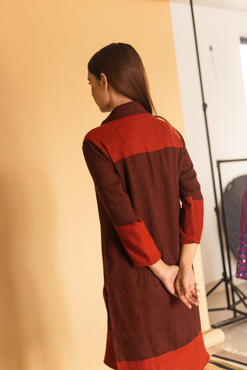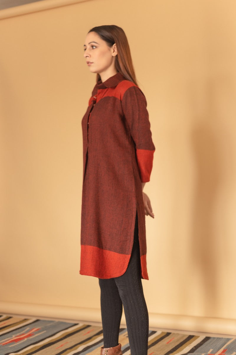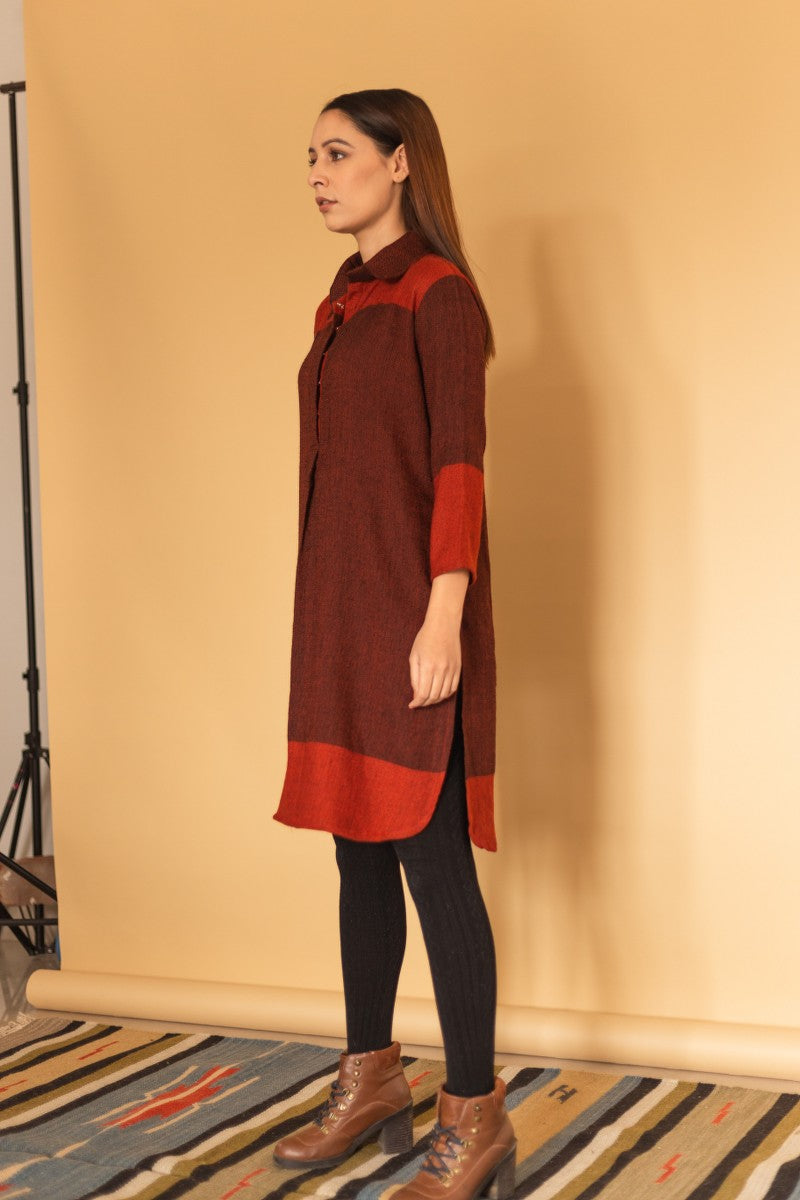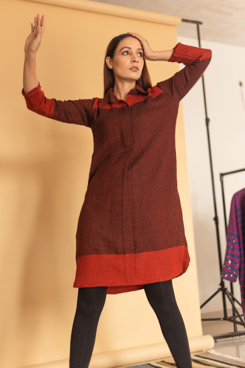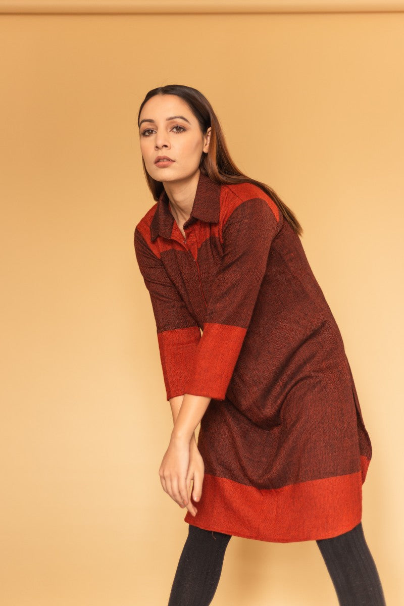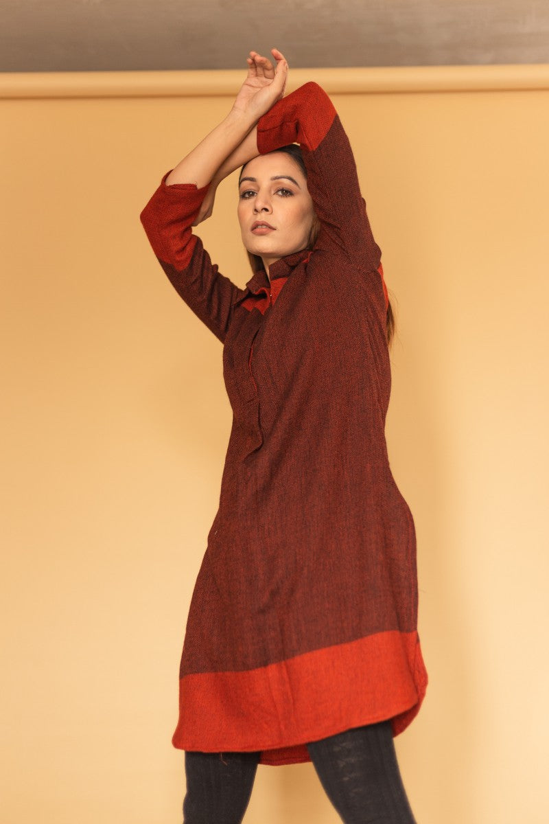 Swaroop Exclusive Design. The name is a marriage between Indian textile and casual wear fashion. The fabric is handwoven by the weavers of Kullu, Himachal Pradesh. Defined with  dual color and circular hem, makes perfect to wear it for winter festivals!