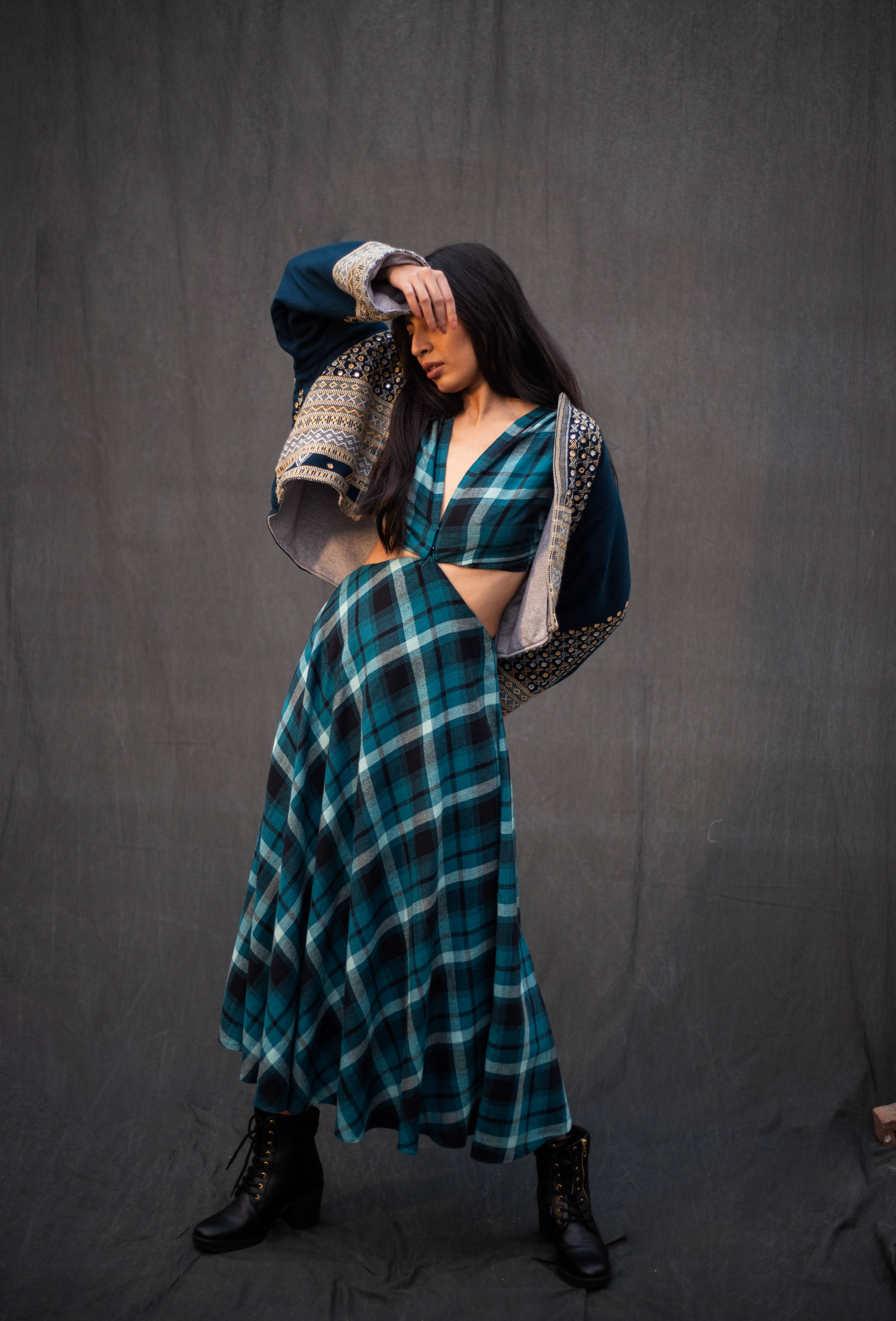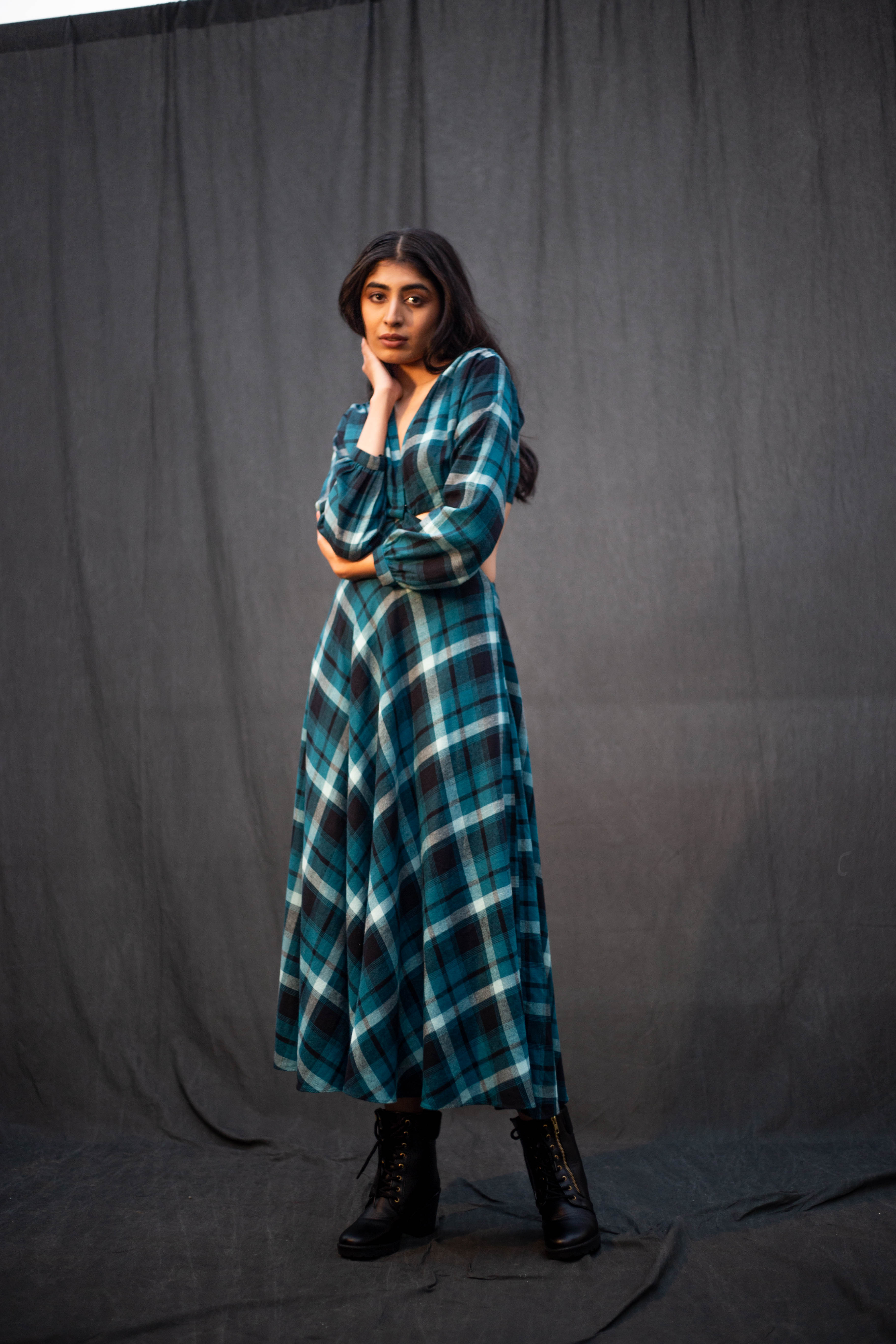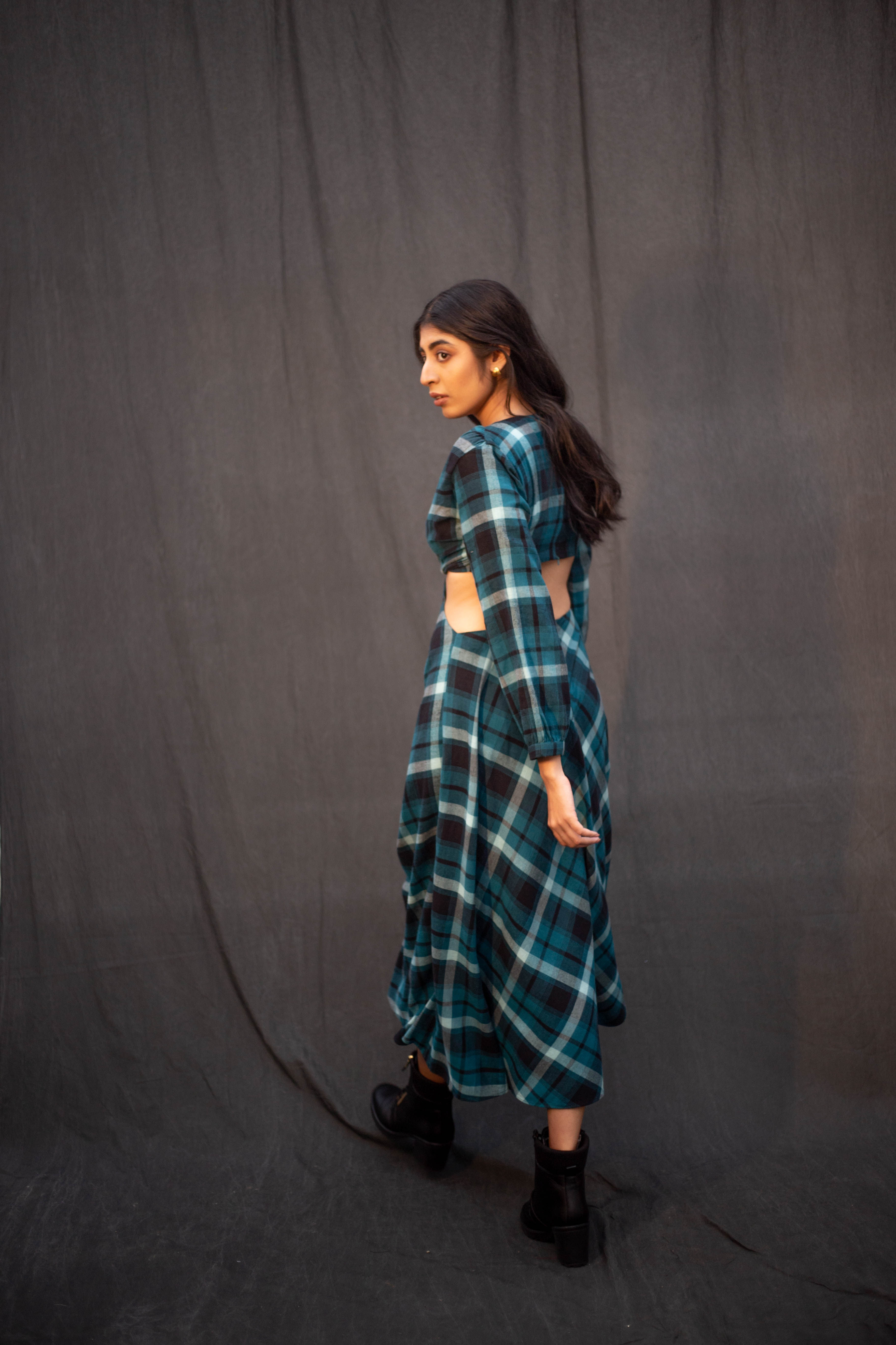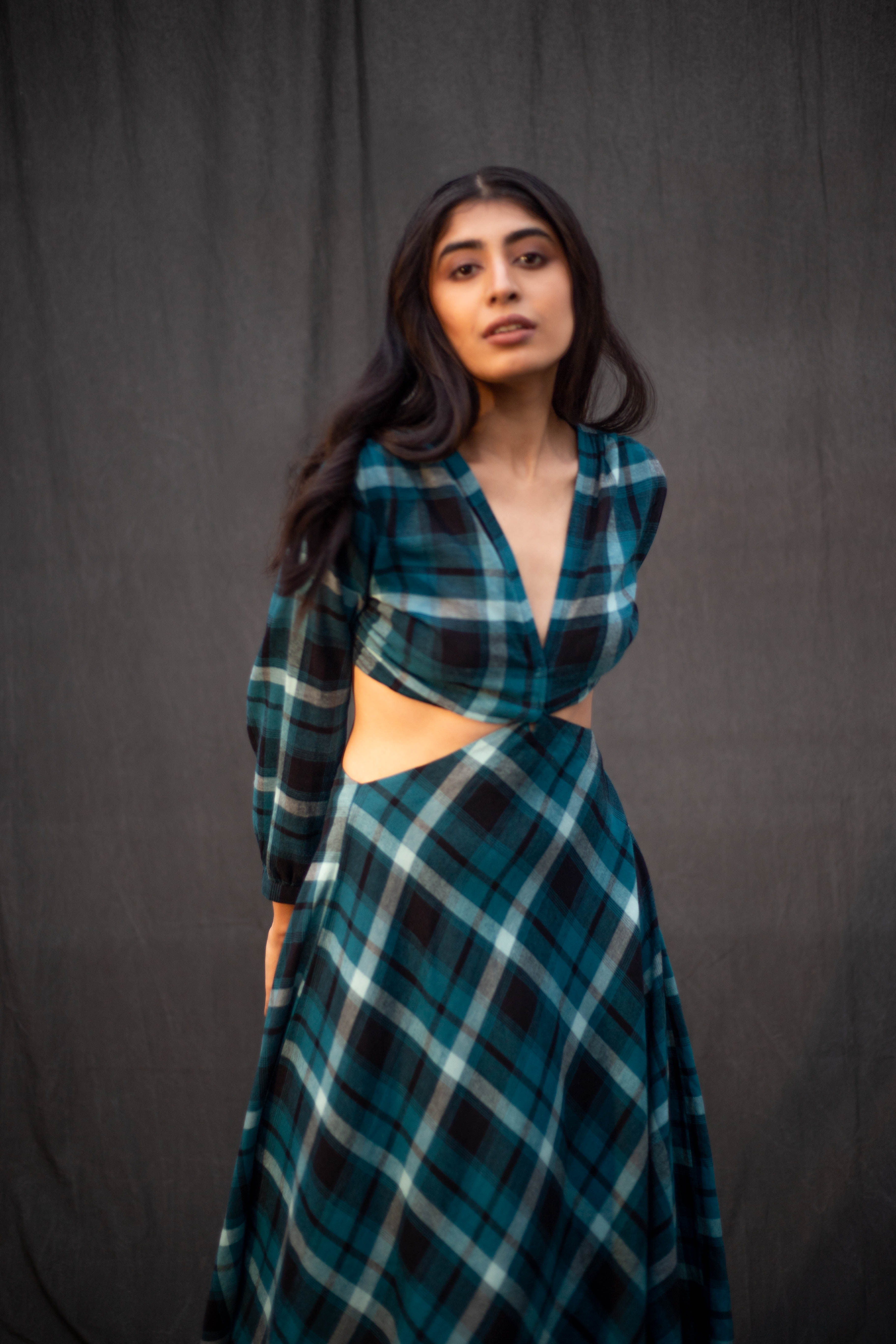 Swaroop Exclusive Design. Featuring check maxi dress in brushed cotton detailed with side cutouts. Enhanced with front-knot and v-neckline.