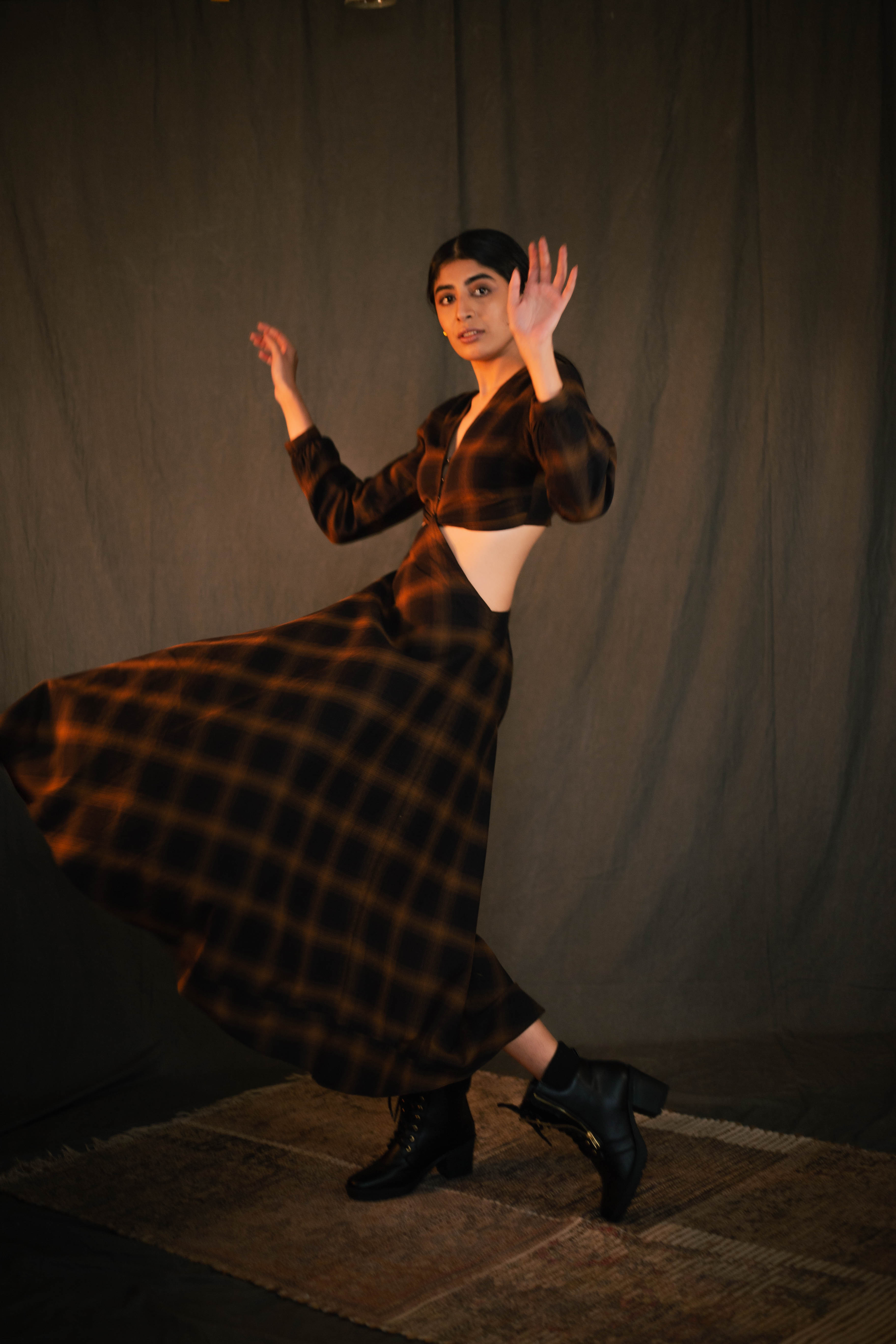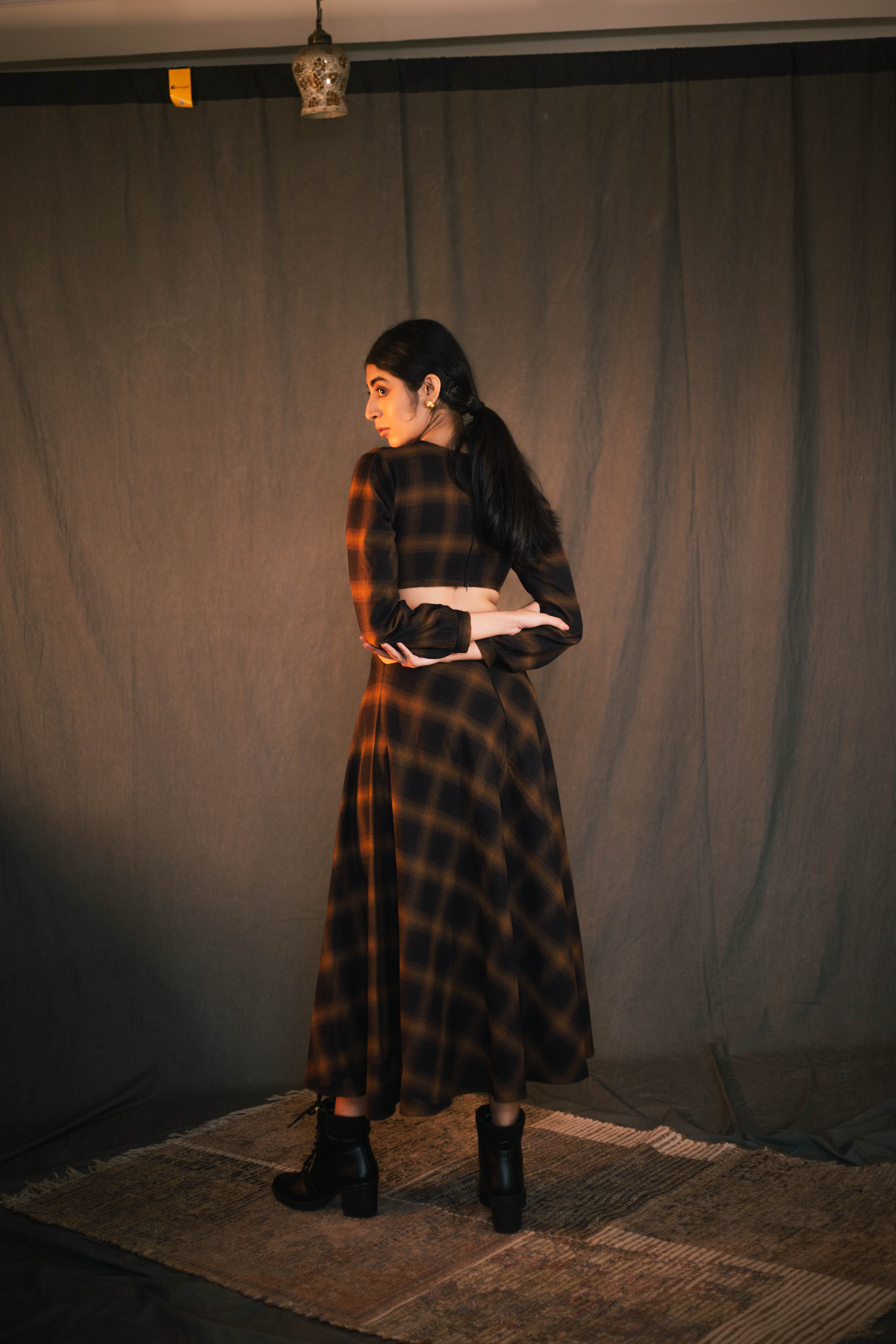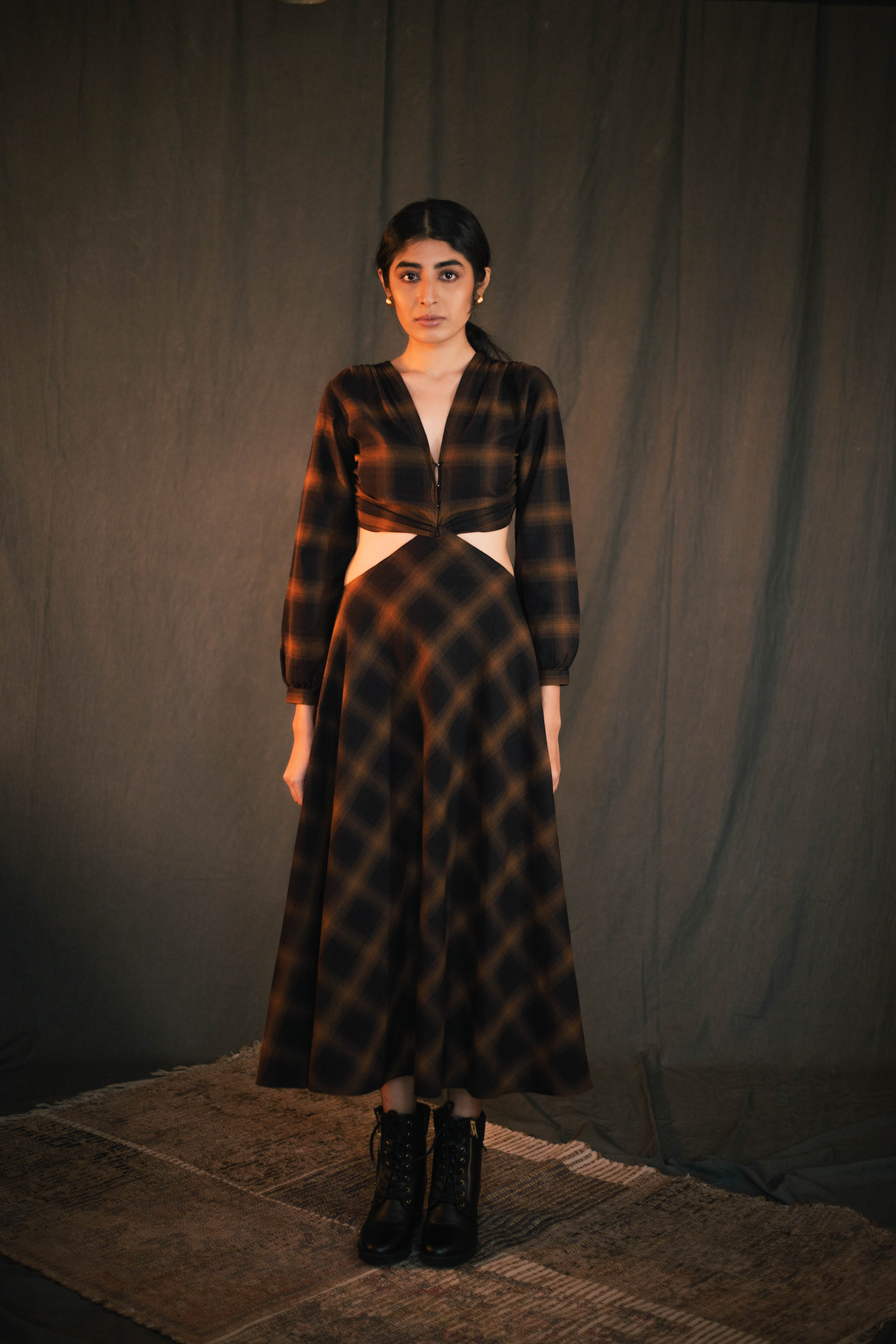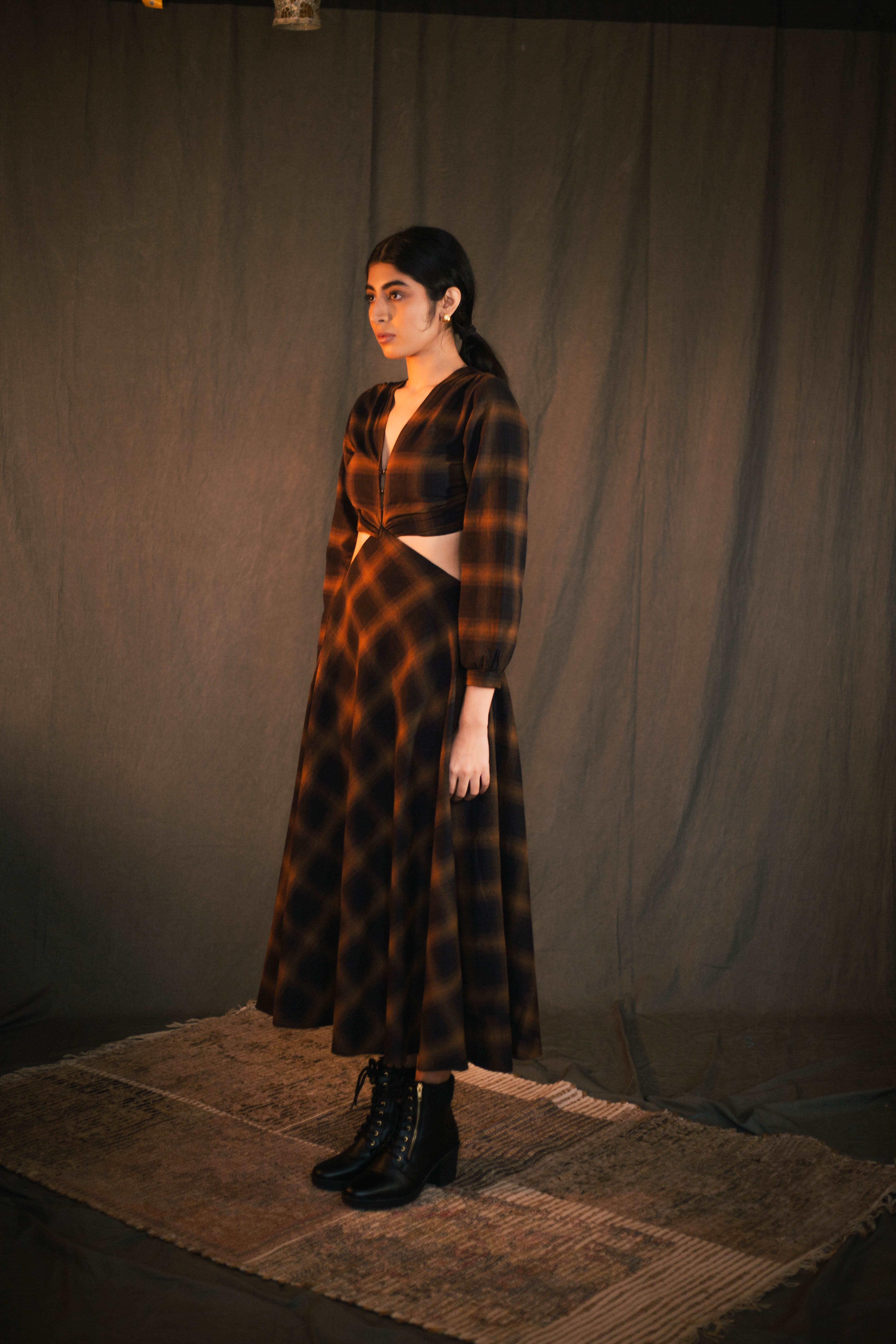 Swaroop Exclusive Design. Featuring check maxi dress in brushed cotton detailed with side cutouts. Enhanced with front-knot and v-neckline.