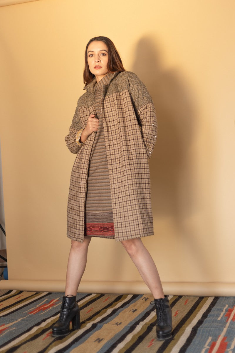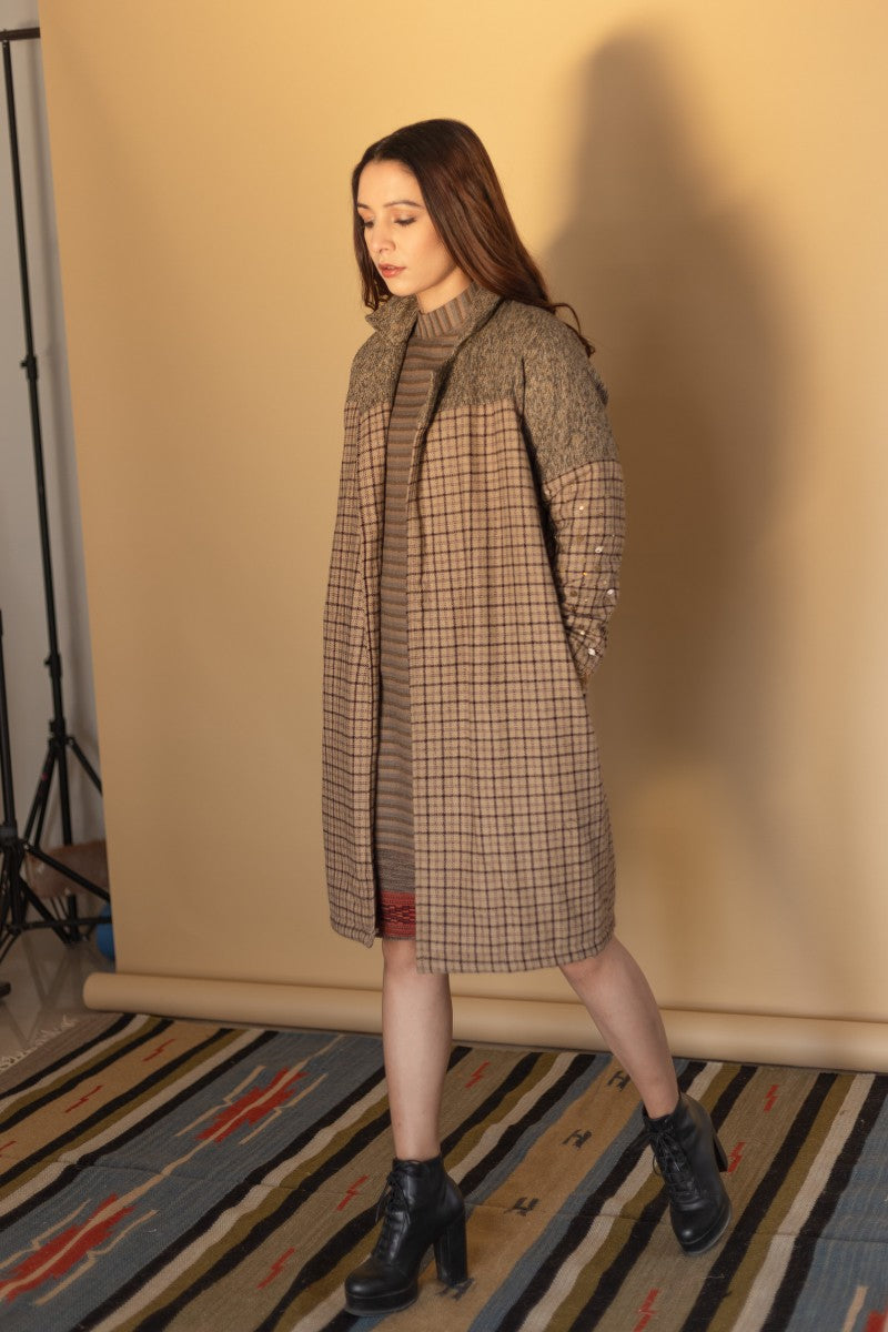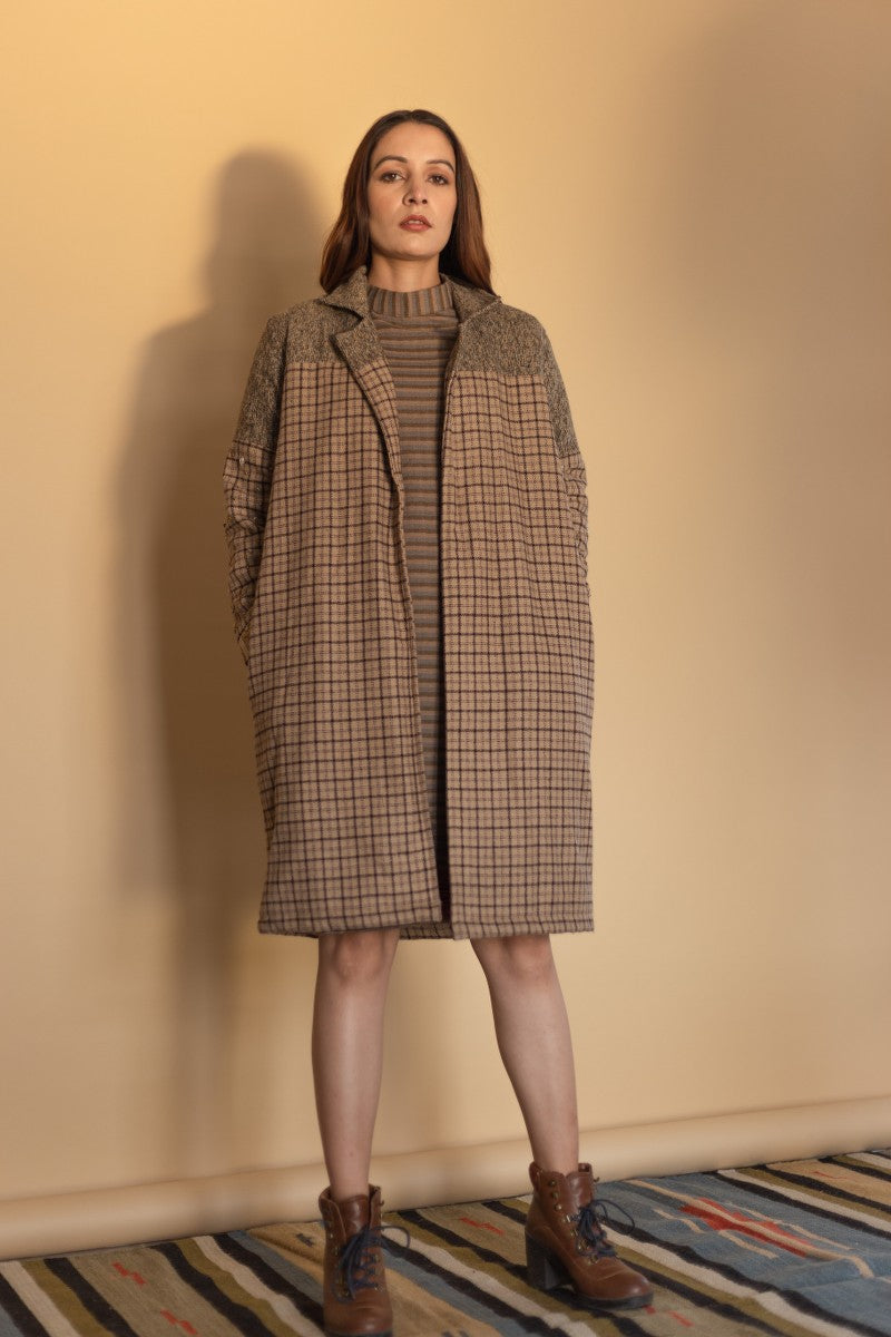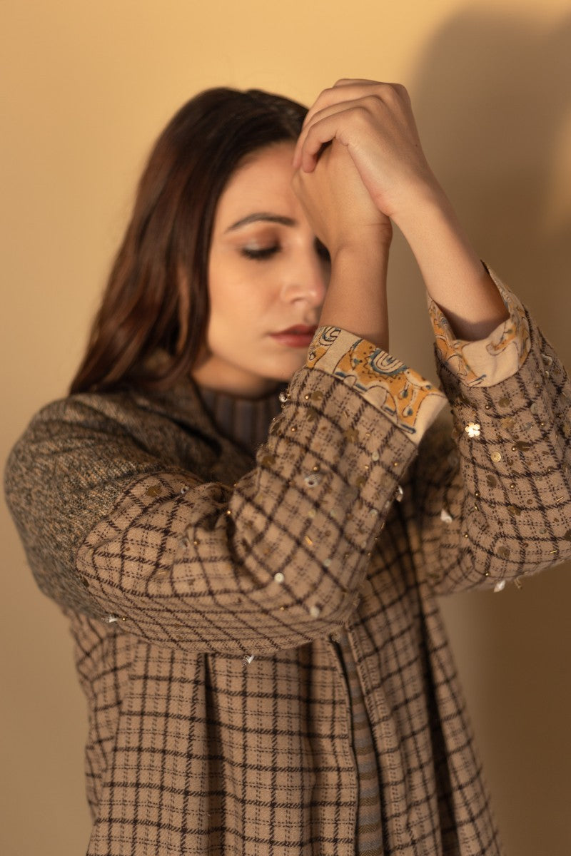 Swaroop Exclusive Design. The Kosha is a paneled check coat that reminds us about Indian textile through modern silhouettes. Embellished with sequence and shells on sleeves by our in-house karigar, Munim Ji using traditional aari work technique. The design is elevated by fleece lining which gives you warmth in winter chill.
