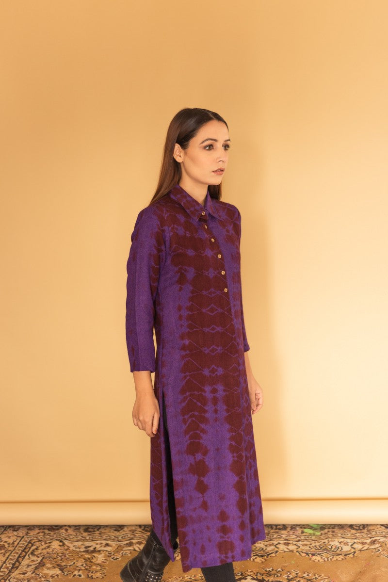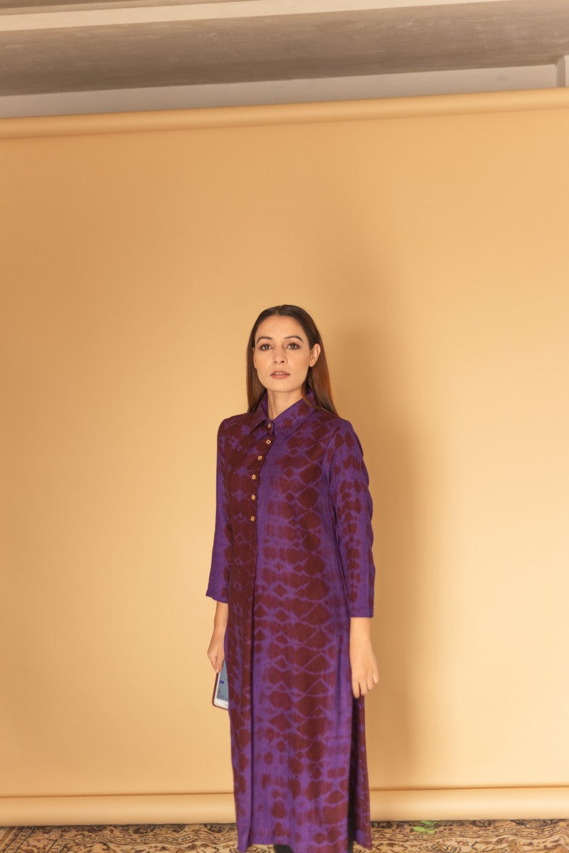 Swaroop Exclusive Design. The name is a classic kurta. The fabric is handwoven by the weavers of Kullu, Himachal Pradesh using traditional techniques passed down from generation to generation. The fabric is then tie and dyed and enhanced with some gorgeous trims at the front.