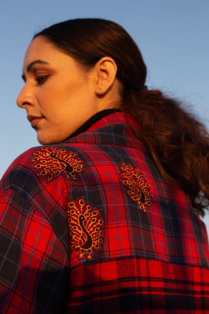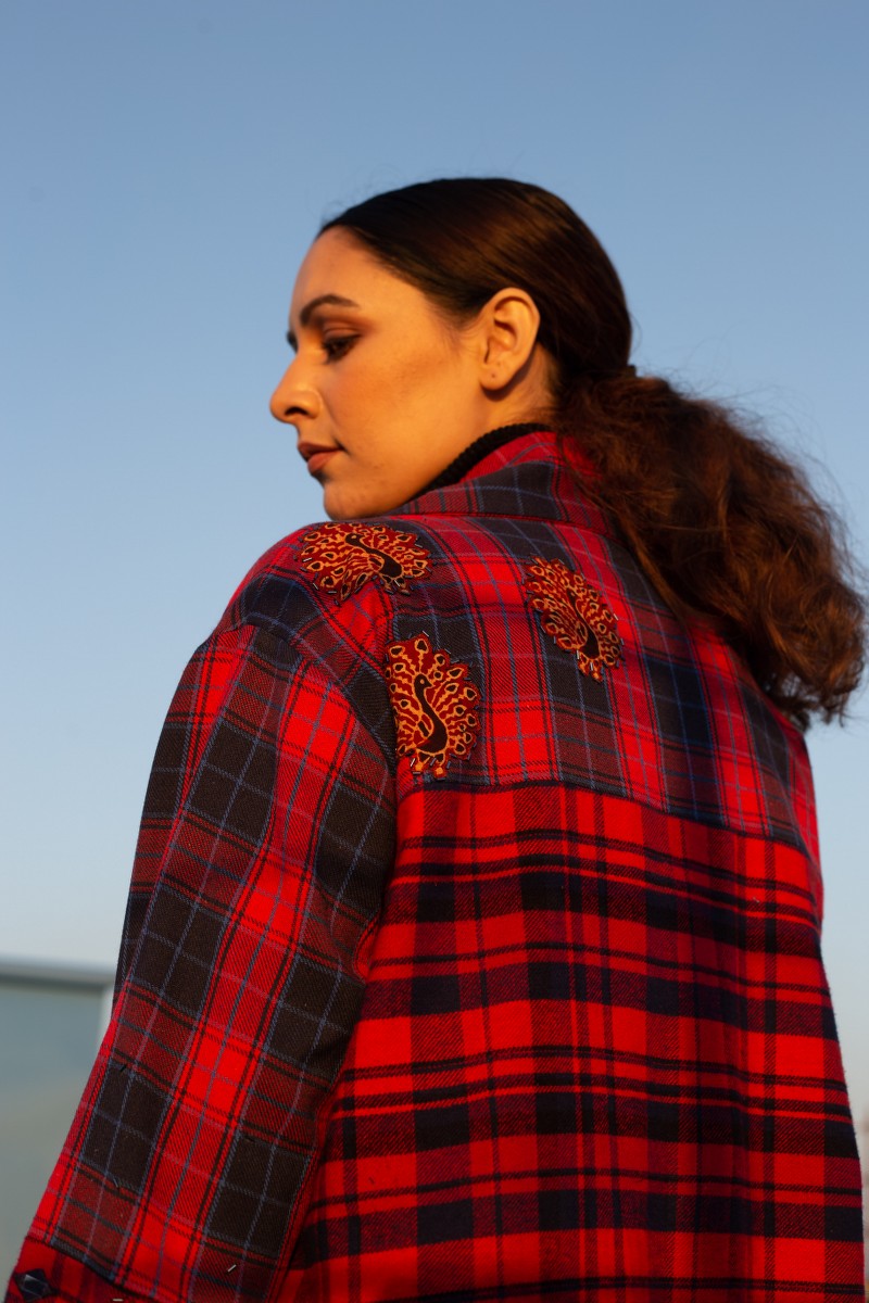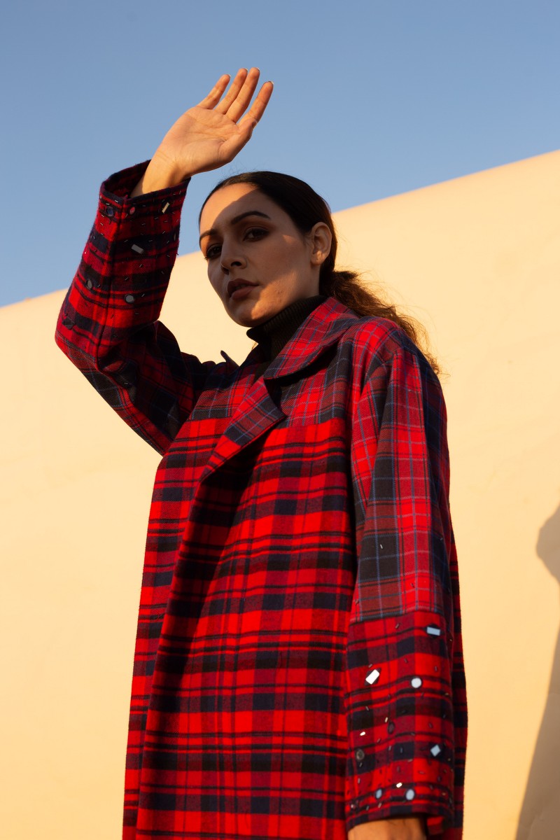 Swaroop Exclusive Design. The Oija is a marriage between Indian textile and modern silhouettes. The fabric of the coat is in brushed check which gives you warmth. Embellished with mirrors, sequin and pipe work using traditional Aari work techniques done by our in-house karigar, Munim Ji.
